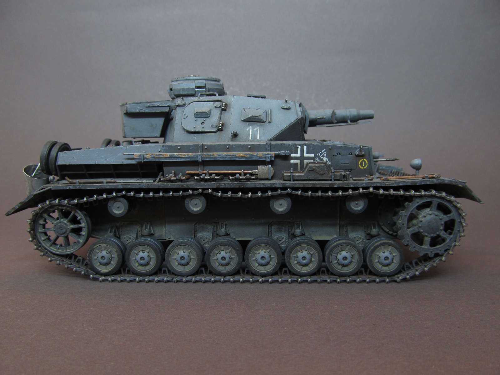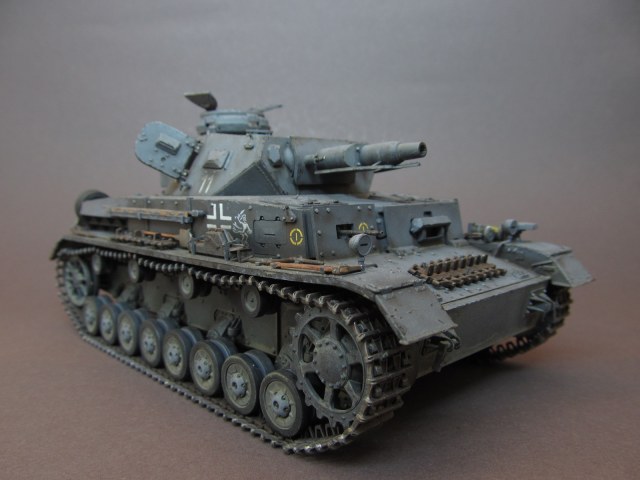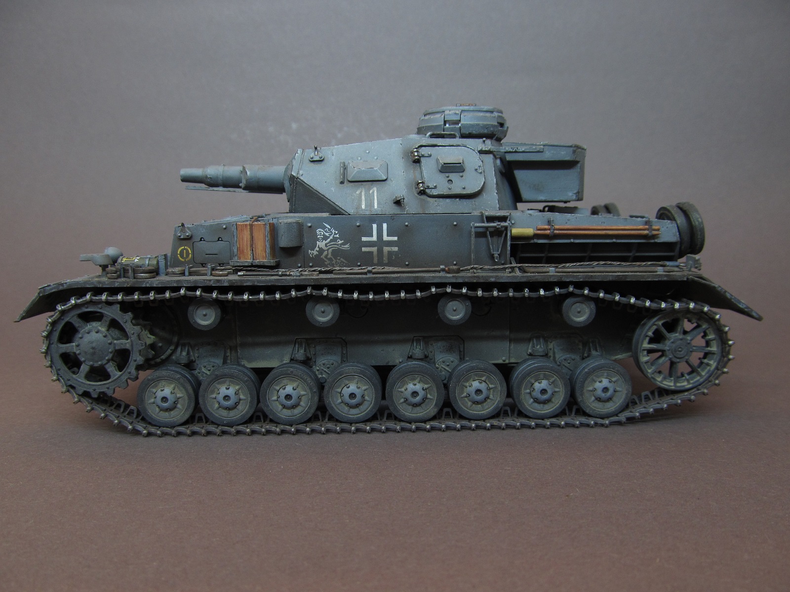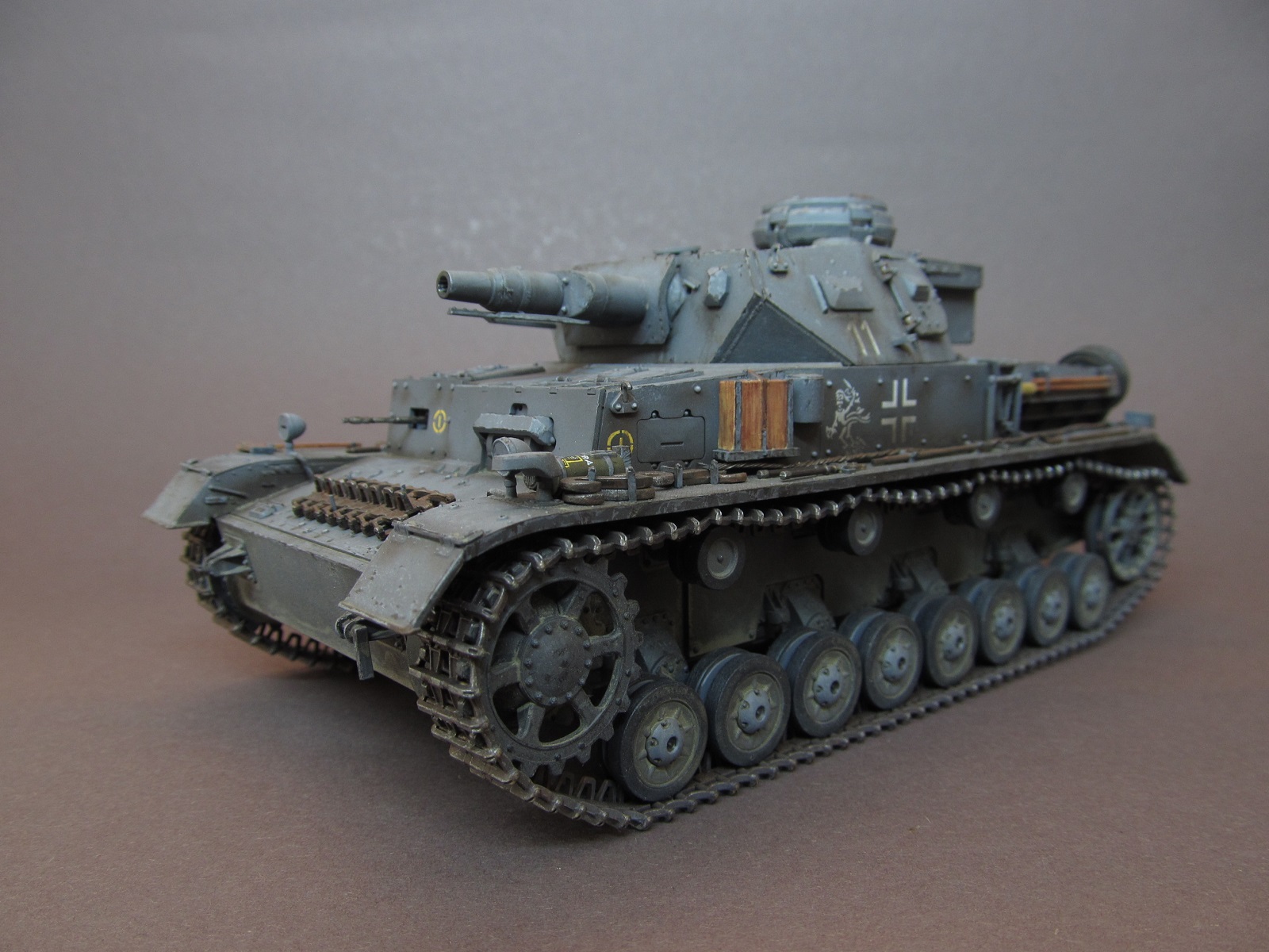 Окрашивал модель акриловыми красками от Rewel и Звезды. Т. к. решено было изобразить реально существовавшую машину из состава 11 ТД, в соответствии прототипу нарисовал тактические знаки, номера и эмблемы кистью. Машину изобразил бывалую, на момент лета 1941 года в боях на Украине, ранее прошедшую боевые операции на Балканах. Грязь и пыль имитировал смесью художественных соусов.