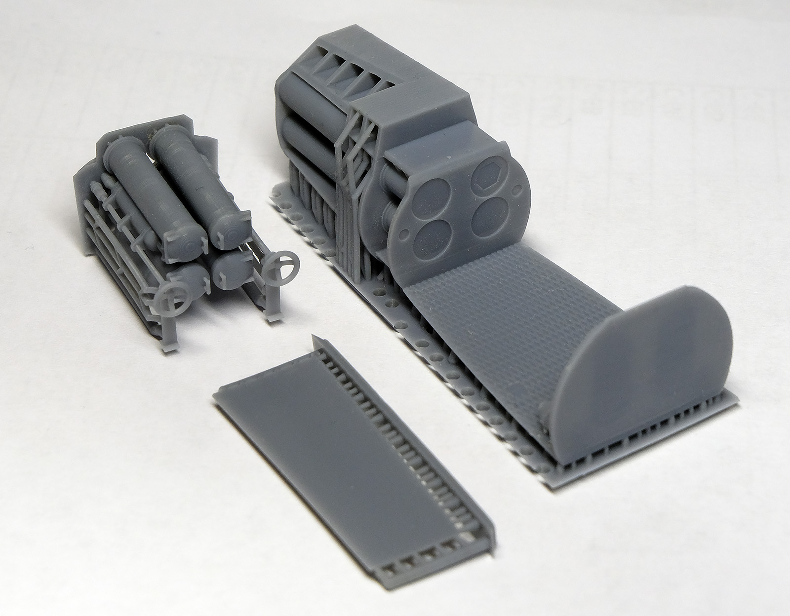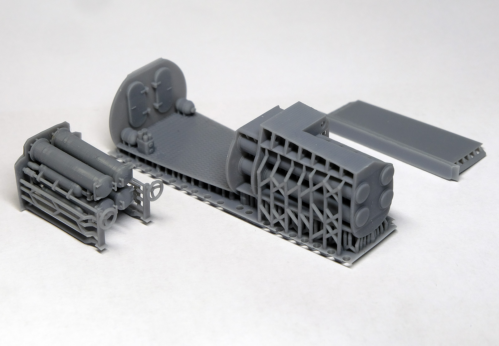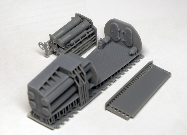 Набор сделан с помощью 3Д-печати на принтере. В комплект входит пулемет ДШК, 2 гребных винта, пеленгатор, ограждение носовой артиллерийской площадки, ограждение кормовой артиллерийской площадки для Щ-215 и декаль.