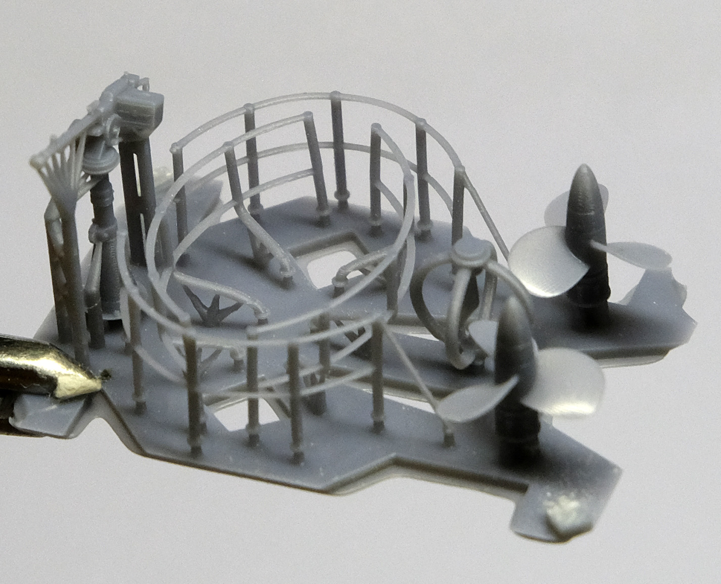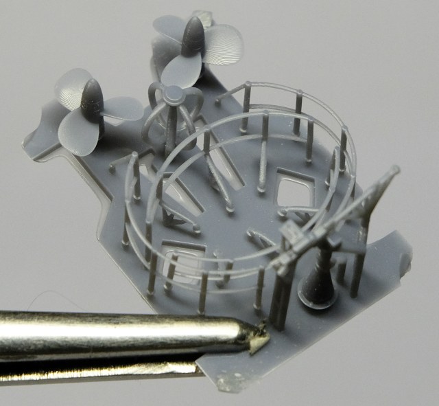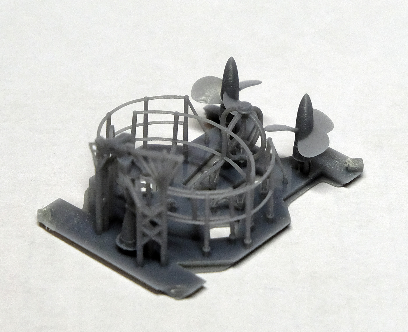 Сразу бросается в глаза более правильная форма гребных винтов лодки, которые если и не совпадают с формой винта Щ-211, поднятого со дна, то хотя бы похожи на реальный винт больше, чем Звезда. Но при рассмотрении на макросьемке видны ступеньки от печати на лопастях винтов. Так как лопасти очень тонкие, сложно сказать, насколько просто будет убрать это последствие печати.