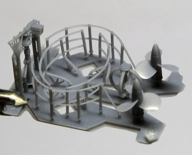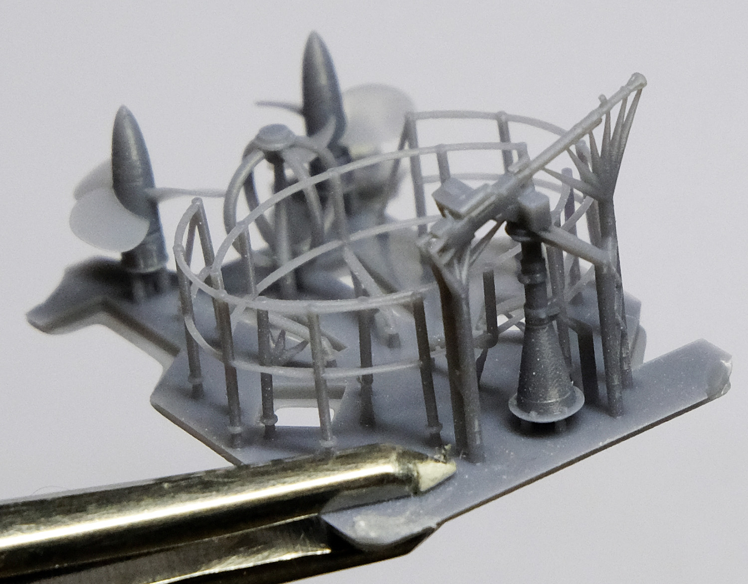 А теперь к ограждениям. Ограждение носовой артиллерийской платформы сделано вроде бы и верно. Но вот толщина печати горизонтальных цепочек ограждения слишком большая, отчего они кажутся монолитными как цельнометаллический рейлинг. Но ничего не мешает всем желающим срезать эту «дубовую» имитацию горизонтальных цепочек и заменить их на нити или плетеную проволоку для имитации цепочки. Будет и масштабнее, и фактурнее, а главное с провисом.