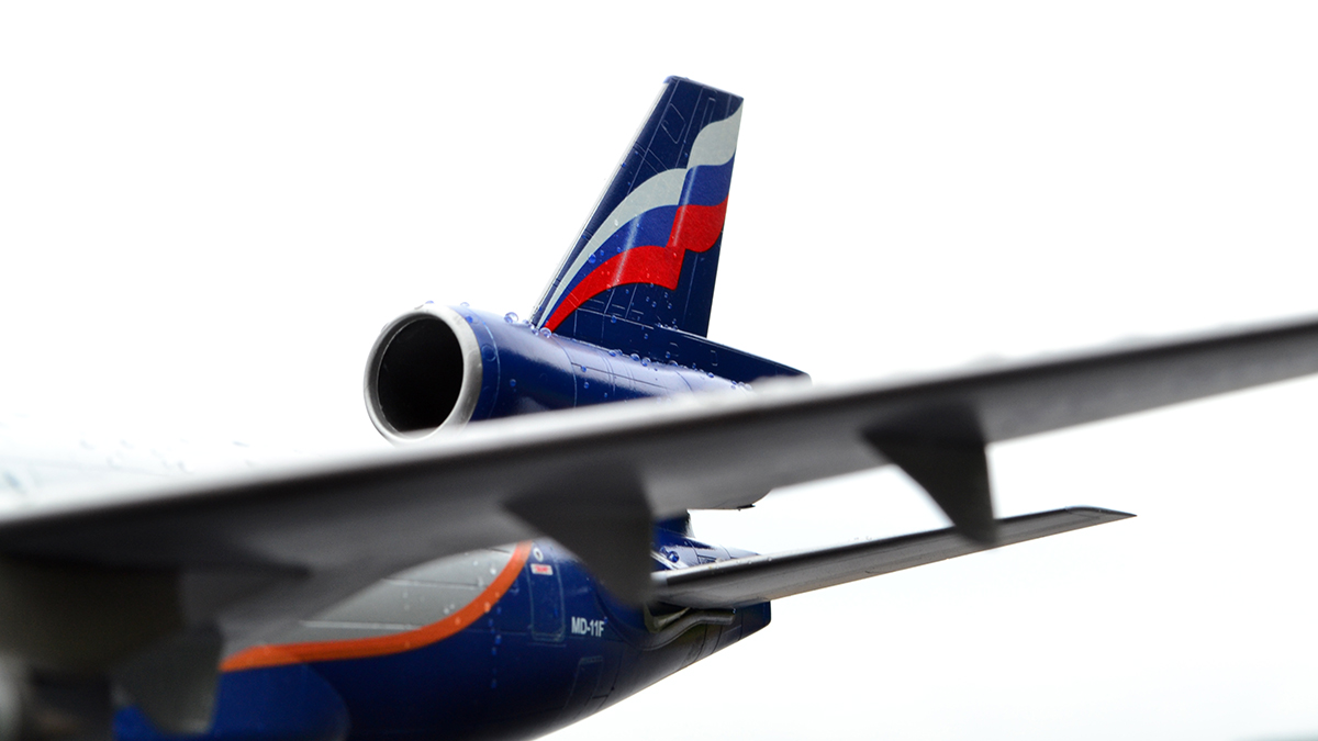 Окрасил ливрею Аэрофлота, как в старые добрые времена: верх - матовый алюминий, низ - Х-4, а сверху закрыл всё это добро толстым слоем глянцевого нитролака TS-13 прямо из баллончика. Совсем немного попачкал плоскости смывками от Тамии.