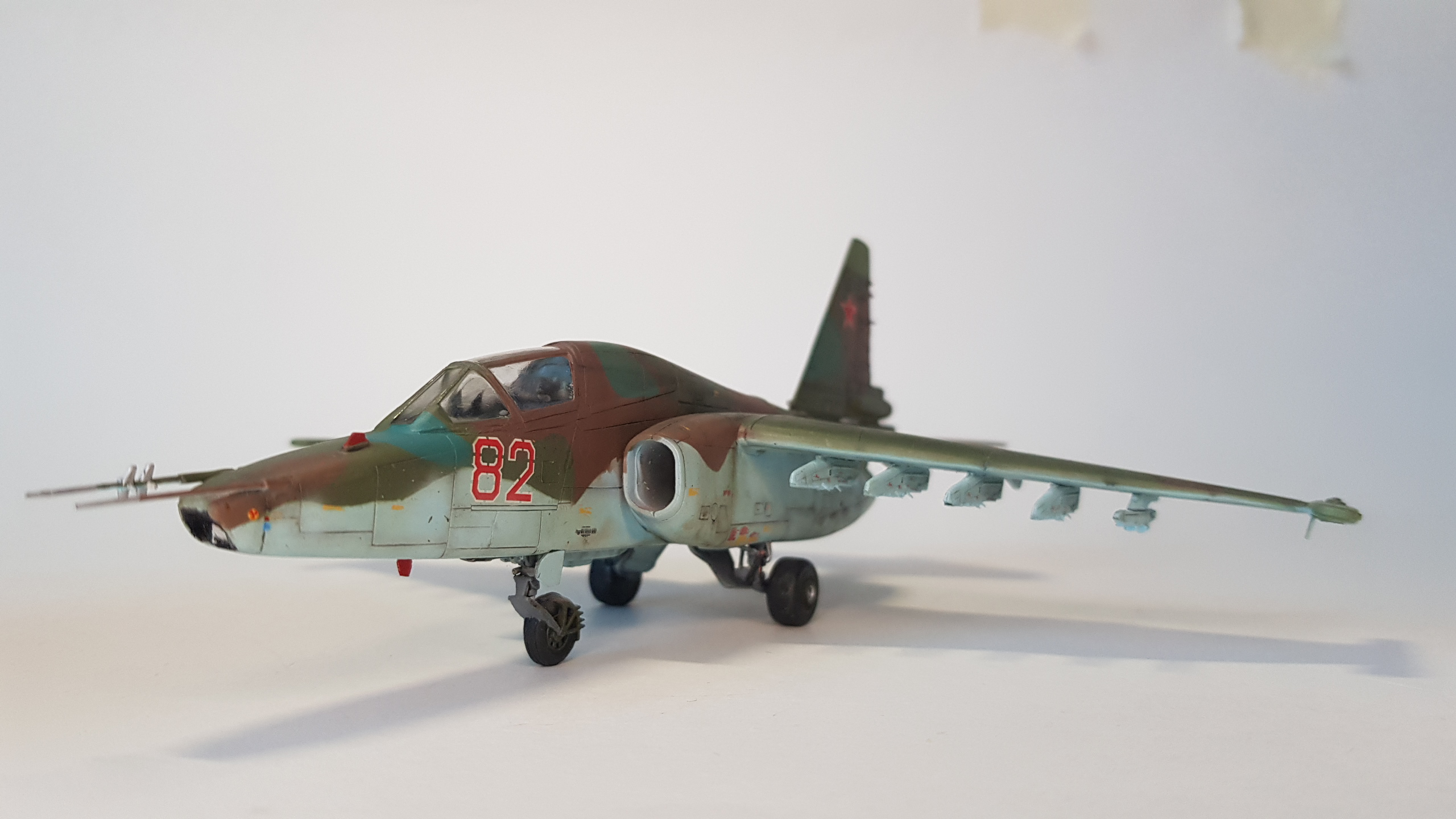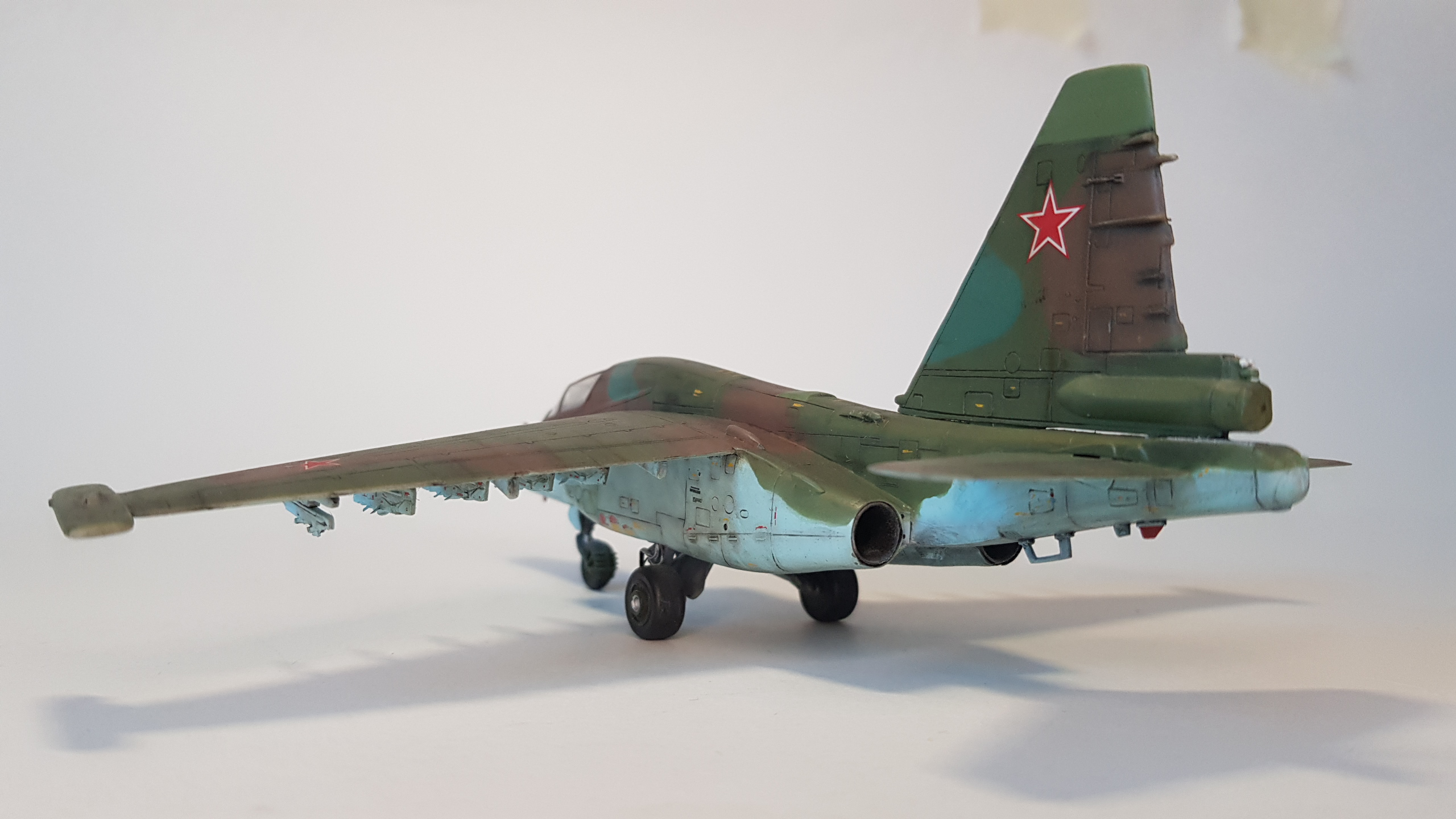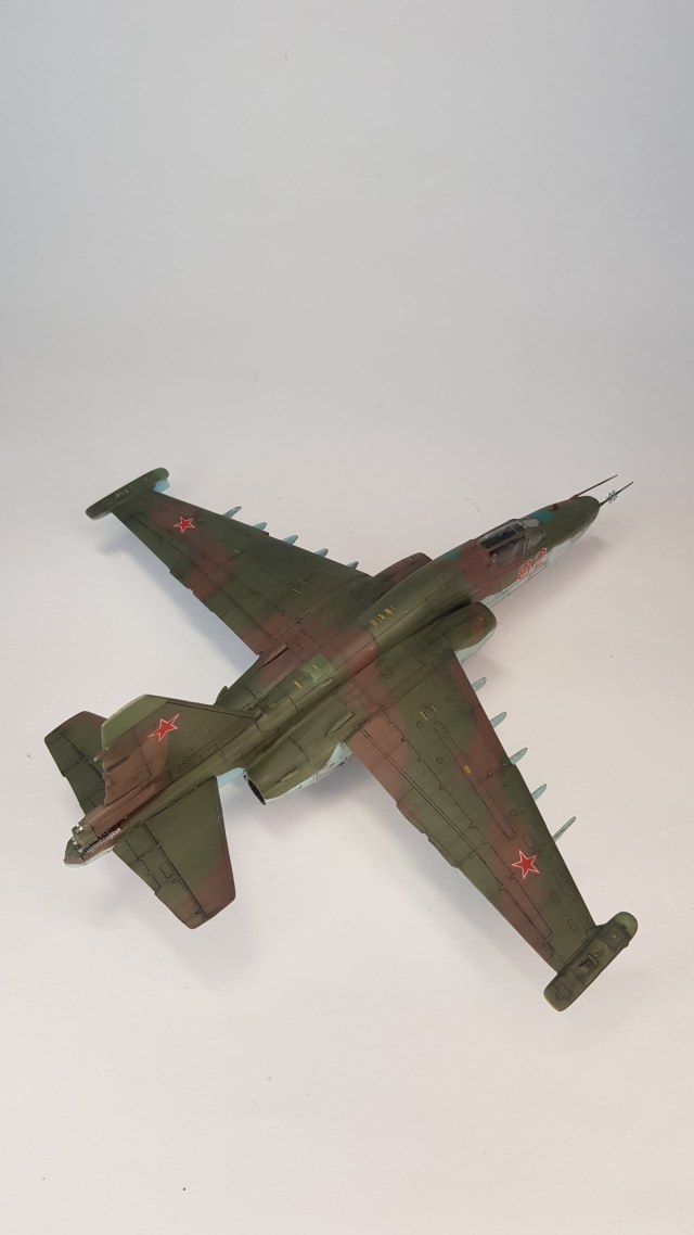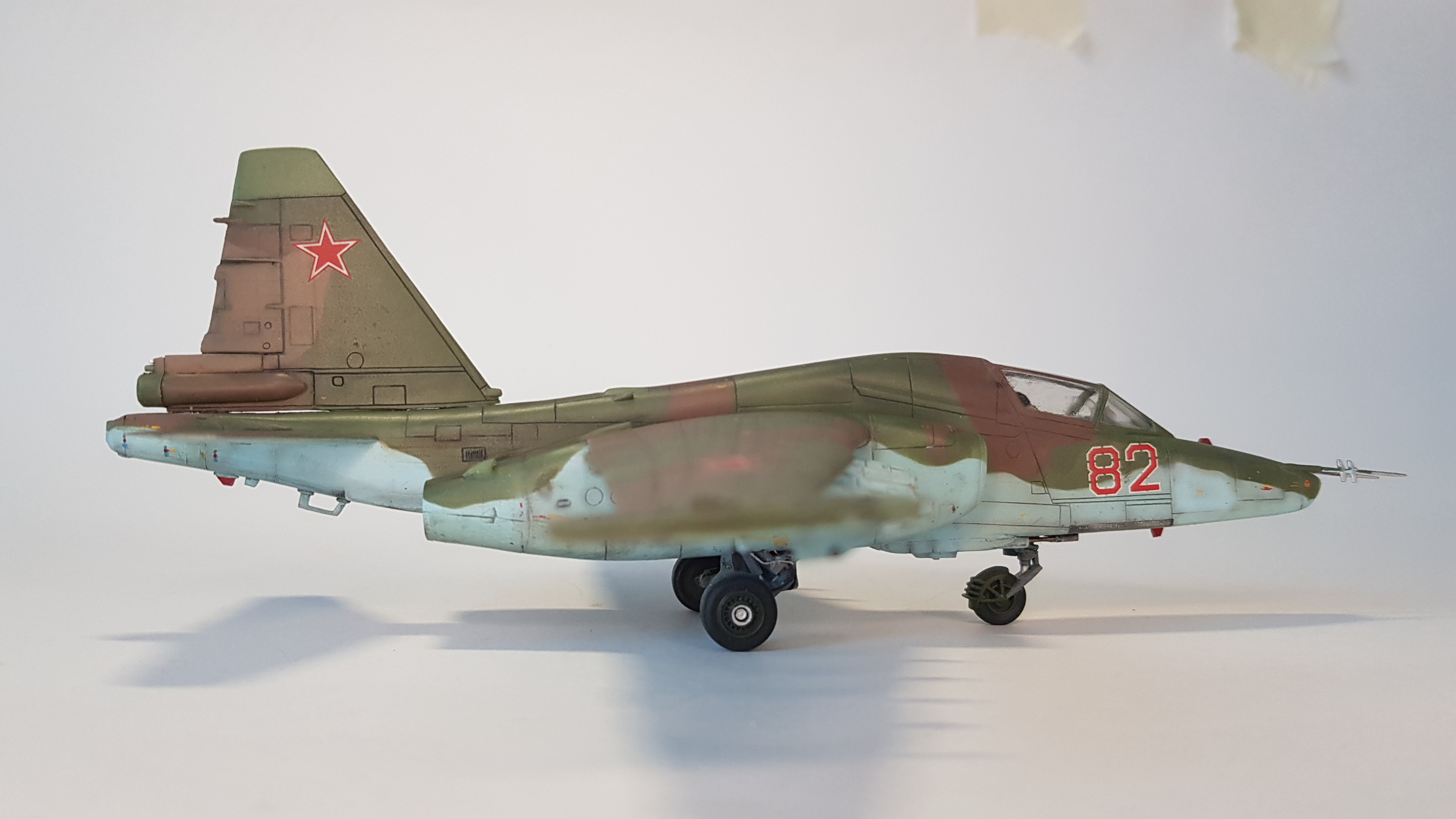 Все бы ничего, но щель в основании киля... По матчасти несколько замечаний. В выбранном варианте окраски - это Су-25Т. По камуфляжу - что за чужеродные пятна ядовидо-зеленого цвета по левому борту? Бортовой номер 82 не родной, нанесен в 4 ЦБП и ПЛС в Липецке на пятно, которым был закрашен первоначальный (с з-да с-ты получили номера 1-ого и 2-ого десятков). Не воспроизведен сопловой аппарат дв-ля Р-195 с характерным центральным телом со стекателем и доп. в/з охлаждения снизу мотогондол; нет обтекателей антенн системы РЭБ "Иртыш" на гондолах тормозных щитков; на контейнере "Сухогруза" в основании киля нет кассет устр-ва выброса помех УВ-26; на киле антеннок не хватает (в ч. "рогатины" АФС "Пион"