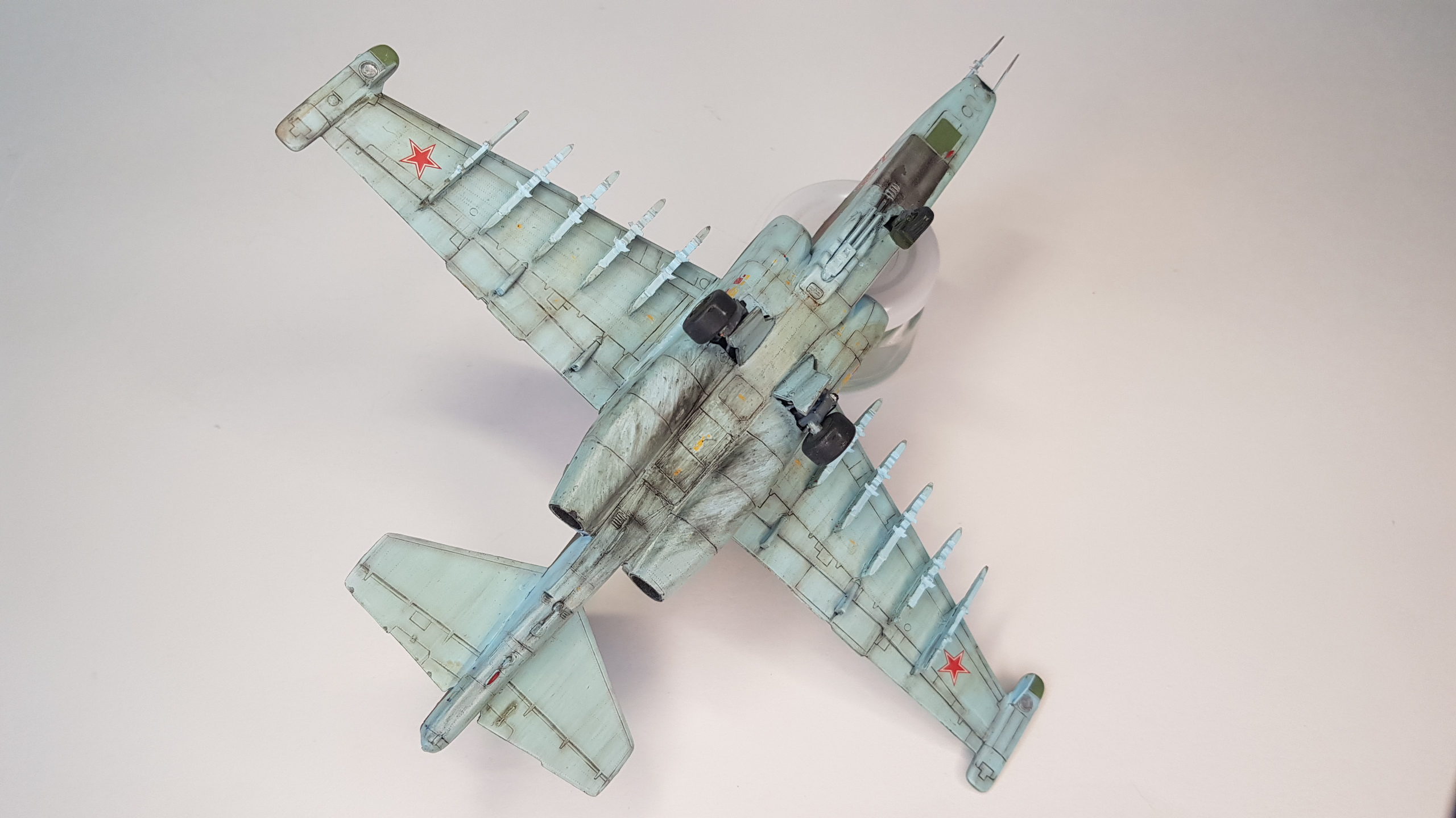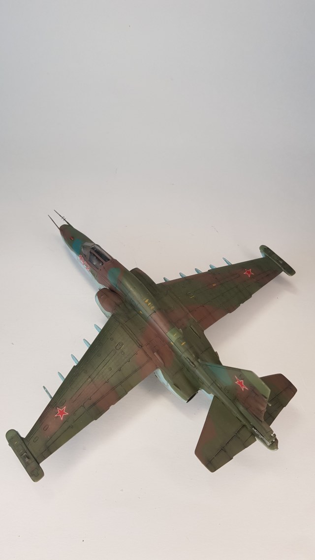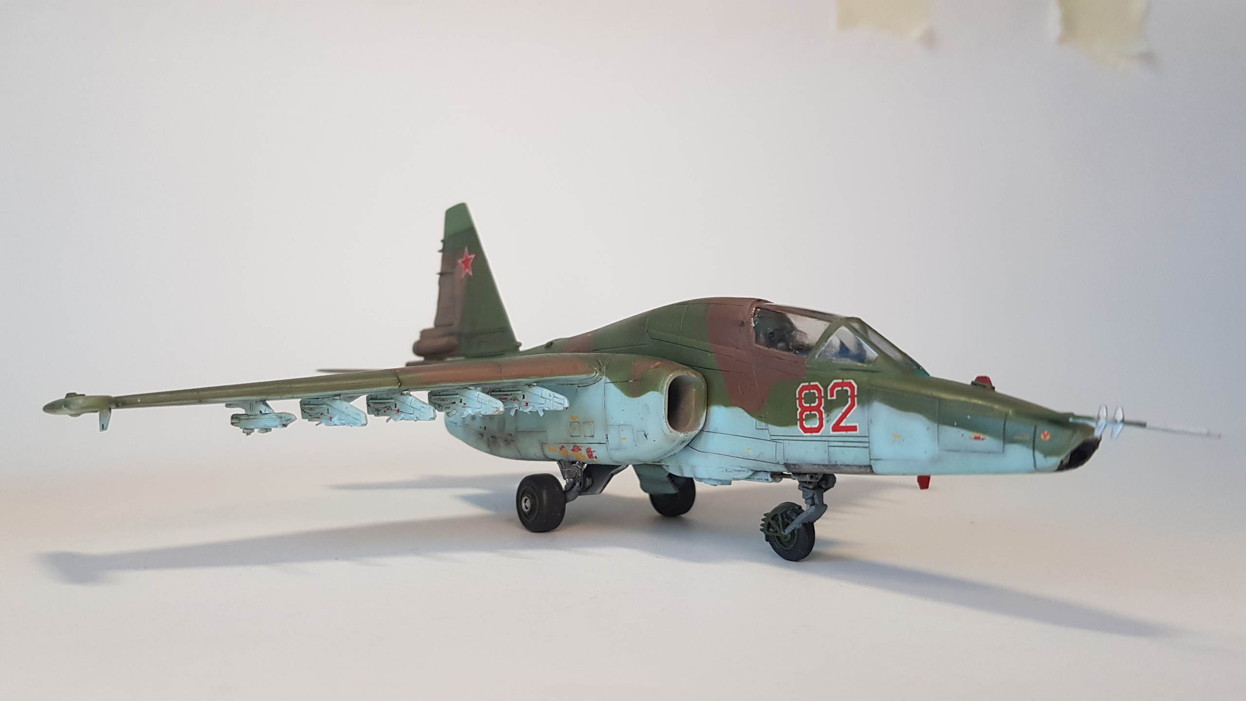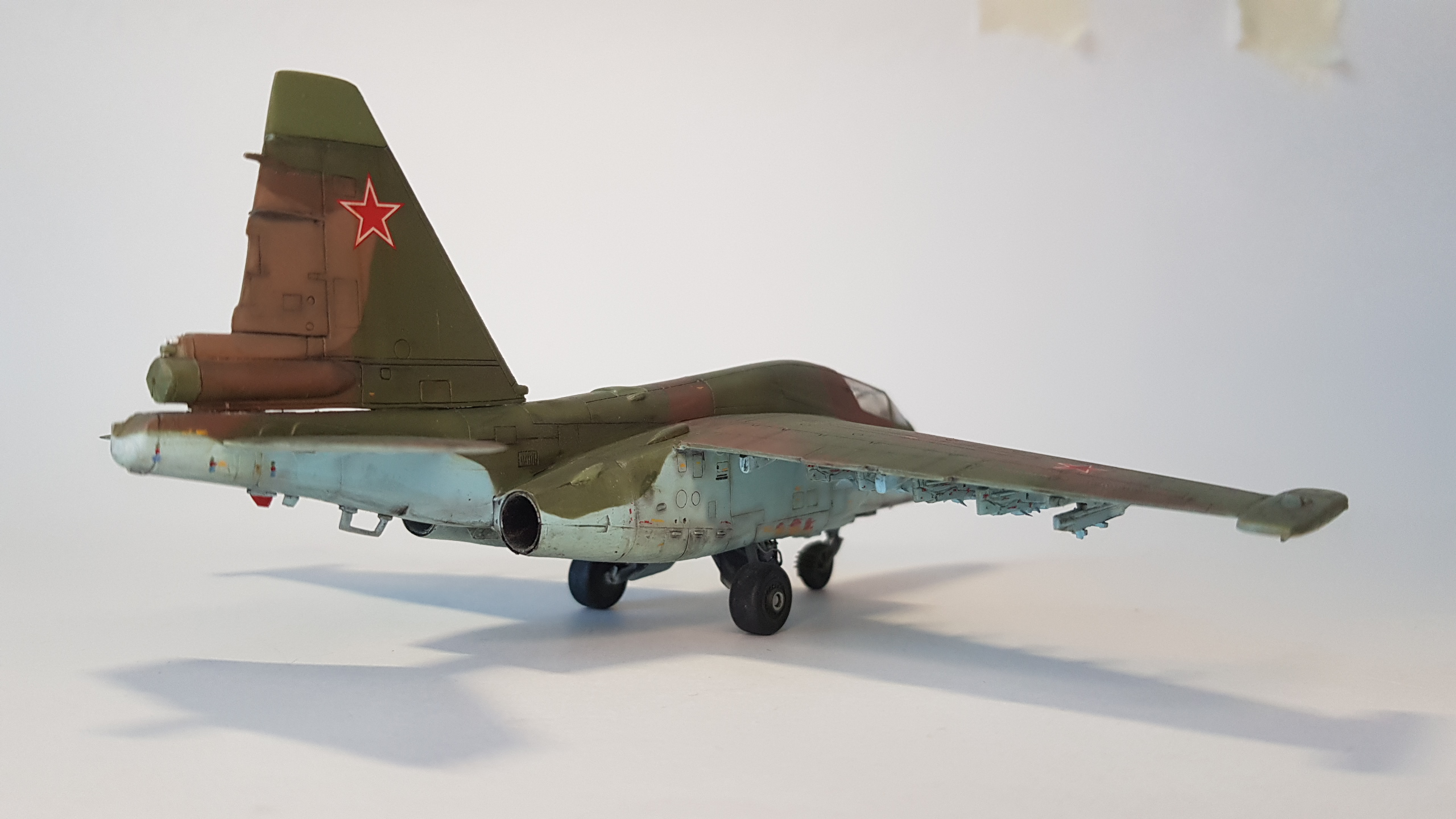 Все бы ничего, но щель в основании киля... По матчасти несколько замечаний. В выбранном варианте окраски - это Су-25Т. По камуфляжу - что за чужеродные пятна ядовидо-зеленого цвета по левому борту? Бортовой номер 82 не родной, нанесен в 4 ЦБП и ПЛС в Липецке на пятно, которым был закрашен первоначальный (с з-да с-ты получили номера 1-ого и 2-ого десятков). Не воспроизведен сопловой аппарат дв-ля Р-195 с характерным центральным телом со стекателем и доп. в/з охлаждения снизу мотогондол; нет обтекателей антенн системы РЭБ "Иртыш" на гондолах тормозных щитков; на контейнере "Сухогруза" в основании киля нет кассет устр-ва выброса помех УВ-26; на киле антеннок не хватает (в ч. "рогатины" АФС "Пион"