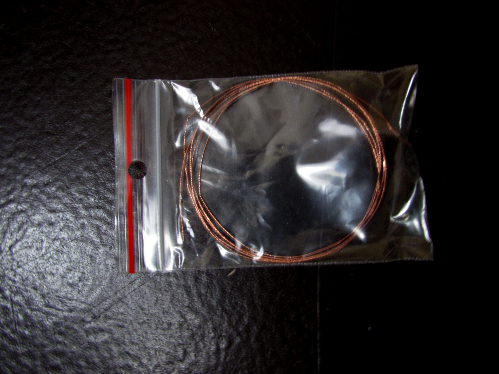 Упакован в красивую коробочку из неплотного пластика. Внутри пакетик со 100 см проволоки.