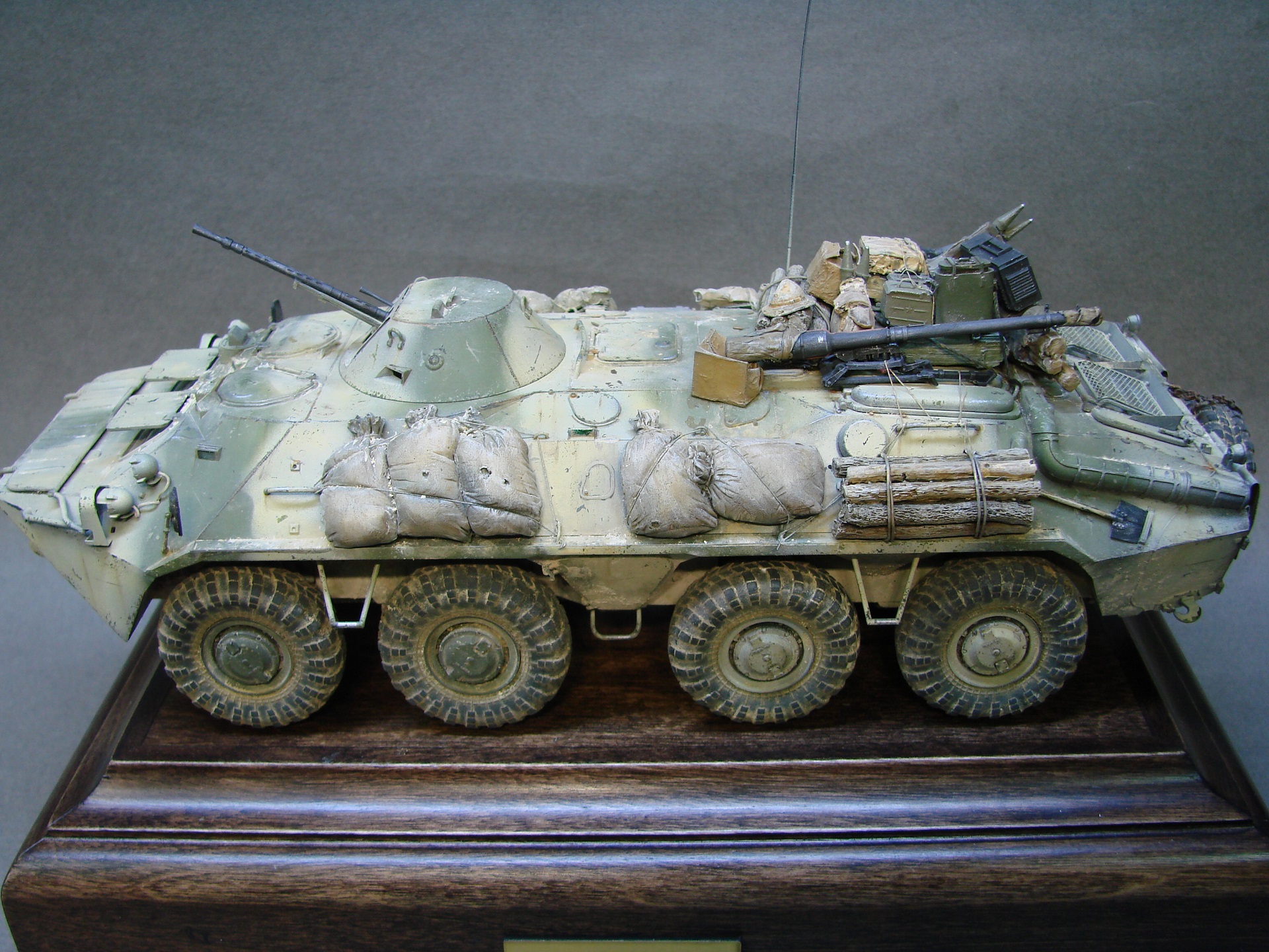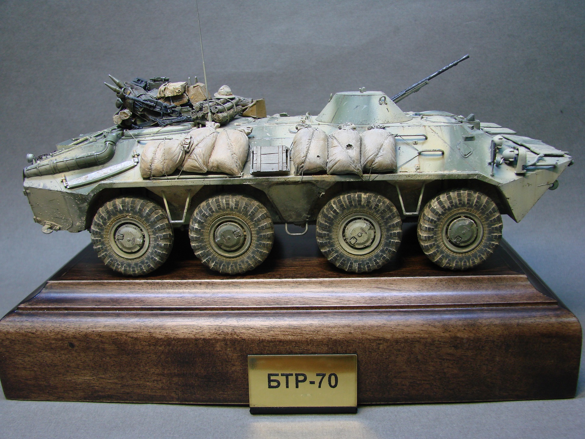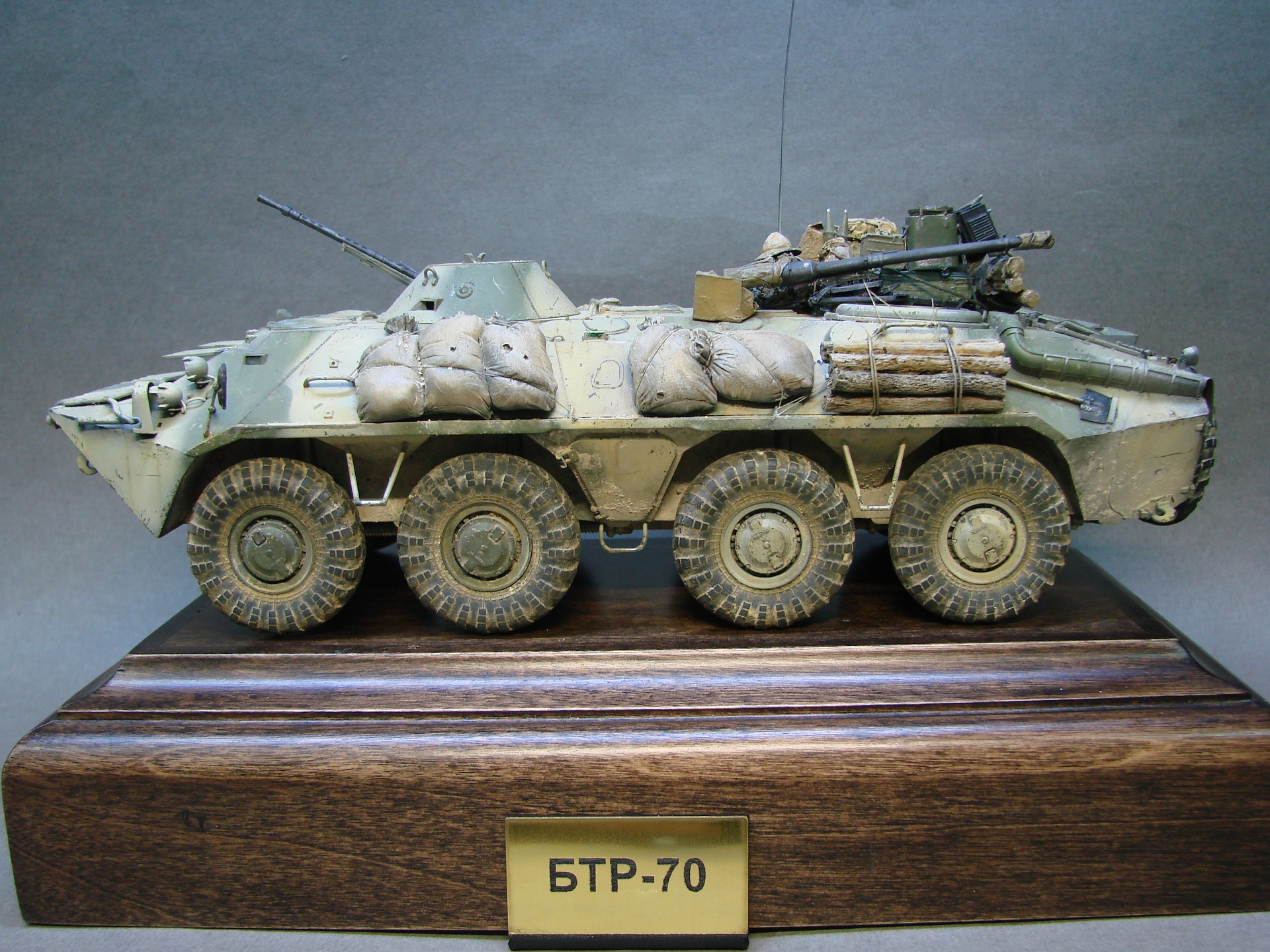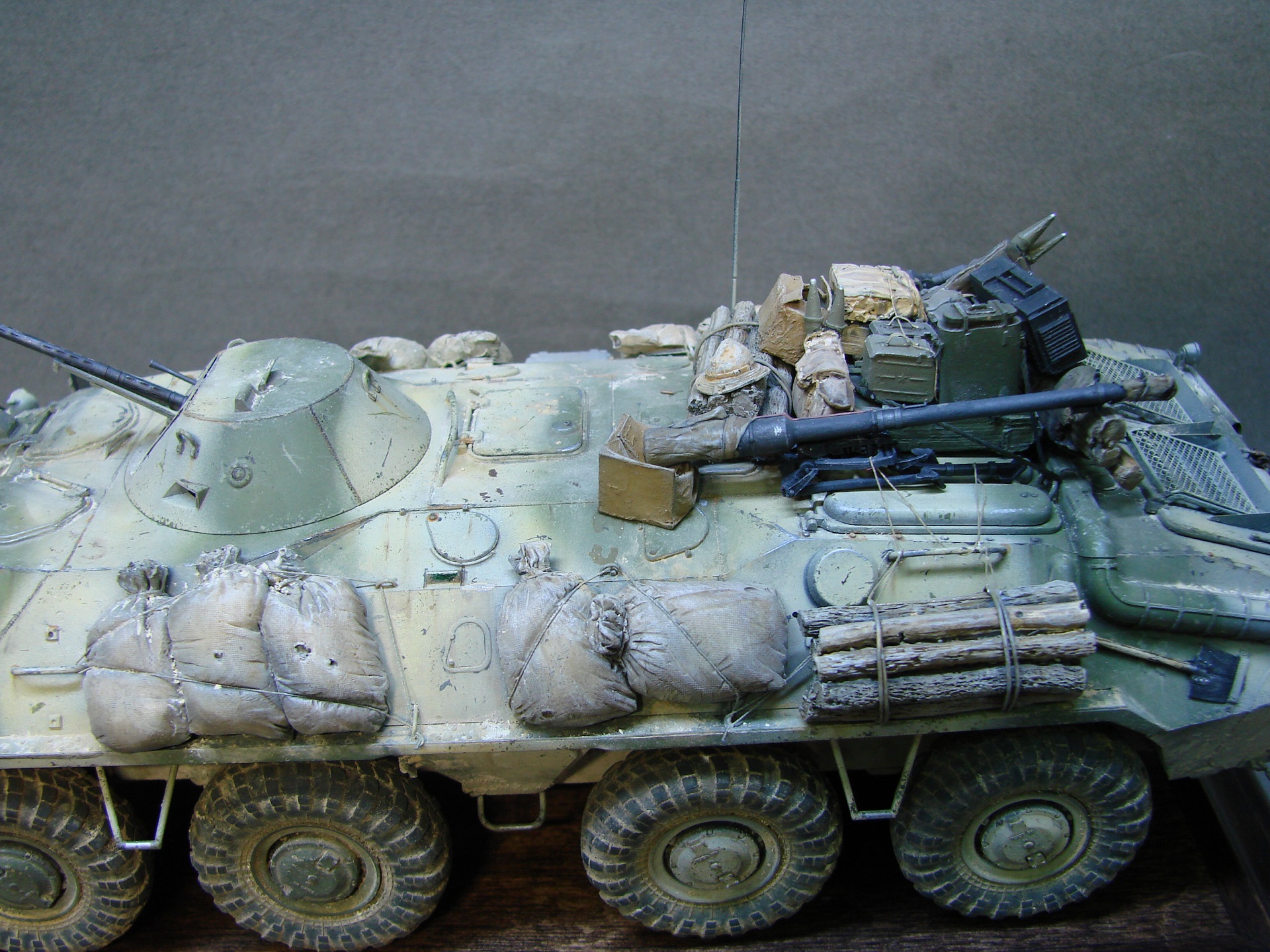 Доброго времени суток! Закончил с моделью БТР-70 от трубача. Решил сделать на тематику Афганистана(модель не имеет привязок) из дополнений вышло по минимуму,замены были оба ствола и антенный ввод, мелочевка на броне собрана была из излишек закромов,не раз слышал что в Афгане была большая потребность в дровах,решил как раз таки пучки с древесиной закинуть так же на броню. На заднюю часть повесил колесо,их вешали для того что бы та техника которая шла позади , упиралась и толкала перед собой заглохшую или выведенную из строя машину,как правило это случалось на высоких подъемах(серпантинах) глохли как правило карбюраторные БТРы