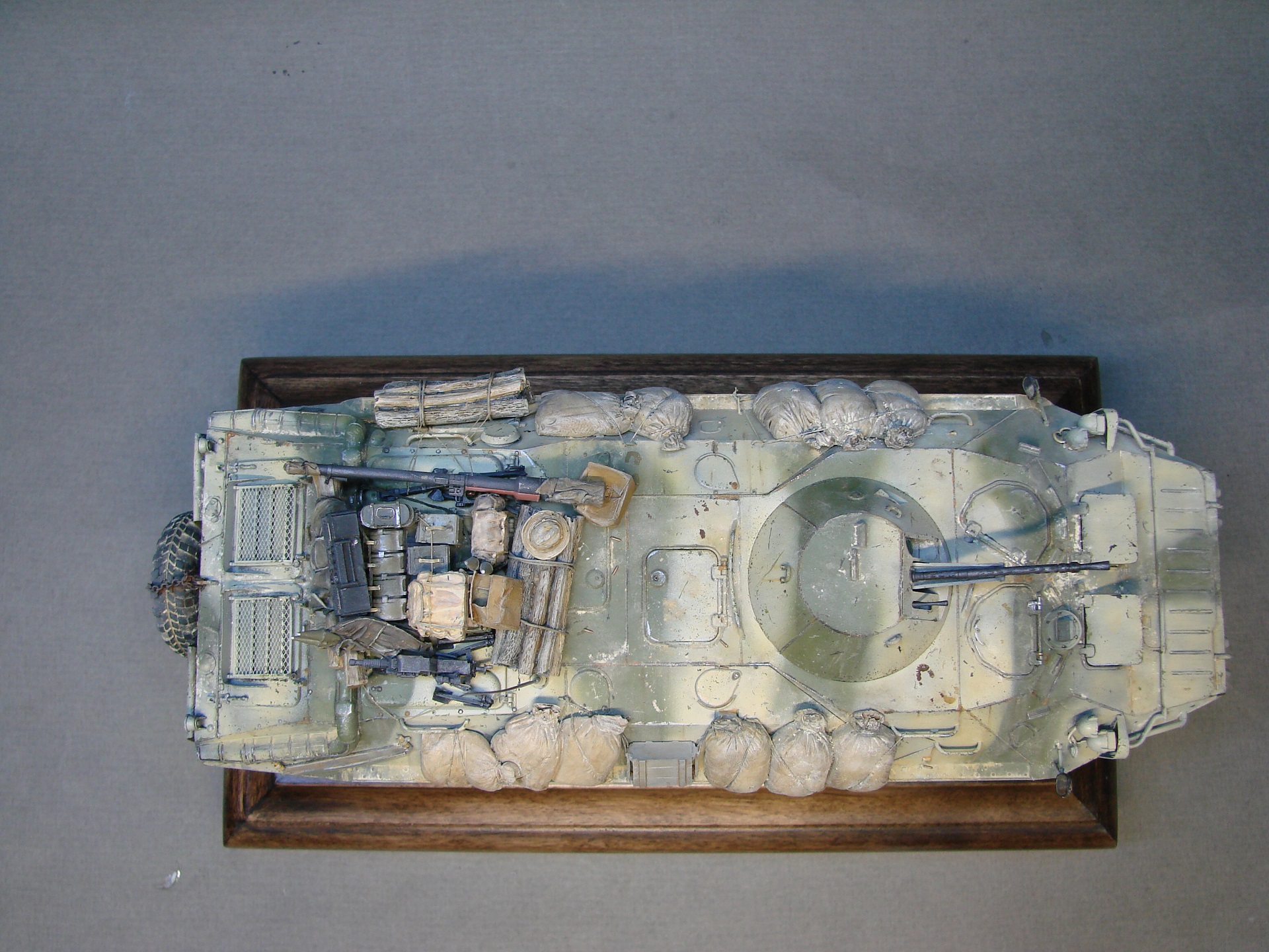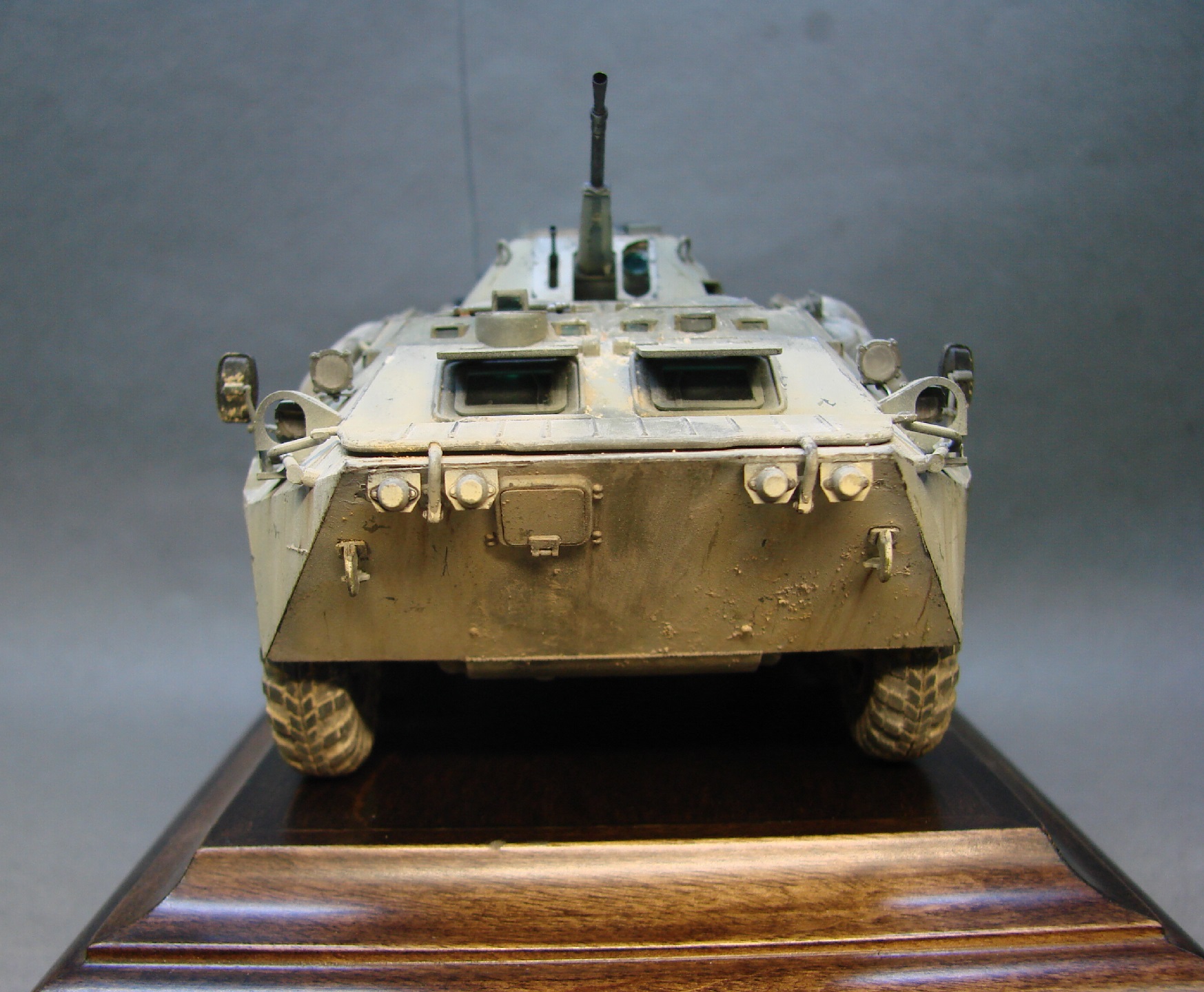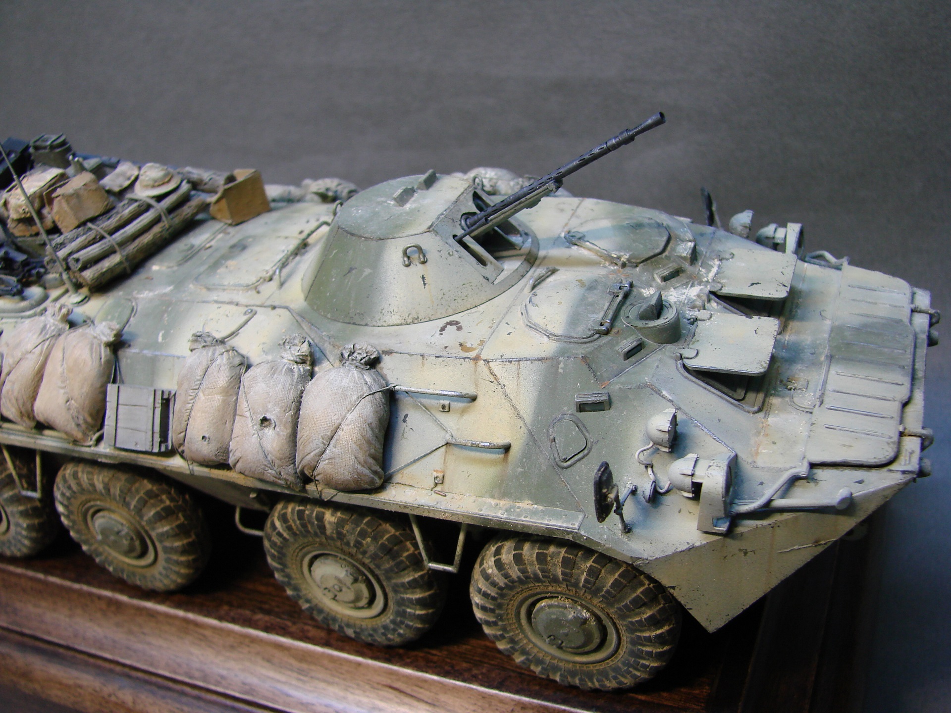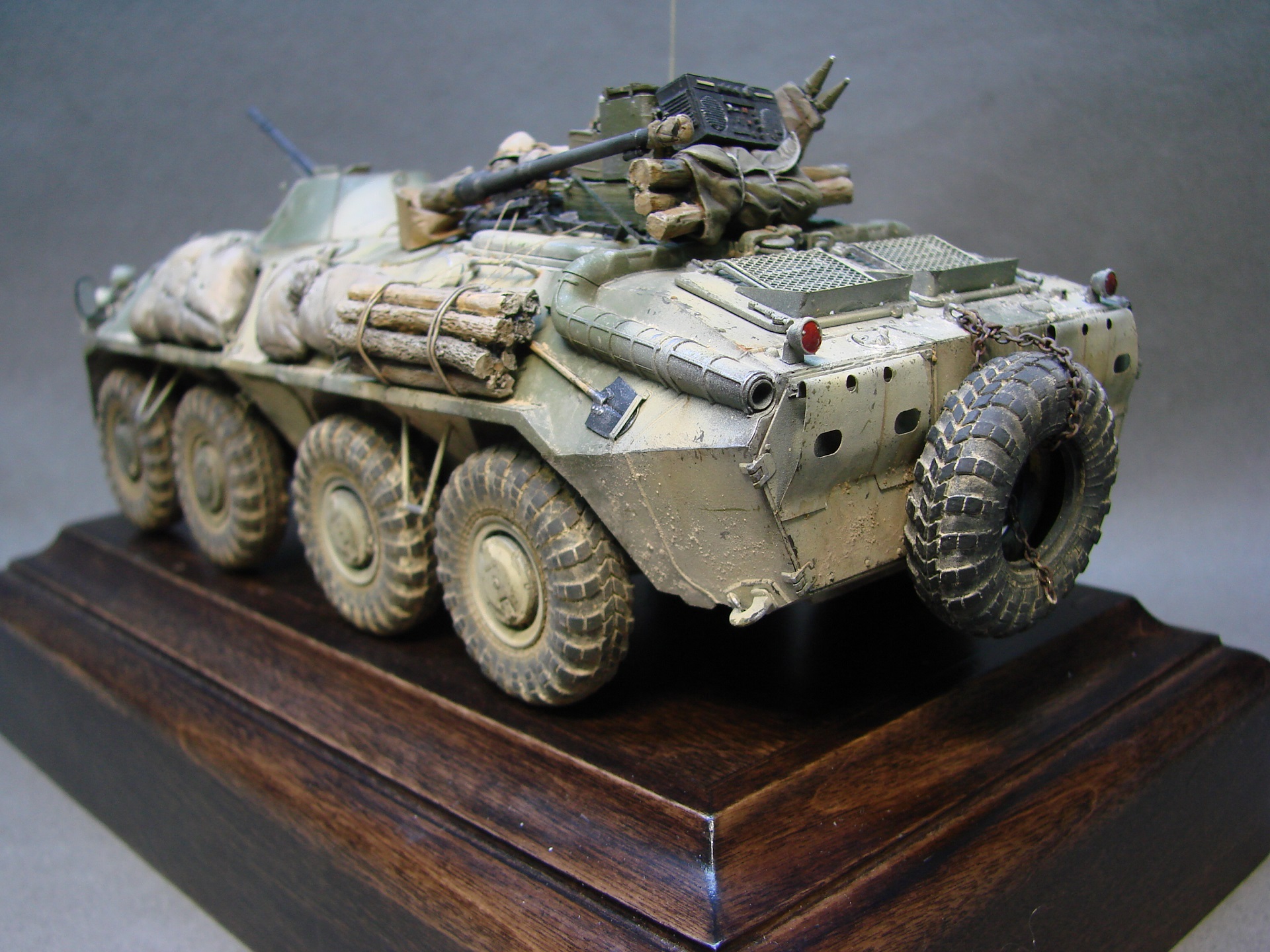 Доброго времени суток! Закончил с моделью БТР-70 от трубача. Решил сделать на тематику Афганистана(модель не имеет привязок) из дополнений вышло по минимуму,замены были оба ствола и антенный ввод, мелочевка на броне собрана была из излишек закромов,не раз слышал что в Афгане была большая потребность в дровах,решил как раз таки пучки с древесиной закинуть так же на броню. На заднюю часть повесил колесо,их вешали для того что бы та техника которая шла позади , упиралась и толкала перед собой заглохшую или выведенную из строя машину,как правило это случалось на высоких подъемах(серпантинах) глохли как правило карбюраторные БТРы