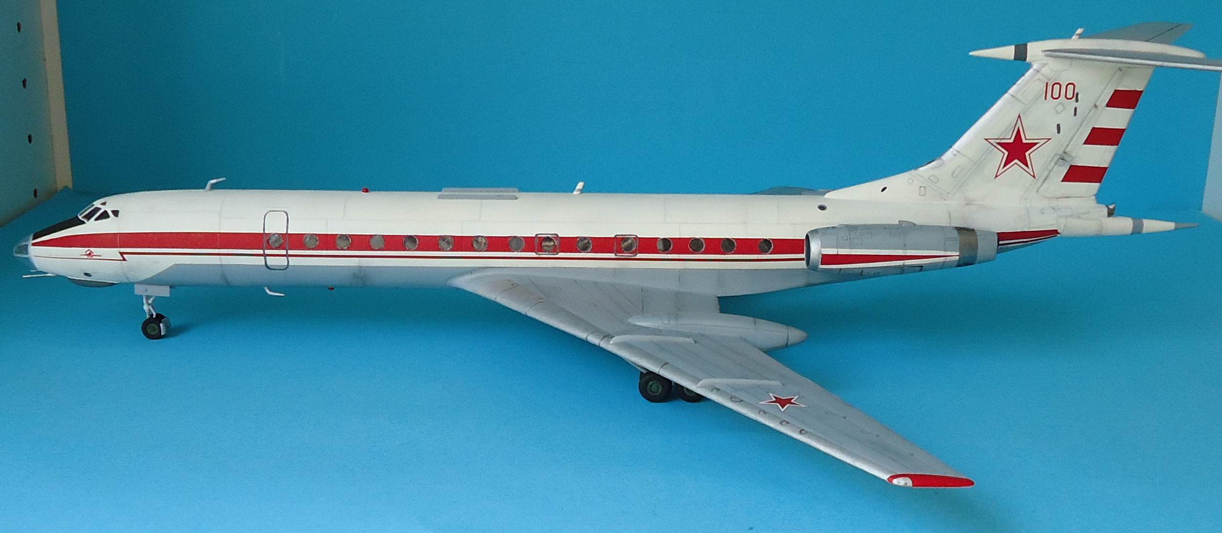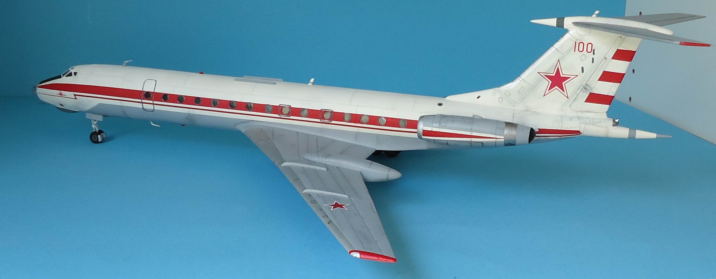 Ту-134А «Балканы», штабной самолет – воздушный командный пункт для командования ВС СССР. Бортовое оборудование самолета обеспечивало: перевозку комсостава ВС по делам службы с обеспечением достаточного уровня комфорта; работу самолета в качестве ВКП как в воздухе, так и на земле. Проект модификации был выполнен на базе самолета для правительственных авиаперевозок Ту-134АК с отличиями: установлен комплекс связи «Балканы» со своей АФС, включающей антенну КВ-связи на длинной остроконечной надстройке в ХЧФ под соплом ВСУ (за что самолет именовали «Ту-134 с жалом»); изменена компоновка салона (существовали компоновки на 26 мест или 31 место). Модель выполнена из коробки,без переделок. Основная полоса накрашена от руки,нижняя молния взята из набора с синей полосой.Но,она немного не соответствует размеру в передней части,поэтому знак = Отличный самолет=,пришлось тоже взять в уменьшенном размере.