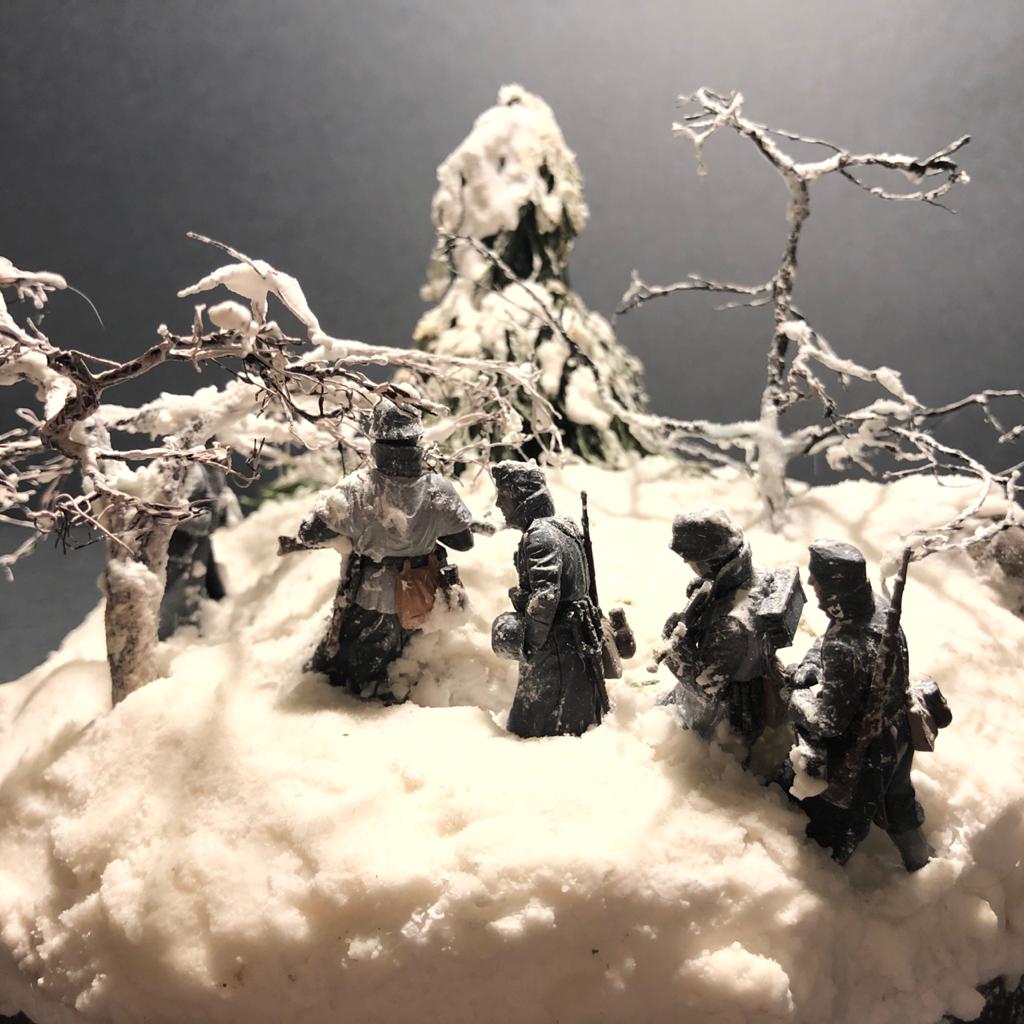 Здравствуйте! Я хочу показать мою первую диорамму на основе фигурок немецких солдатов от Master Box из набора Cold wind. Окрашено краской от тамии, основа- обычный пенопласт из Леонардо. Деревья скрутил из проволоки (из толстой и тонкой). Снег сделан из соды, ПВА и воды, и присыпан пигментом от zip. Повторяюсь, это моя первая работа и хочу чтобы мне указали на недочёты или ошибки.