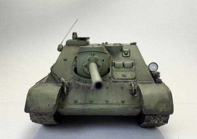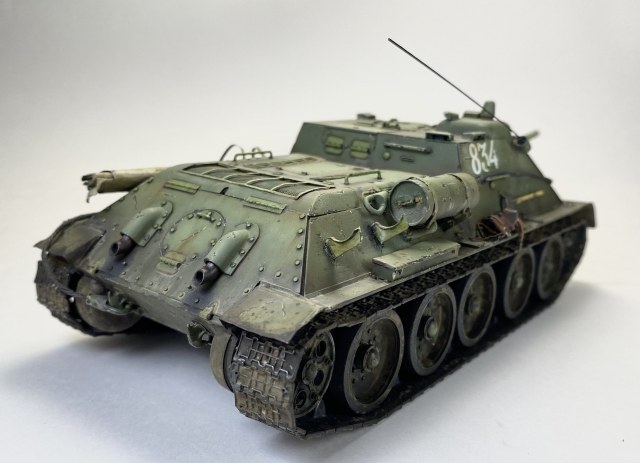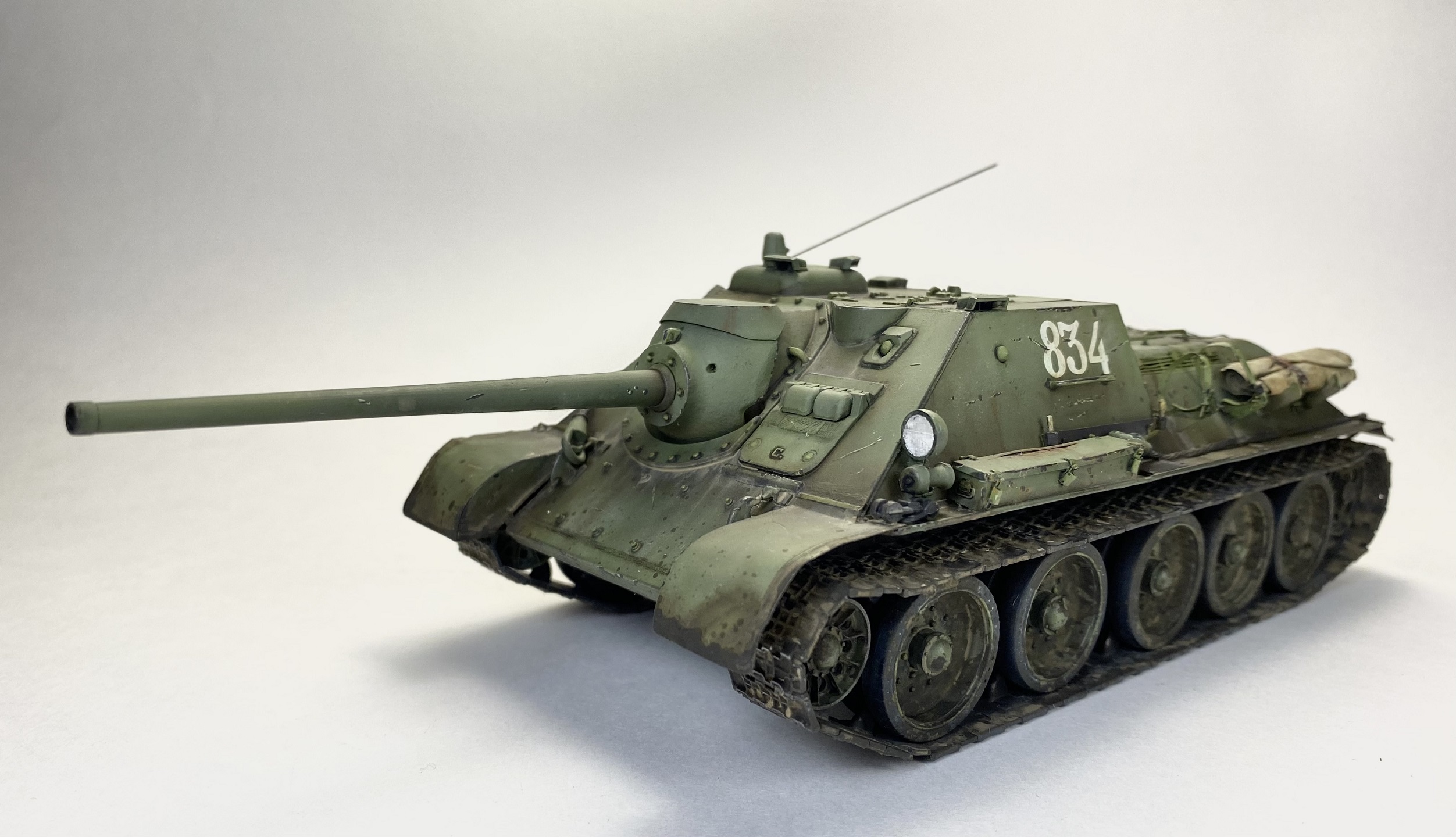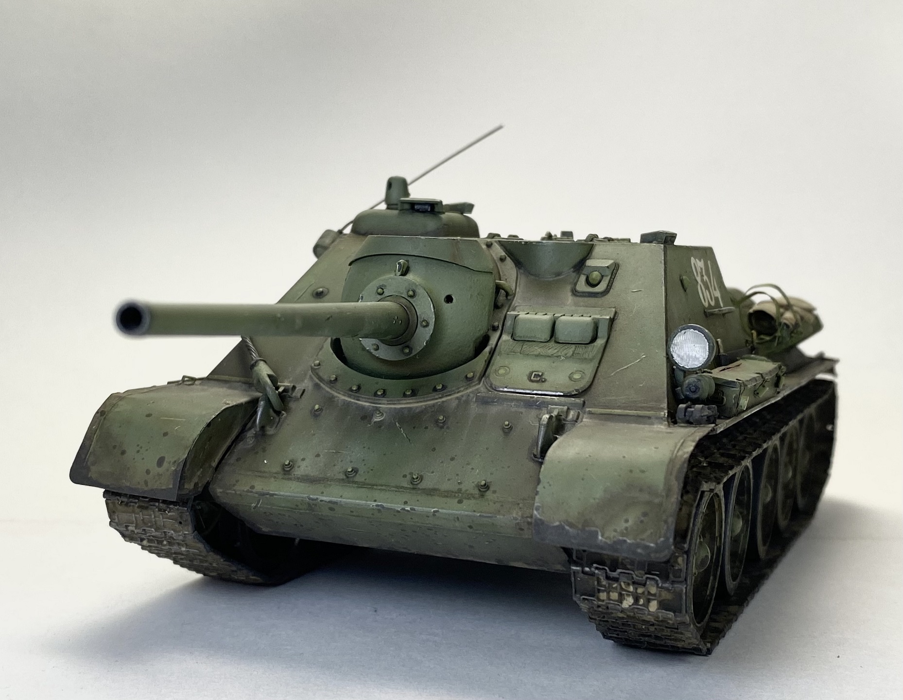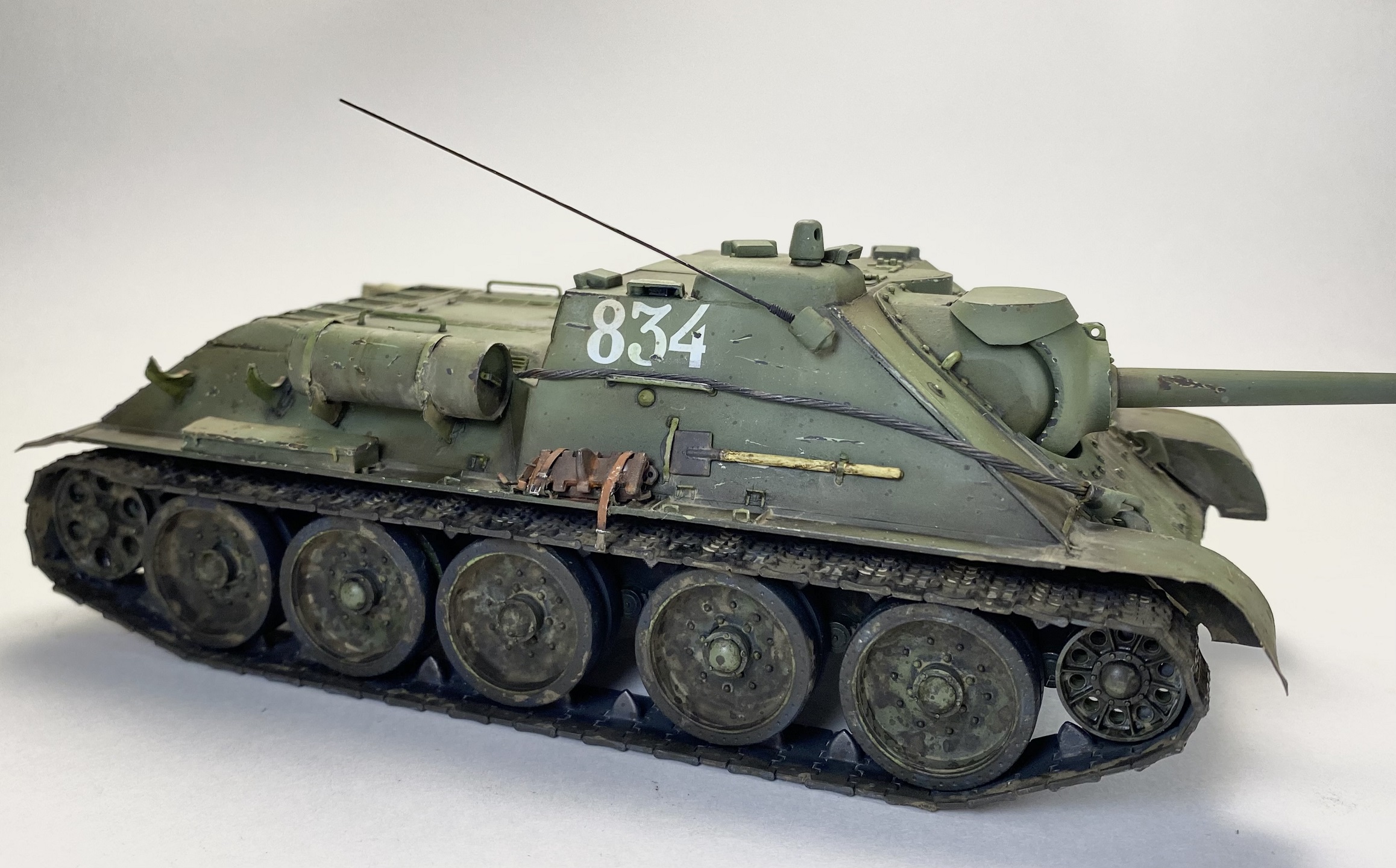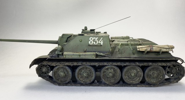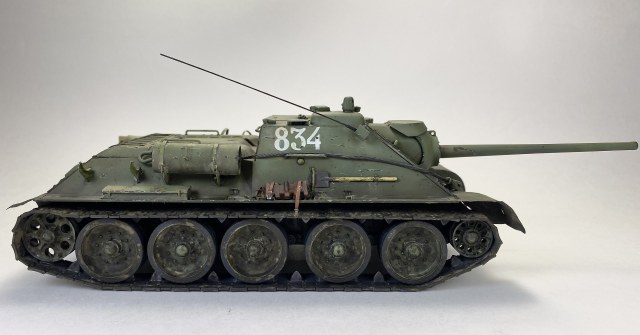Звездовский кит всем известен, сам держу в руках не в первый раз. Отсталая деталировка компенсируется малой ценой и возможностью докупить афтемаркет. От себя добавил ещё тросы и самодельную антенну. Траков под рукой не оказалось, поэтому оставил родные. В принципе, они меня устраивают.
