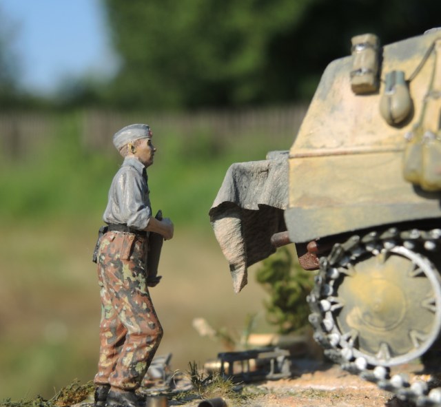 Самоходка из состава 25 танковой дивизии. После переброски из Норвегии 25 танковая дивизия вермахта узнала «все прелести» восточного фронта. Потери в технике привели к тому, что один из транспортеров боеприпасов на базе «Wespe» (Sd.Kfz.124) срочно был переоборудован обратно в САУ. Отсюда характерные «перильца» на крыльях. Экипаж скорее перенес опознавательные знаки, название и номер на корпус новой машины и рванул в бой мстить коммунистам. Через 2 дня после этой фотосессии, они узнают, что такое попадание 122-мм снаряда в их родное корыто и «Оса», пораскинув обвесом и экипажем, откажется от планов отмщения, да и вообще от каких либо планов.