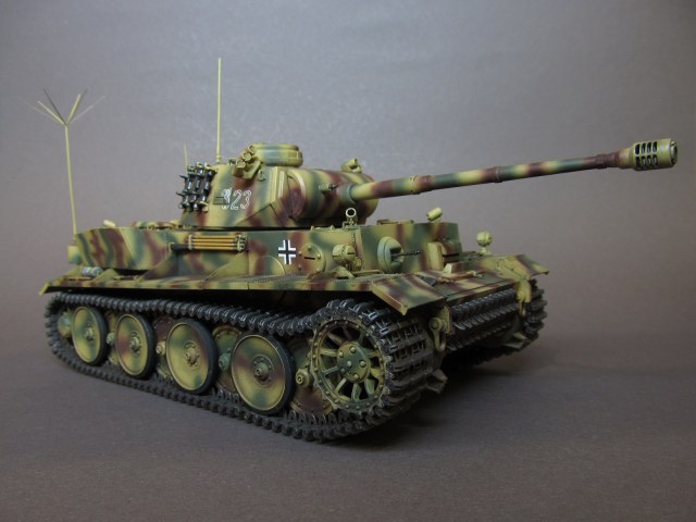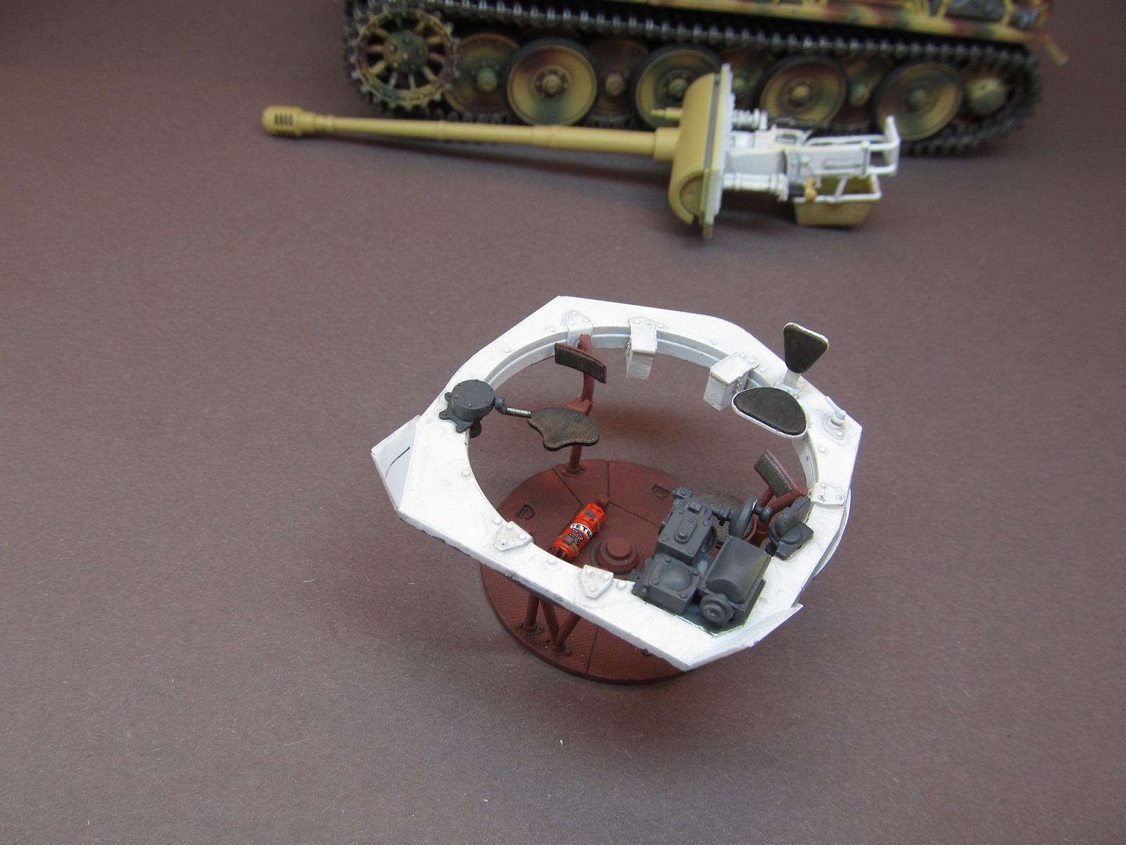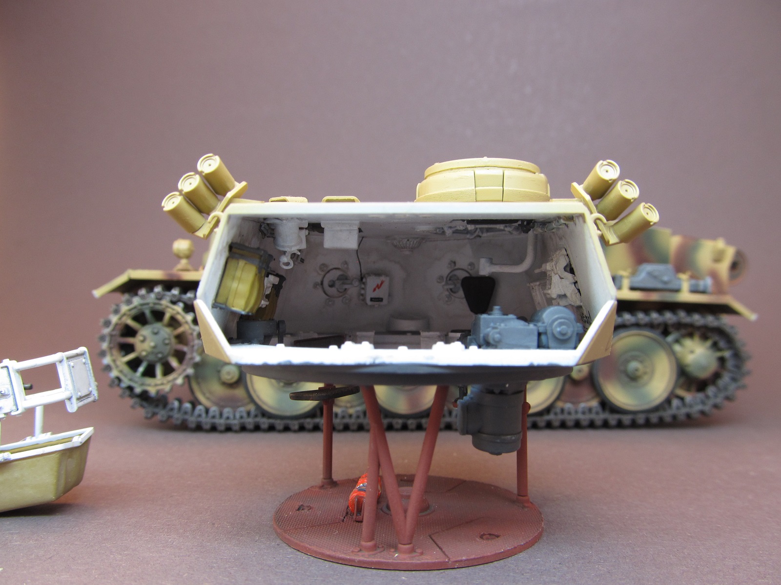 Окрашивал модель акриловыми красками от "Акан" и "Звезды". Применительно к истории создания прототипа машины мысли при окрасе были такие: с завода корпус машины выкрасили в серый танковый цвет, ведь на дворе стояло начало 1942 года. А дальше чистая альтернатива: машина успешно прошла испытания и к весне 1943 году ее решено было отправить в действующие танковые части для прохождения войсковых испытаний и крещения огнем. Для этого машину перед отправкой на фронт перекрасили в Dunkelgelb, нанесли камуфляж, тактические опознавательные знаки, показали фюреру, перекрестили, пожелали ей успешных испытаний, разбили об борт на счастье бутылку шампанского (чем еще на сутки вывели машину из строя до устранения поломок) и отправили в действующие войска.))) Потому машину я изобразил новую, не ушатанную ни боями, ни грязюкой. По поводу цвета глушителей- они при работе двигателей танка разогреваются довольно сильно, зачастую до красна, потому обгорают моментально и при остывании их за счет контраста температур на их поверхности образуется налет ржавчины (при постоянных циклах разогрева- остывания они и ржавеют довольно быстро- посмотрите на своих автомобилях))). Традиционно, нанес знаки-номера, маркировку огнетушителей, шильдики и надписи интерьера кистью своими кривыми ручонками).