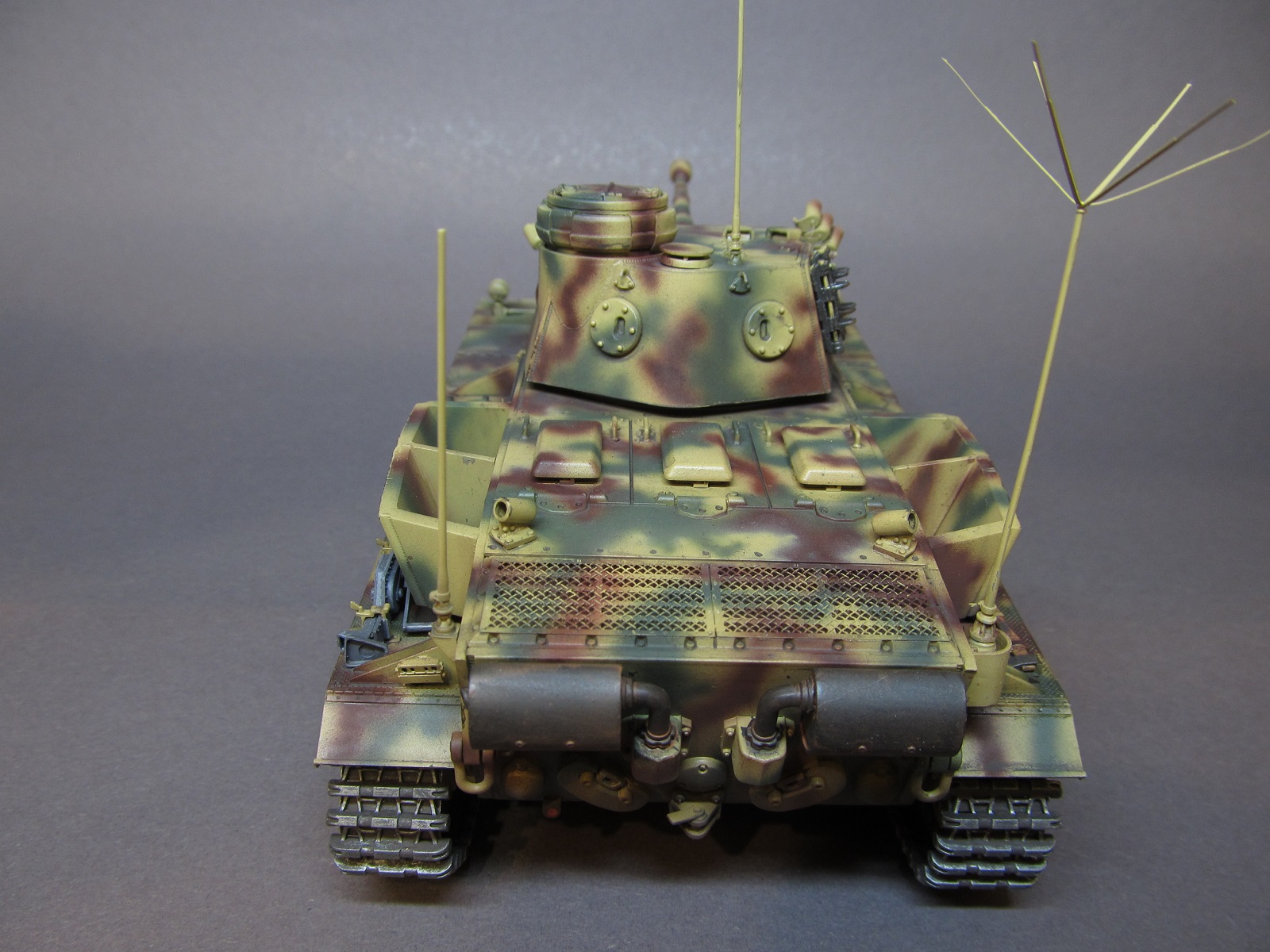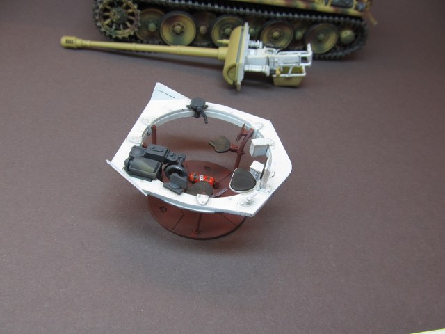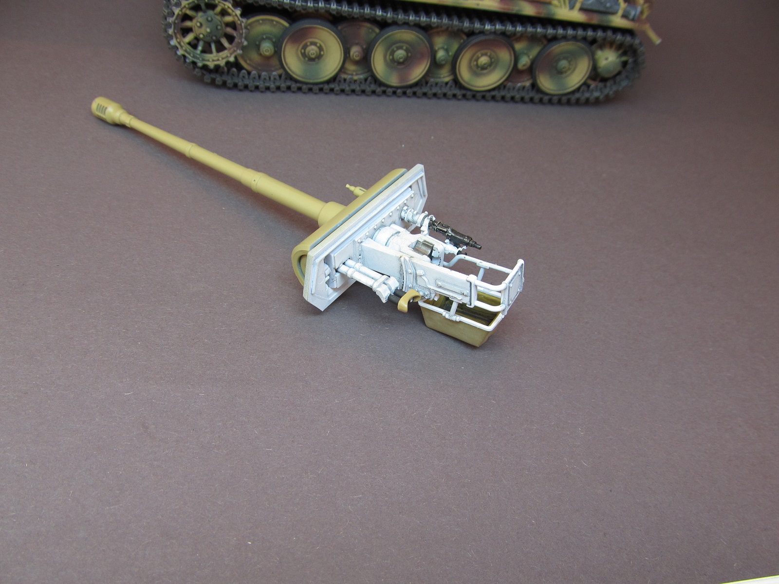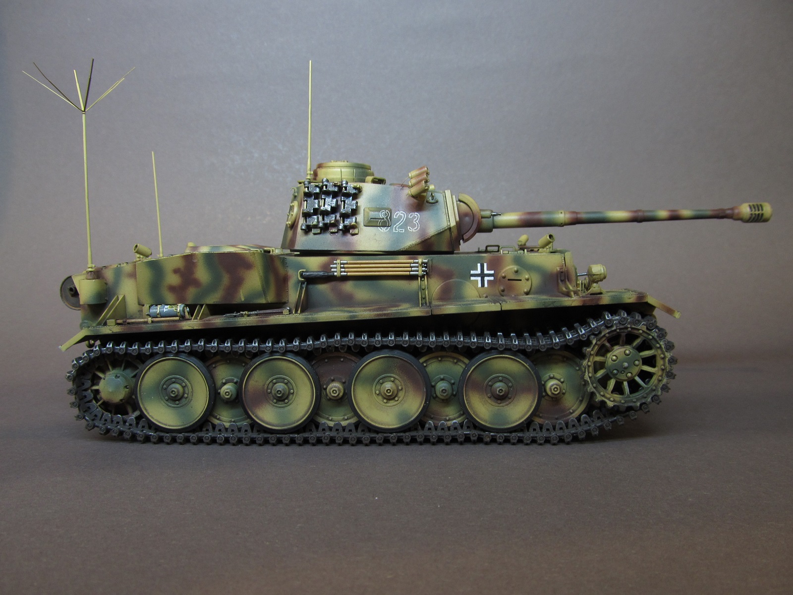 Окрашивал модель акриловыми красками от "Акан" и "Звезды". Применительно к истории создания прототипа машины мысли при окрасе были такие: с завода корпус машины выкрасили в серый танковый цвет, ведь на дворе стояло начало 1942 года. А дальше чистая альтернатива: машина успешно прошла испытания и к весне 1943 году ее решено было отправить в действующие танковые части для прохождения войсковых испытаний и крещения огнем. Для этого машину перед отправкой на фронт перекрасили в Dunkelgelb, нанесли камуфляж, тактические опознавательные знаки, показали фюреру, перекрестили, пожелали ей успешных испытаний, разбили об борт на счастье бутылку шампанского (чем еще на сутки вывели машину из строя до устранения поломок) и отправили в действующие войска.))) Потому машину я изобразил новую, не ушатанную ни боями, ни грязюкой. По поводу цвета глушителей- они при работе двигателей танка разогреваются довольно сильно, зачастую до красна, потому обгорают моментально и при остывании их за счет контраста температур на их поверхности образуется налет ржавчины (при постоянных циклах разогрева- остывания они и ржавеют довольно быстро- посмотрите на своих автомобилях))). Традиционно, нанес знаки-номера, маркировку огнетушителей, шильдики и надписи интерьера кистью своими кривыми ручонками).