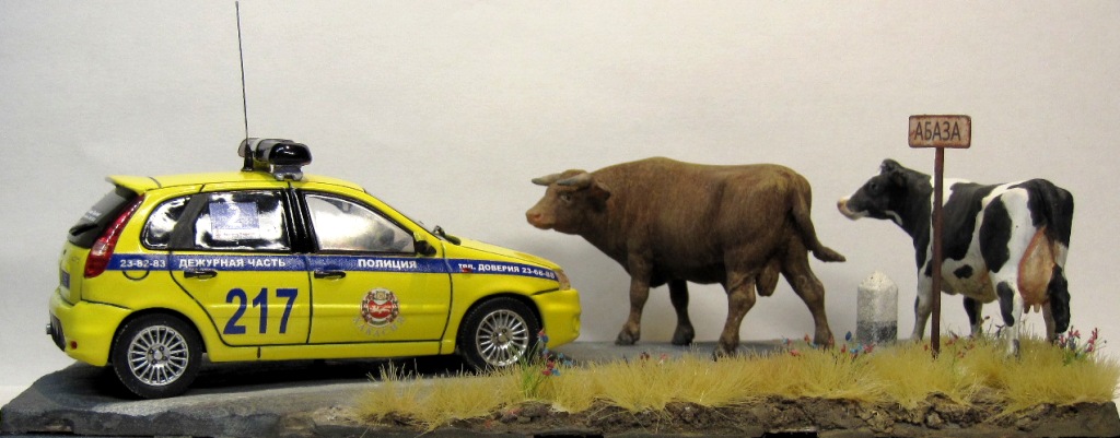 Фигурки:Фигурки современного сотрудника ДПС (готовой) я не нашёл, поэтому перепилил его из фигурки фирмы guntowermodels дальнобойщика. Перепилил, раскрасил, обдекалил (декали сам рисовал) погонами, шевронами и нагрудными знаками. Коровы-это киты белорусской фирмы Бай Волк. Коров зашлифовал, загрунтовал и раскрасил Тамией кистью. Вроде как получилось-это мой первый опыт работы с животными.