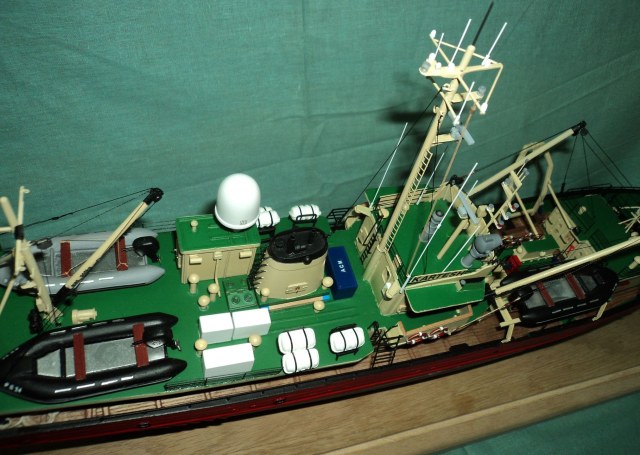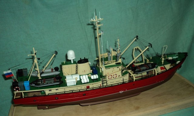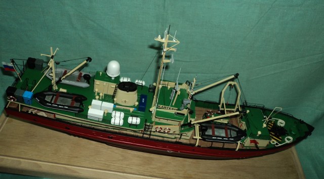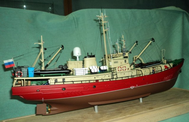 Модель судна построена в масштабе 1:75 по классической схеме: набор,болван,корка из стеклоткани.Надстройки и оборудование изготовлены из пластика и смол.Модель,не смотря на кажущююся простоту,достаточно сложна в постройке,т.к. конструктивные элементы,потребовали искать новые технологии изготовления.Например,навесная палуба на корме,под которой много оборудования и т.д.Но и интересно было решать возникающие проблемы.Достаточно насыщенный такелаж тоже потребовал "поломать голову".Модель построена за 4,5 месяца.Выношу на решение коллег.