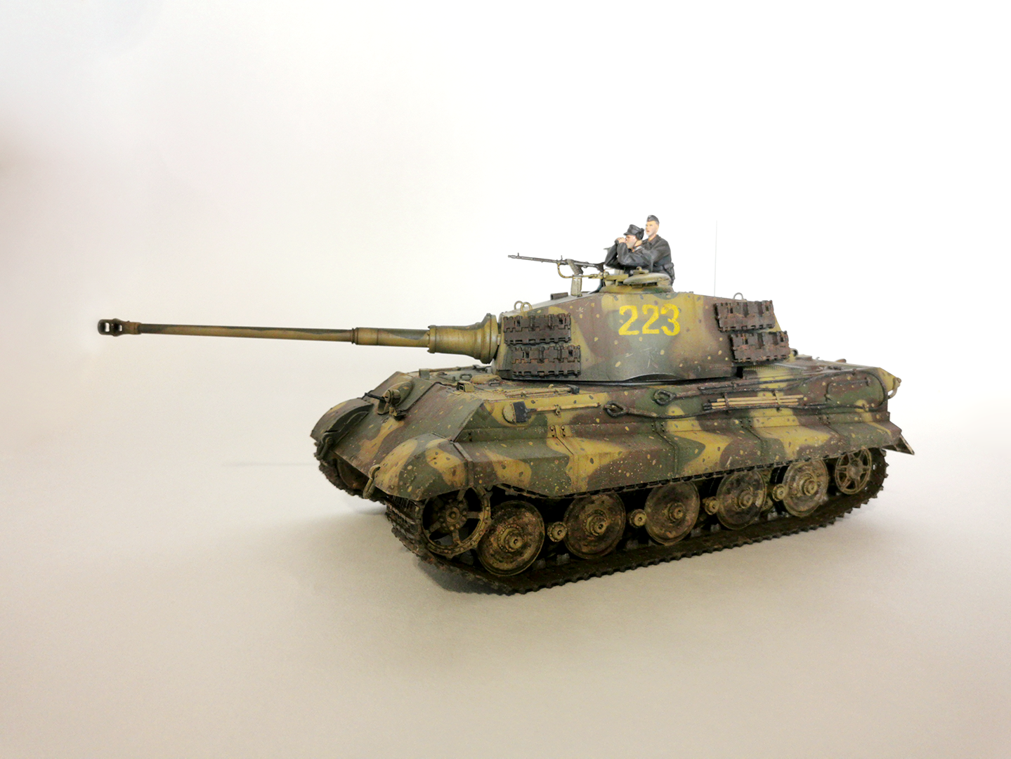 Представляю вам модель королевского тигра от Менг в 35 масштабе, сборка из коробки, только добавил антенну. Сейчас обуяли сомнения, нужно ли было еще на башню антенну, подскажите, кто в курсе.