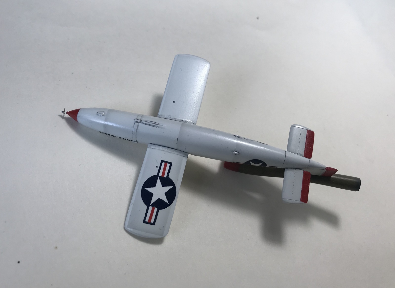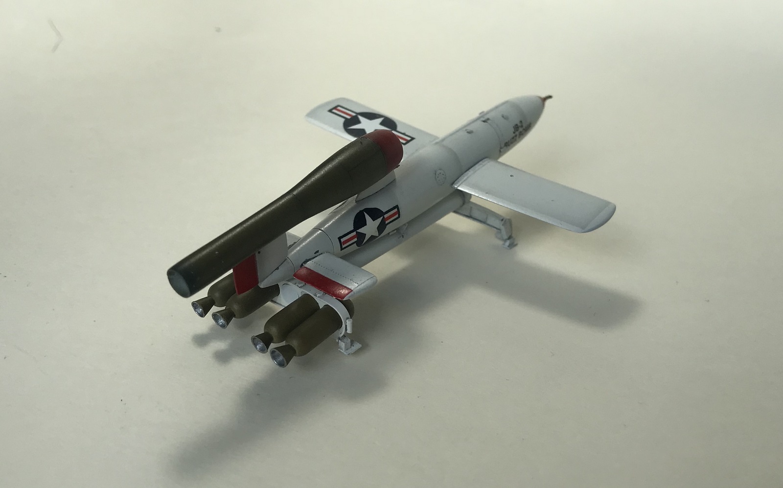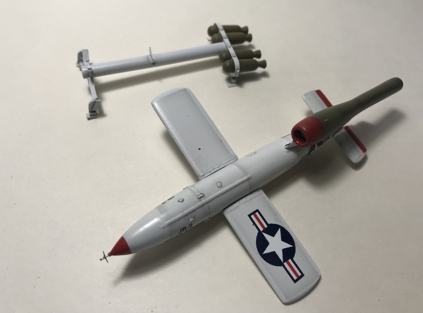 Приветствую уважаемые коллеги! Представляю вам, свою поделку, модель крылатой ракеты JB-2 Loon(американский клон немецкой Фау-1), которую начал строить, почти год назад....Набор от 12 Squared https://karopka.ru/community/user/17106/?MODEL=577353...лютые дрова, даже Фроговский Фау выглядит и собирается лучше. Детали корпуса поведенные, много утяжин и облоя, одна половинка Аргуса короче другой. Пришлось пилить и строгать все детали. Стартовую тележку делал с нуля, из листового пластика 0,3 мм... очень пригодились родные литники(толстые), для изготовления пороховых ускорителей. Добавил проволоку и фольгу, крой надувал краской, местами нарезал и дорисовывал простым карандашом. Красил Ганзовской нитрой, лак футура, смывка и полуматовая Ганза. Родные декали от старости рассыпались, но помогла Микроскейловская химия(лак для восстановления декалей), приваривал тоже Микроскейловскими Сет и Сол. Стройка здесь... https://karopka.ru/forum/forum191/topic30683/message1481429/#message1481429