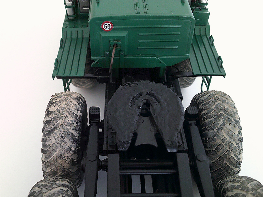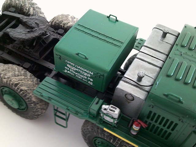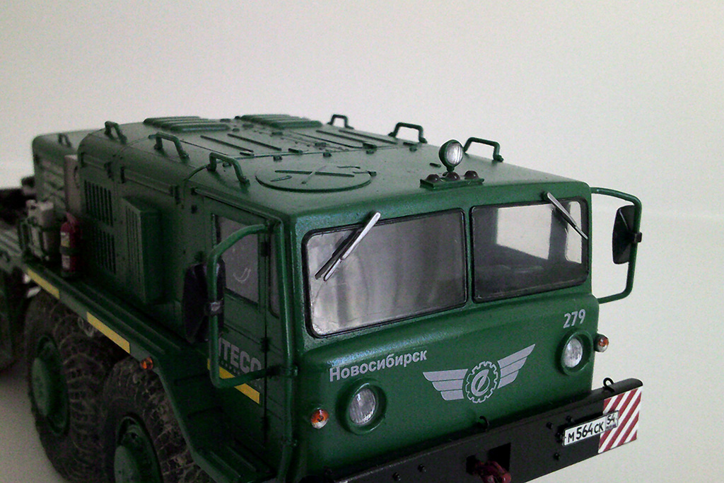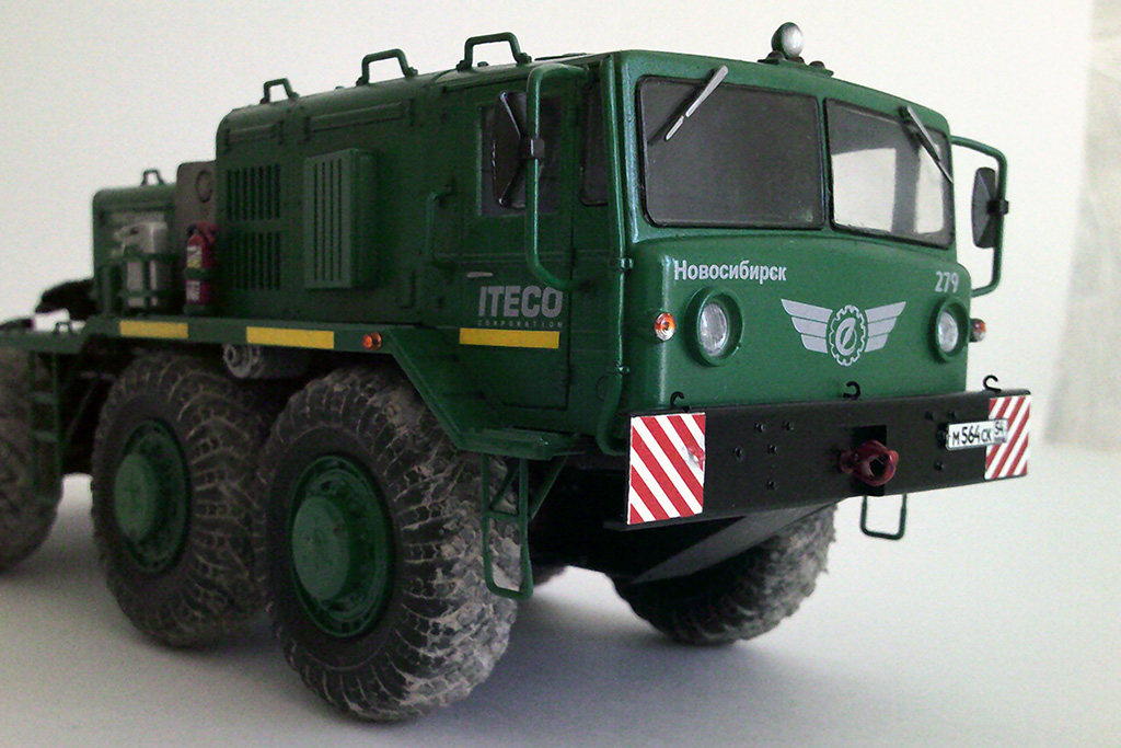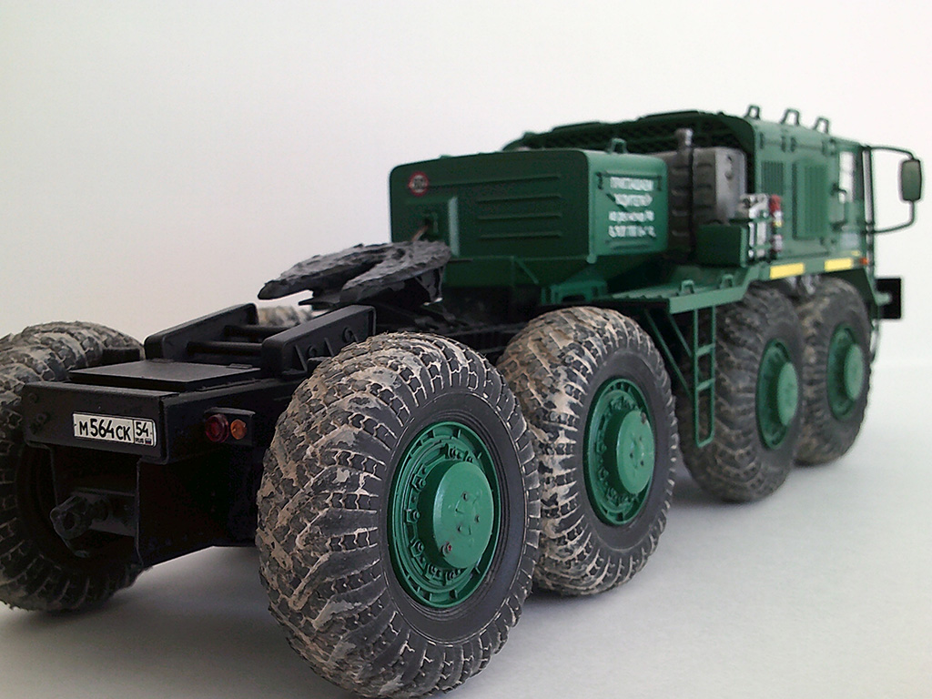 Решил сделать МАЗ-537 в корпоративной окраске транспортной компании по аналогии с Камазами, по этой же причине окрасил топливные баки в металлик. По легенде это новый автомобиль, прибывший в парк. Тягачи, как правило, такими и приезжают: колеса в дорожной пыли все, а сами чистые. Сделал топливные и масляные потеки, но особенно модель не грязнил и не старил.