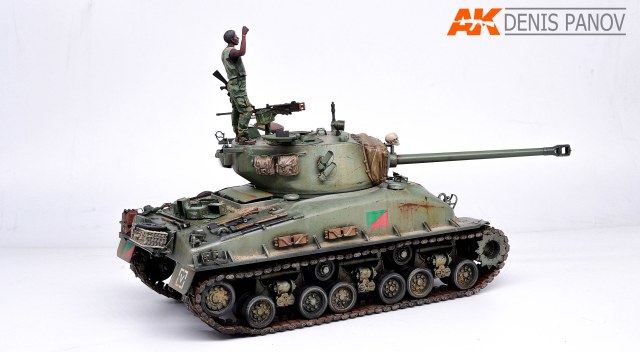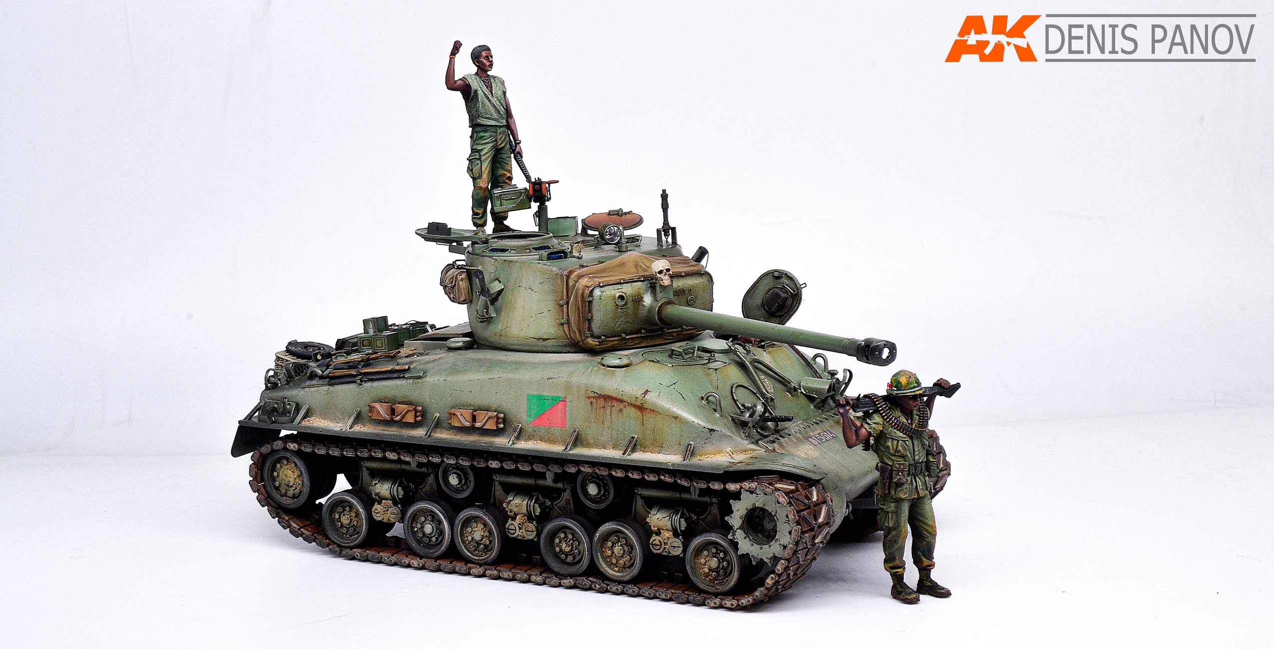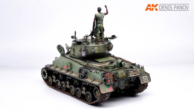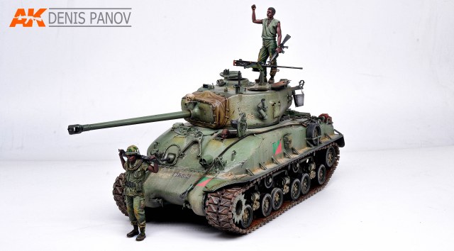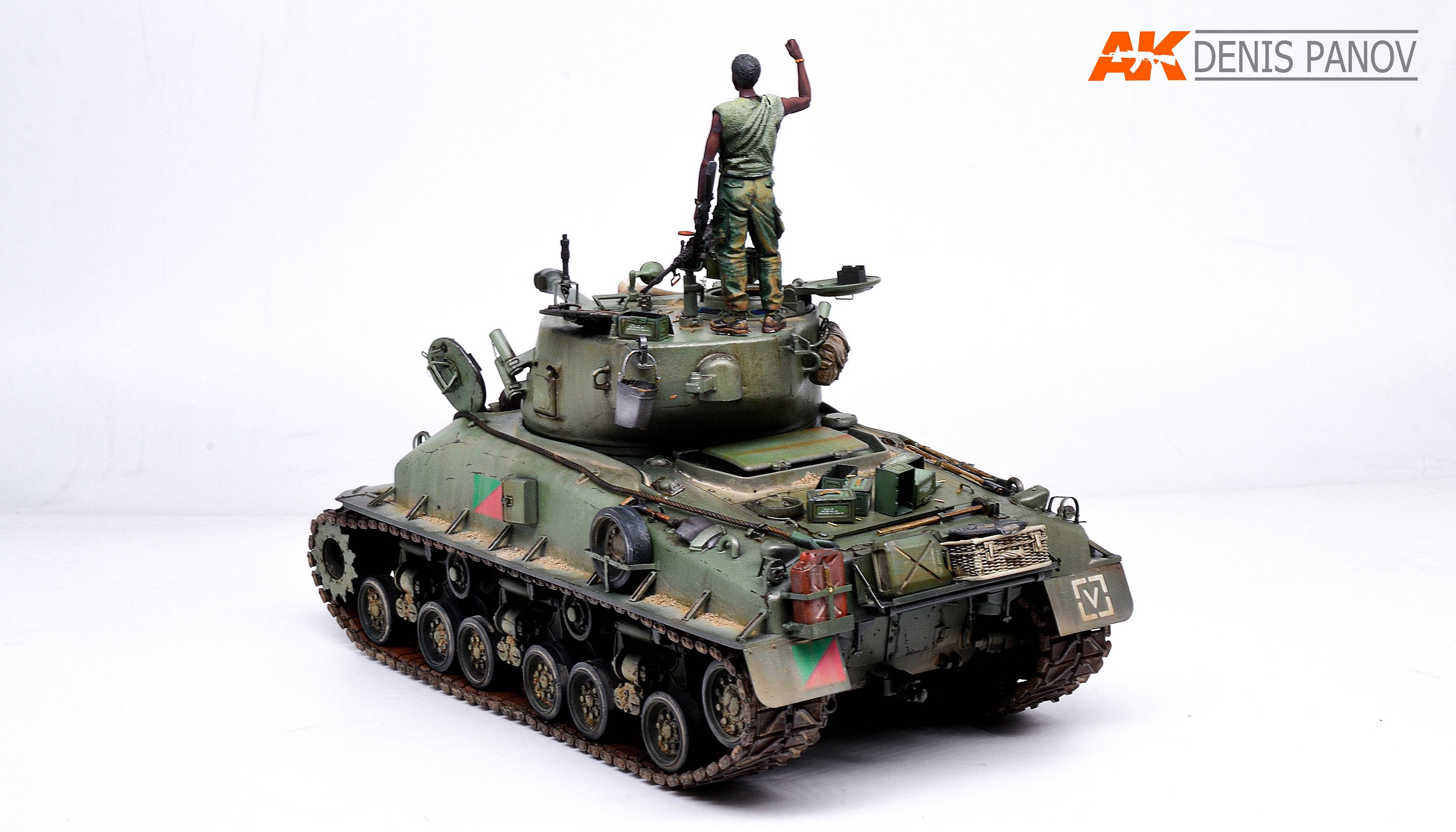 М4А1(76)W – Шерман армии Иди Амина, Уганда, окрестности столицы города Кампала, 1979 г. Доброго времени суток, уважаемые каропчане! Вашему вниманию представляется модель танка Шерман армии Уганды, 1979 г. Это совместный проект Олега Антонова, г. Омск (сборка), Дениса Панова, г. Москва (окраска, везеринг, композиция и фотопрезентация) и Романа Тарасова, г. Санкт-Петербург (роспись фигур от Браво-6). Несколько слов от Олега Антонова. Пару лет назад Олег Антонов и Дмитрий Боярских на странице Димы представляли аналогичную модель https://karopka.ru/community/user/17154/?MODEL=544751 Однако та модель танка, ушедшая в коллекцию Олега, была полностью разгромлена в неожиданном сражении с пушистым домашним питомцем. И вот пришло время отдать (самому себе) модель в ремонт, полностью ее отмыв до пластика, разобрать и собрать с заменой недостающих узлов и агрегатов, поставив, где следовало бы ранее, травленые детали. Кроме того, первый вариант модели сильно грешил рядом упрощений и недоработок по матчасти, что я попытался исправить в настоящей работе. Роспись машины Денисом Пановым и фигурок Романом Тарасовым, на мой взгляд, внесли особый колорит, добавили антуража и определили новую композицию. Суть ее очень проста и заключается в угоне захваченного угандийского Шермана «оппонентами» Иди Амина при разгроме его же армии войсками Танзании и повстанцами в 1979 году. Историю появления и службы Шерманов в Уганде я уже кратко описывал (см. ранее ссылку), так что не вижу необходимости ее здесь повторять. По сборке. Как всегда у меня сборная солянка из разных деталей Шерманов от разных фирм. Корпус и ходовая часть – от набора М-51 Super Sherman – пластика четвертьвековой давности, успевшего побывать, как собственно Супершерманом (хотя это название весьма спорное), так и первым вариантом угандийской машины. Допотопный М4А1 от Италери послужил донором – были позаимствованы и доработаны надмоторная плита и задняя панель. Башня – от тамиевского Супершермана дополнена гранатаметами и кожухом маски пушки из набора М51 от Тамии. Люк заряжающего, его стопор, фары и прожектор – от «широко известного в узких кругах» М4А2 Звезды. Зап. траки на корпусе – от Тамии и Академии. Открытый люк мехвода заменен на драгоновский и дополнен травлом, смоляной рукояткой и проволочными ручками, как и частично люк командира танка. А какая там, у академовских Шерманов защита фар и сигнала, - это что-то! А ведь это, простите, морда лица танка… Поэтому на травло от Эдуарда была заменена и защита фар и сигнала. По легенде, танк полностью отстрелялся и, видимо, был оставлен бравыми танкистами (не путать с танкистами «Браво-6»!), поэтому, нам показалось интересным наличие нескольких «отработанных» патронных ящиков, и тут же патронных гильз, хаотично разбросанных на корме танка. Родные «резинки» от Академии без сожаления покинули пределы жилплощади и были заменены траками от RFM. Проведена нудная работа по сборке гусениц от RFM, позаимствованных от Шермана означенной фирмы. Если честно, сборка этих траков то еще удовольствие. Так «не интересно» я собирал только трак-ленты от Такомовского «Объекта 279». Только на одно вырезание и зачистку составляющих траки элементов ушло несколько вечеров, а еще и сборка. Но все-таки траки эти, хоть и хлипкие, но похожи и выглядят живее, чем резиновые ленты Академии. Поменял ведущую звездочку, т.к. г
