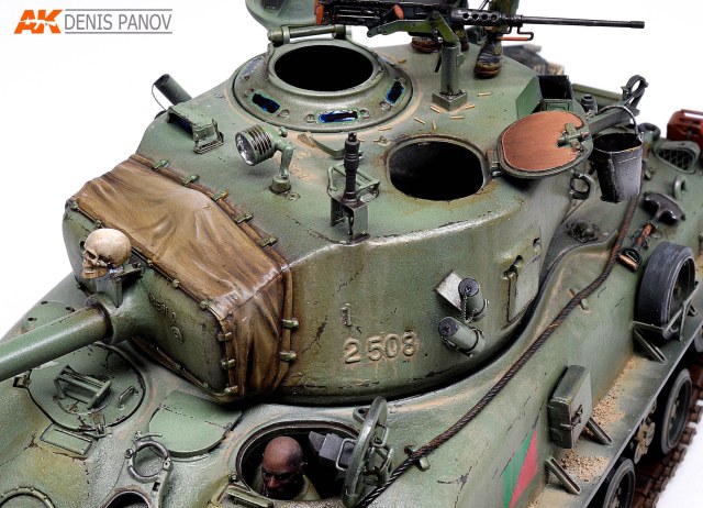 Добавлю немного по детализации, о чем забыл сказать в описании. Слева на башне добавил литьевые номера - цифровые обозначения деталей, срезанные с литников. В необходимых местах просверлены дренажные отверстия. Добавлены кронштейн кожуха пулемета из старых запасов от Таски, мешки от Бронко, ведро - латунь от Микродизайна. Травяной коврик от Model Scene. "Кассетник" под канистру на корме - латунь от Эдуарда из набора травла к драгоновскому М51. Немного треша добавил весьма качественный смоляной перелив черепа на кронштейне прожектора на маске пушки.
