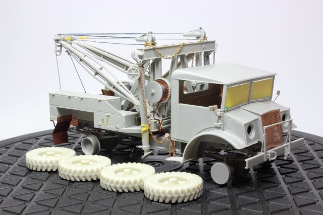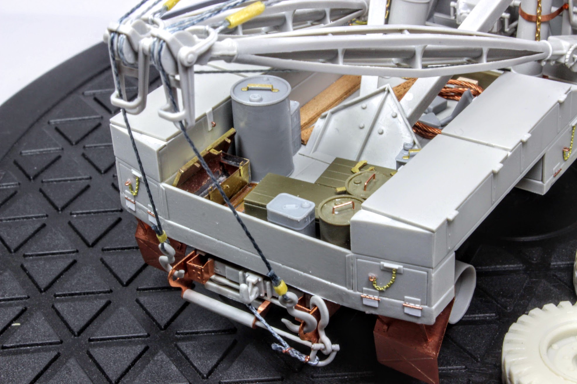 Теперь по самой сборке... Тут я был сильно удивлён что столкнусь с таким некачественным пластиком. Огромные смещения, даже самую простую деталь надо было очень тщательно подготавливать, высверливать отверстия, шпатлевать и т.д. Но и это особенно не помогало, модель на выходе будет немного кривоватой. Ещё один минус, это очень короткий трос который даётся в наборе (хватит только на одну сторону крана). Из плюсов: отличные смоляные колёса, хорошее фототравление.