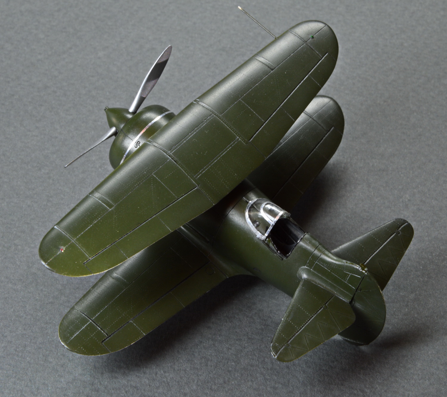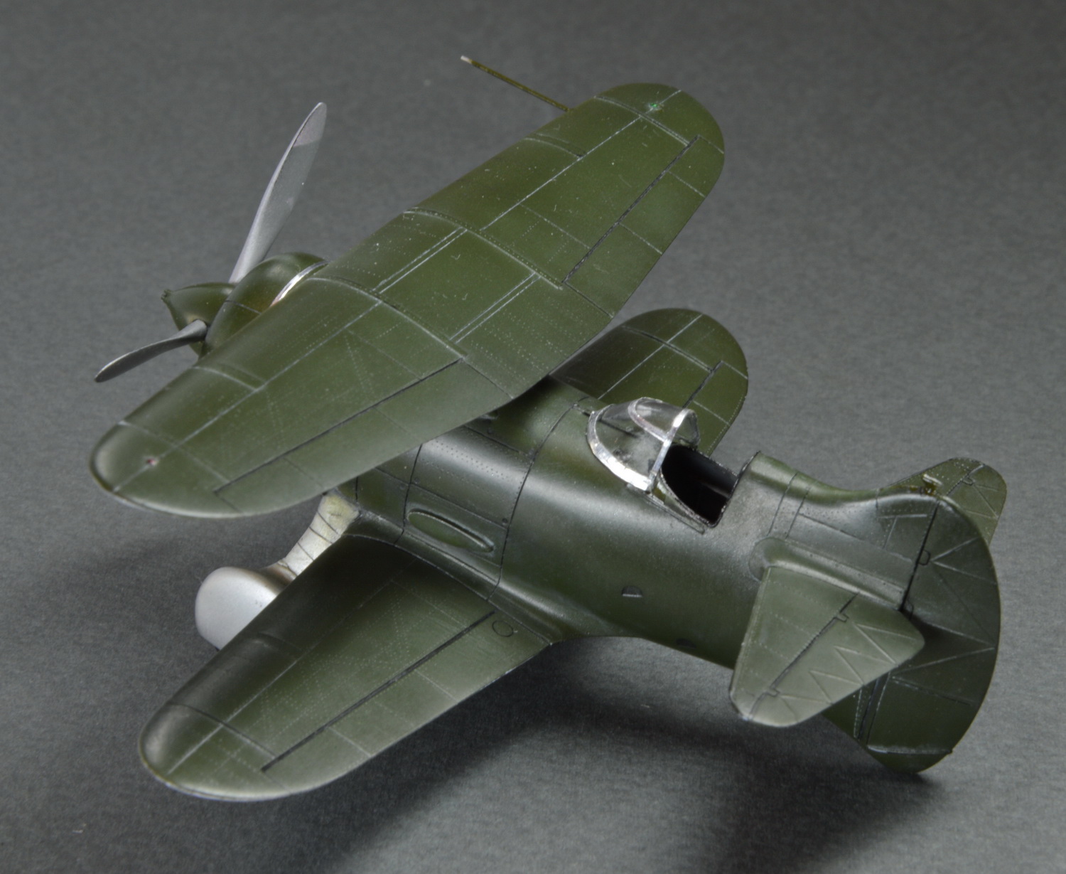 Отличный набор отличного производителя. Собрался довольно просто и быстро. Для оживления накатал клёпку по фото.Сделал окошки и ухваты под фонарём.Так же сделал направляющие фонаря. Покрасить решил по одной из версий,что изначально самолёт был покрашен так. Верх А||З,низ A||Ал.Возможно ошибочно.Не утверждаю. Немного не дожал переплёт фонаря,уж больно мелкий и сложные переходы оказались для фольги.