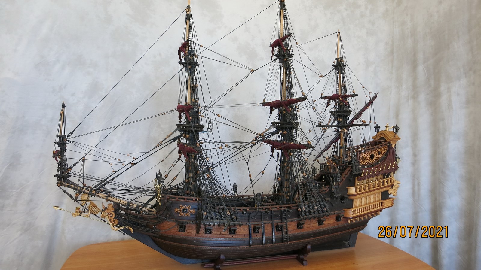 Как сказал Черная Борода: я в недоумении: Отлично и атмосферно выполненный корпус и в то же время явно декоративные элементы из светлого дерева и, особенно, блестящей латуни. Конечно, взгляд любого моделиста на любую модель свой, но в данном случае я считаю это диссонансом. Также, декор на кровле антамблемента (хреновина над витражем на котором кормовые фонари стоят) - явно лишний. В то же время просто не могу пройти мимо качества резьбы - она великолепна. Очень аккуратная и идеально вылизанная, но опять же - для такого корабля слишком аккуратна. Поздравляю с завершением - достойный результат