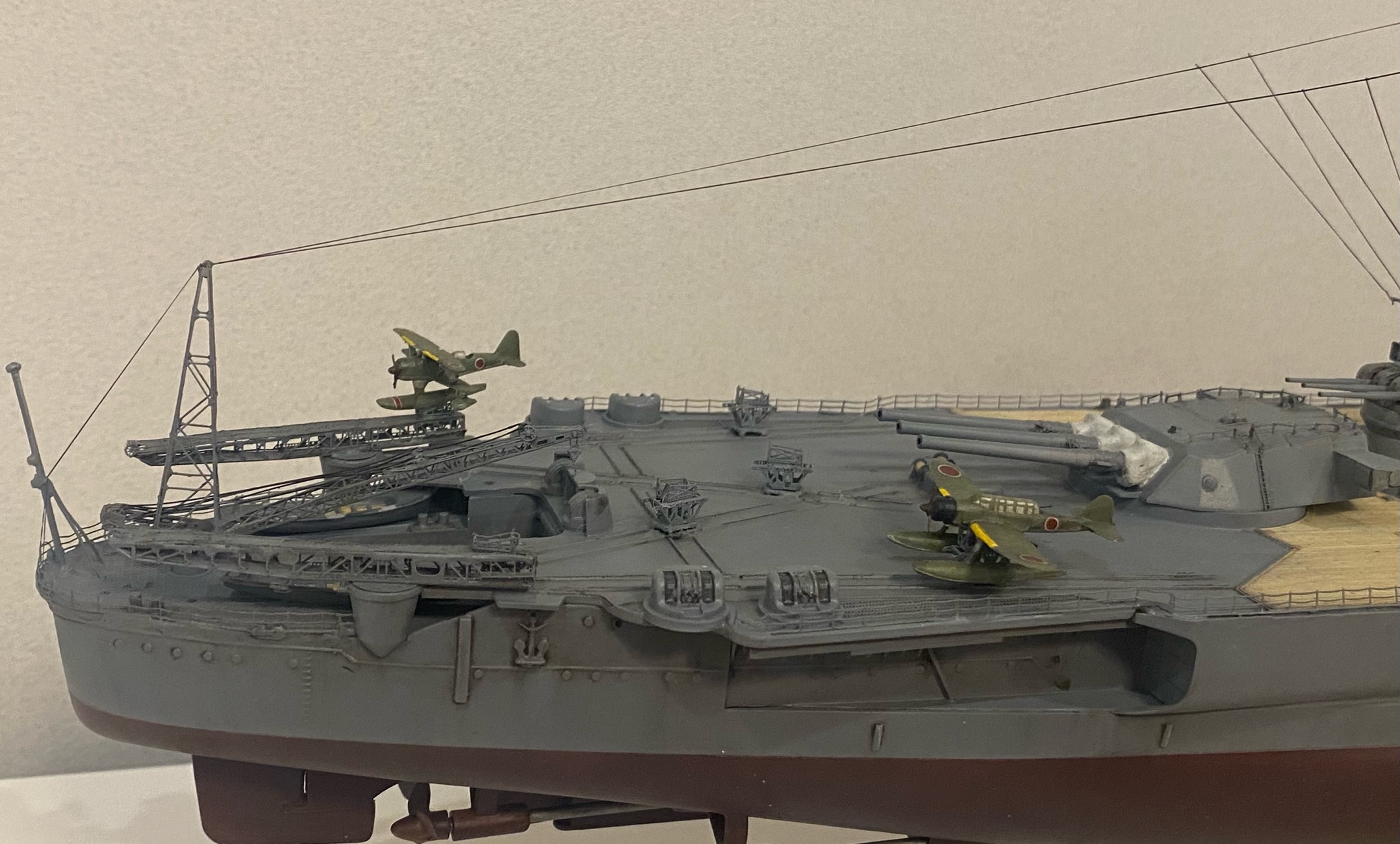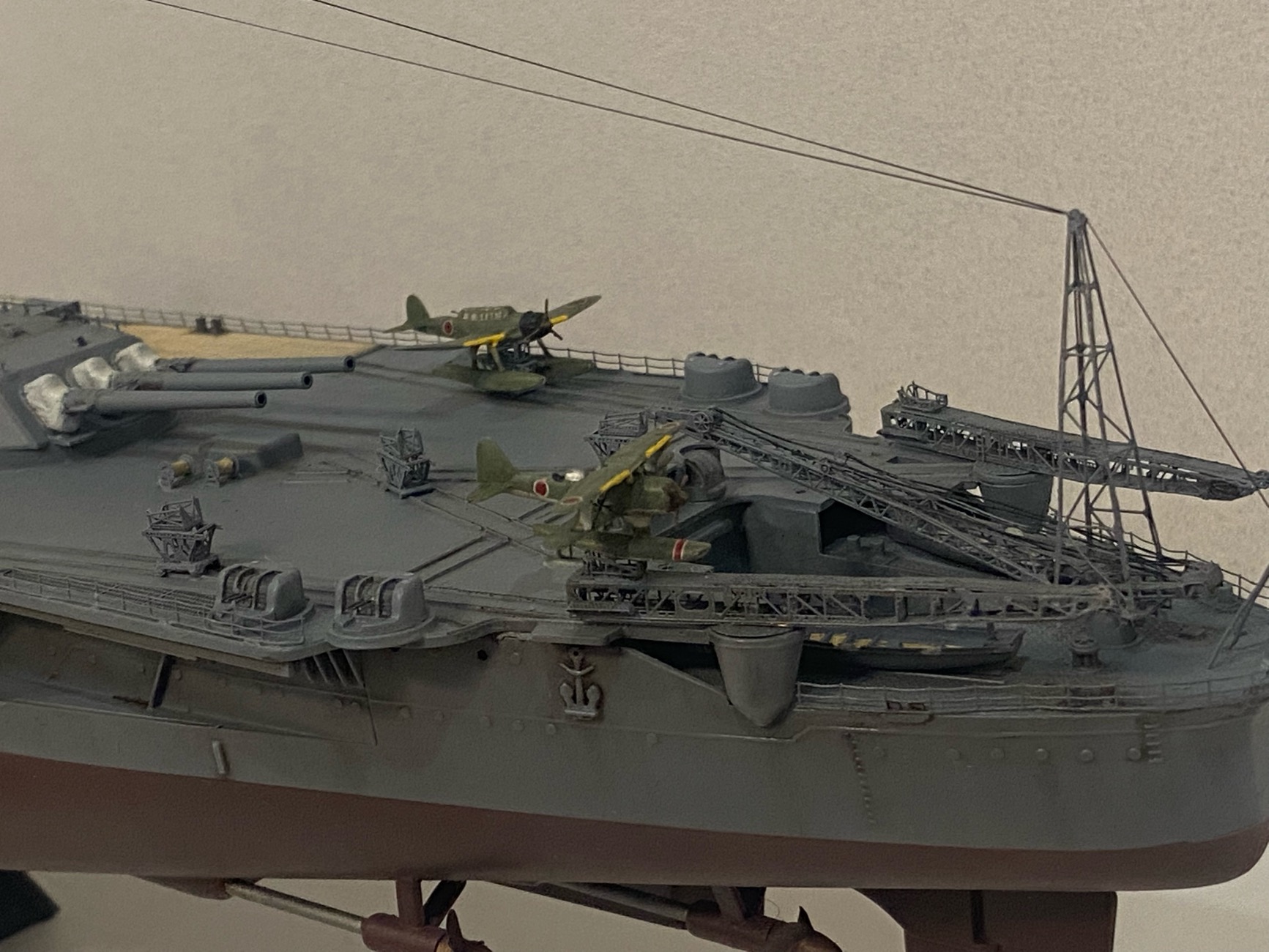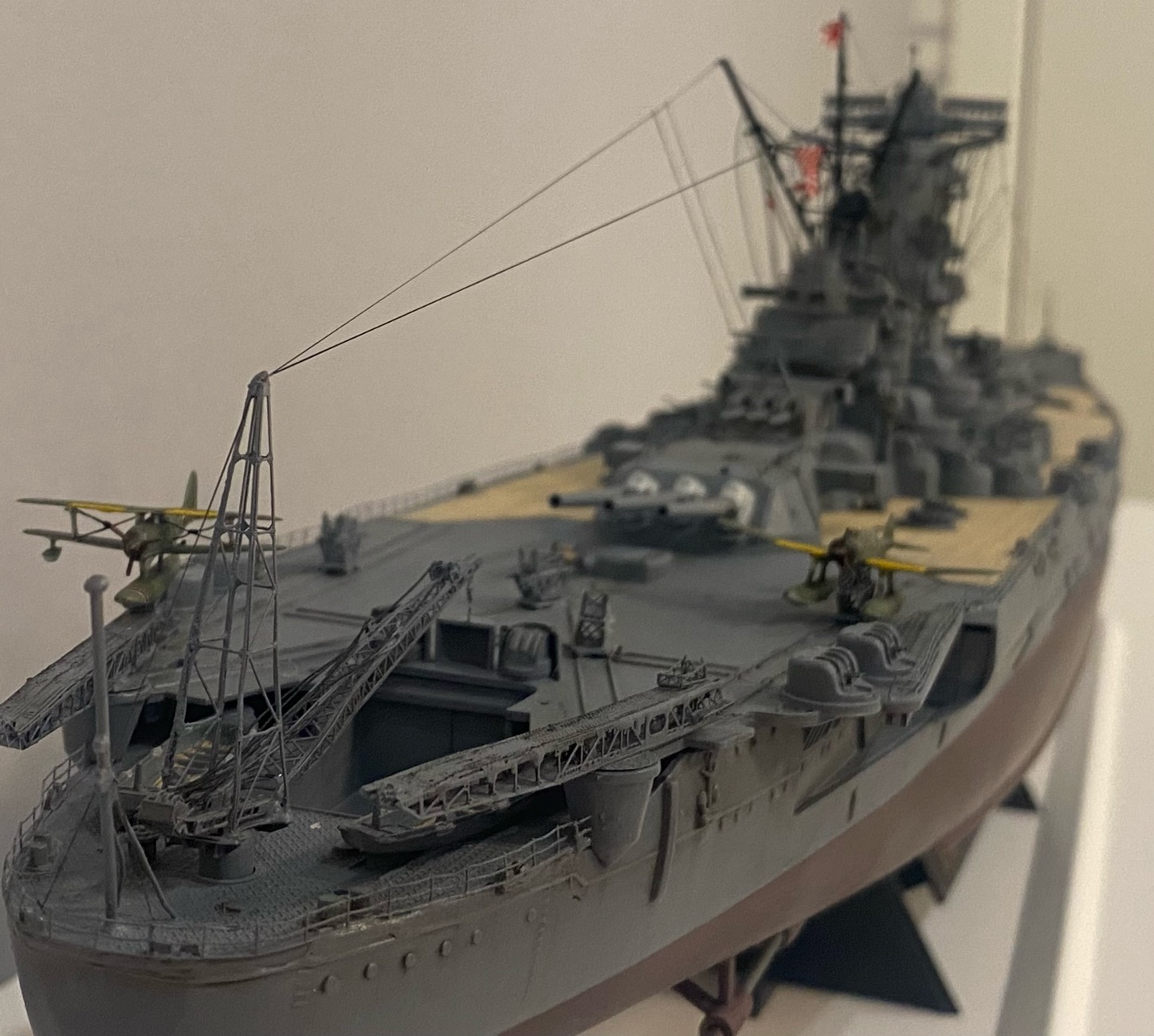 Что сделано полностью самостоятельно: главная мачта, носовая и кормовые мачты, радар (сделано из танковых сеток, но по размерам из Книги про Ямато и Мусаси, стойки радара пришлось сделать не копийными, так как нужный диаметр проволоки не держал форму стоек и не держал решётки и загибался и ломался, так что, наматерившись, я сделал как сделал, а из латунных трубок разного диаметра сделал стволы 127-мм орудий и 25-мм зенитных орудий (тут сделал максимально приближено к масштабу), цепи, якоря, антенны на башнях среднего калибра, некоторые ограждения и……самолёты…..получилось всего два! Пришлось вытачивать крылья, хвосты, поплавки, лопасти, расчалки, такелаж, стойки поплавков ( получилось не очень конечно, но в таком масштабе смотрибельно…я собой оказался доволен, хотя времени на два самолёта ушло столько же, сколько на всё фототравление. Лестницы, трапы, увы на главной надстройке случайно попал пальцем и погнул всё, больше мне восстановить трапы не получилось, поэтому вырезав части от танковых решёток приклеил к пластику и поставил на место…бесит, но делать нечего…