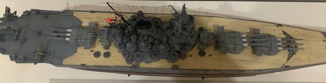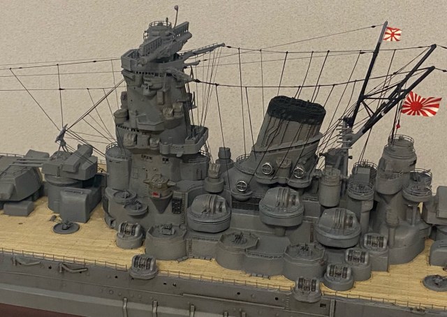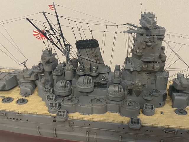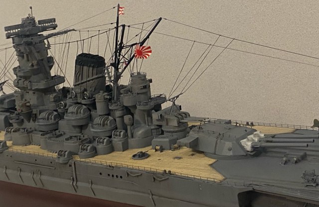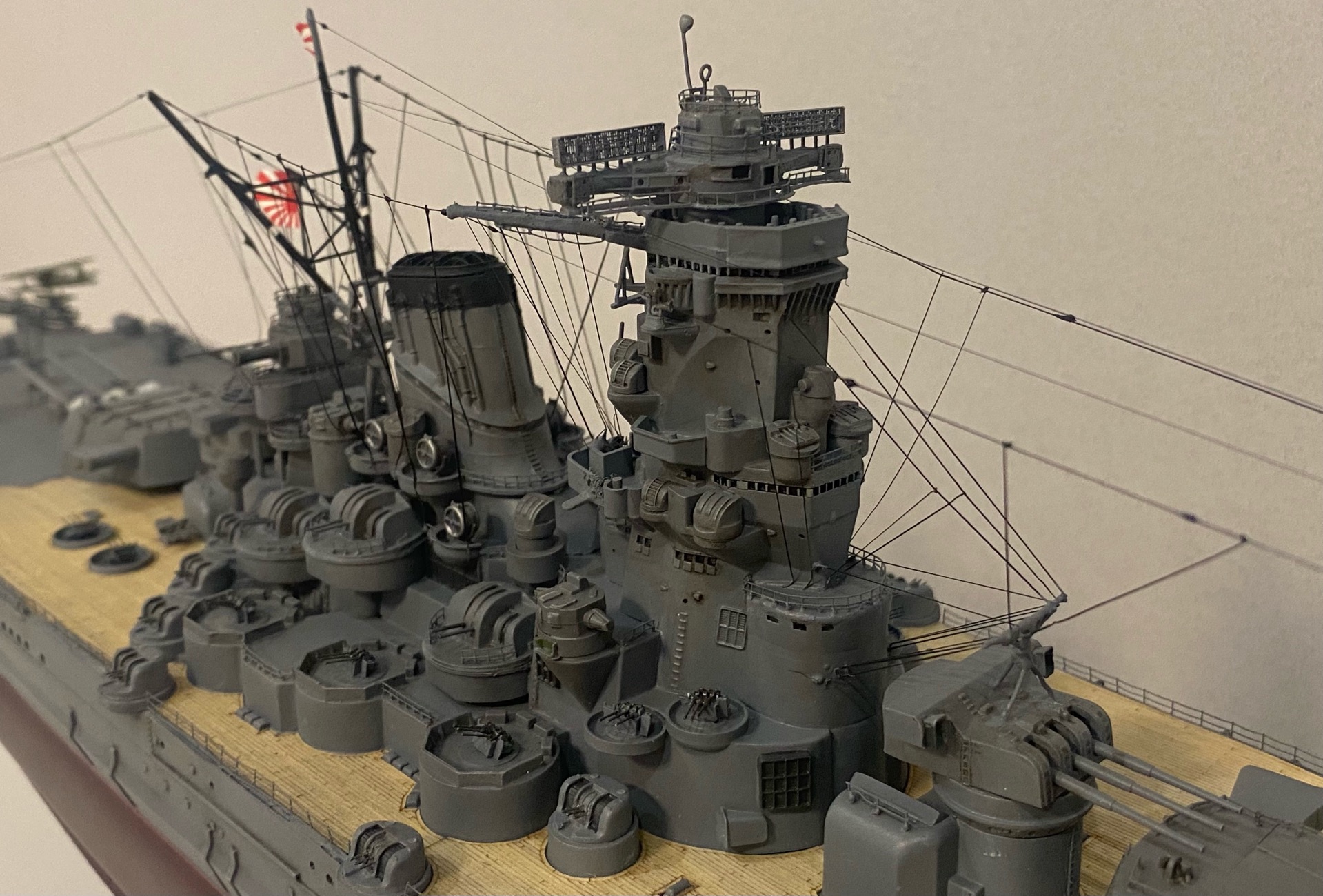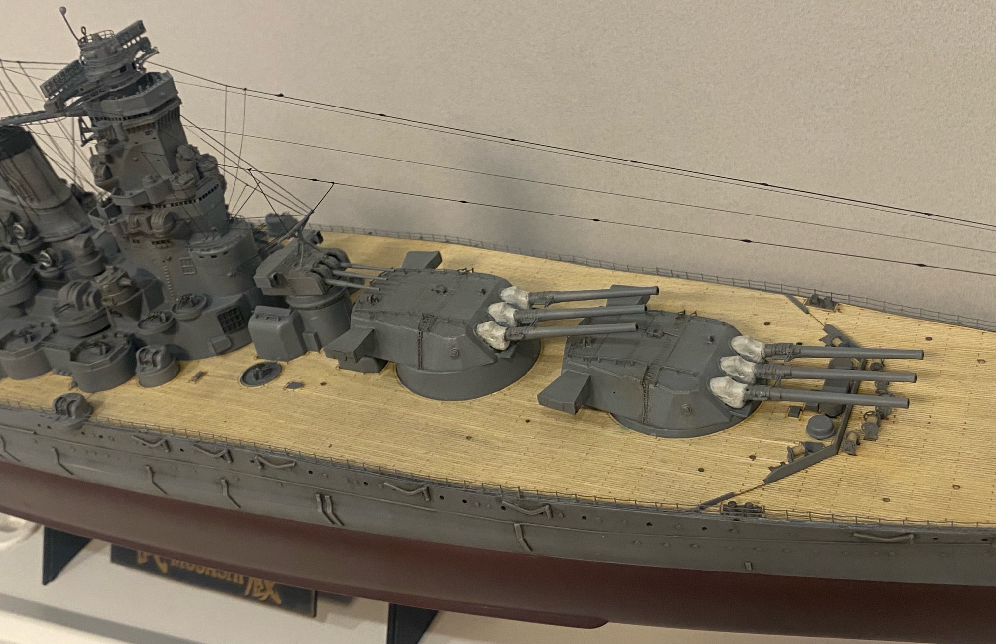 Что сделано полностью самостоятельно: главная мачта, носовая и кормовые мачты, радар (сделано из танковых сеток, но по размерам из Книги про Ямато и Мусаси, стойки радара пришлось сделать не копийными, так как нужный диаметр проволоки не держал форму стоек и не держал решётки и загибался и ломался, так что, наматерившись, я сделал как сделал, а из латунных трубок разного диаметра сделал стволы 127-мм орудий и 25-мм зенитных орудий (тут сделал максимально приближено к масштабу), цепи, якоря, антенны на башнях среднего калибра, некоторые ограждения и……самолёты…..получилось всего два! Пришлось вытачивать крылья, хвосты, поплавки, лопасти, расчалки, такелаж, стойки поплавков ( получилось не очень конечно, но в таком масштабе смотрибельно…я собой оказался доволен, хотя времени на два самолёта ушло столько же, сколько на всё фототравление. Лестницы, трапы, увы на главной надстройке случайно попал пальцем и погнул всё, больше мне восстановить трапы не получилось, поэтому вырезав части от танковых решёток приклеил к пластику и поставил на место…бесит, но делать нечего…