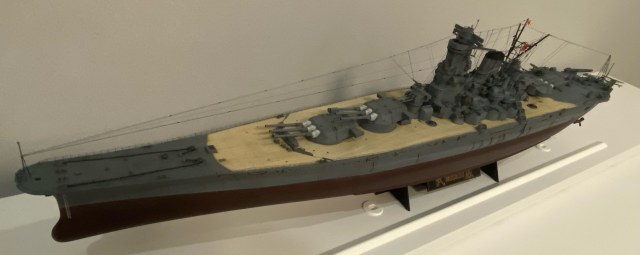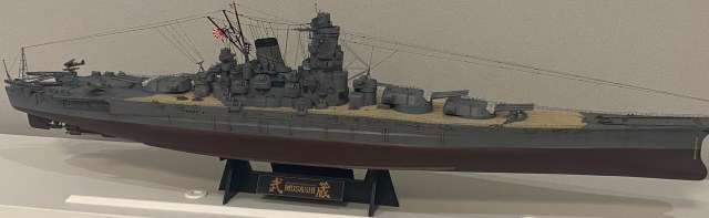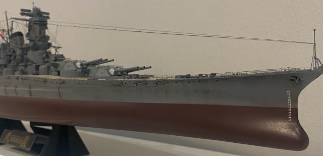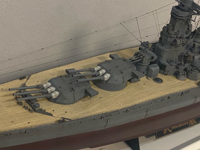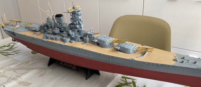 Утром, вынося мусор, увидел на свалке сереющий силуэт, который меня почему то заинтересовал… Подойдя ближе, я понял, что это модель корабля, развернув который (он был в чёрном целлофане), я ахнул, там были остатки японского красавца (то что это Мусаси или Мусаши, я понял потом, по подставке…), который мне всю мою сознательную жизнь очень нравился и, как вы понимаете, я не смог ему дать погибнуть под прессом мусоровоза….. я его забрал домой, преисполненный решимостью его восстановить… можете представить, что ждало меня дома, но делать нечего…и вот, дождавшись, когда все мои уедут на дачу на пару недель, я приступил к задуманному. Скажу сразу, бюджет у меня весьма ограниченный, поэтому развернуться на всю катушку я не смог, но полазив в интернете загодя, мне удалось за небольшие средства, преобрести некоторые дополнения.