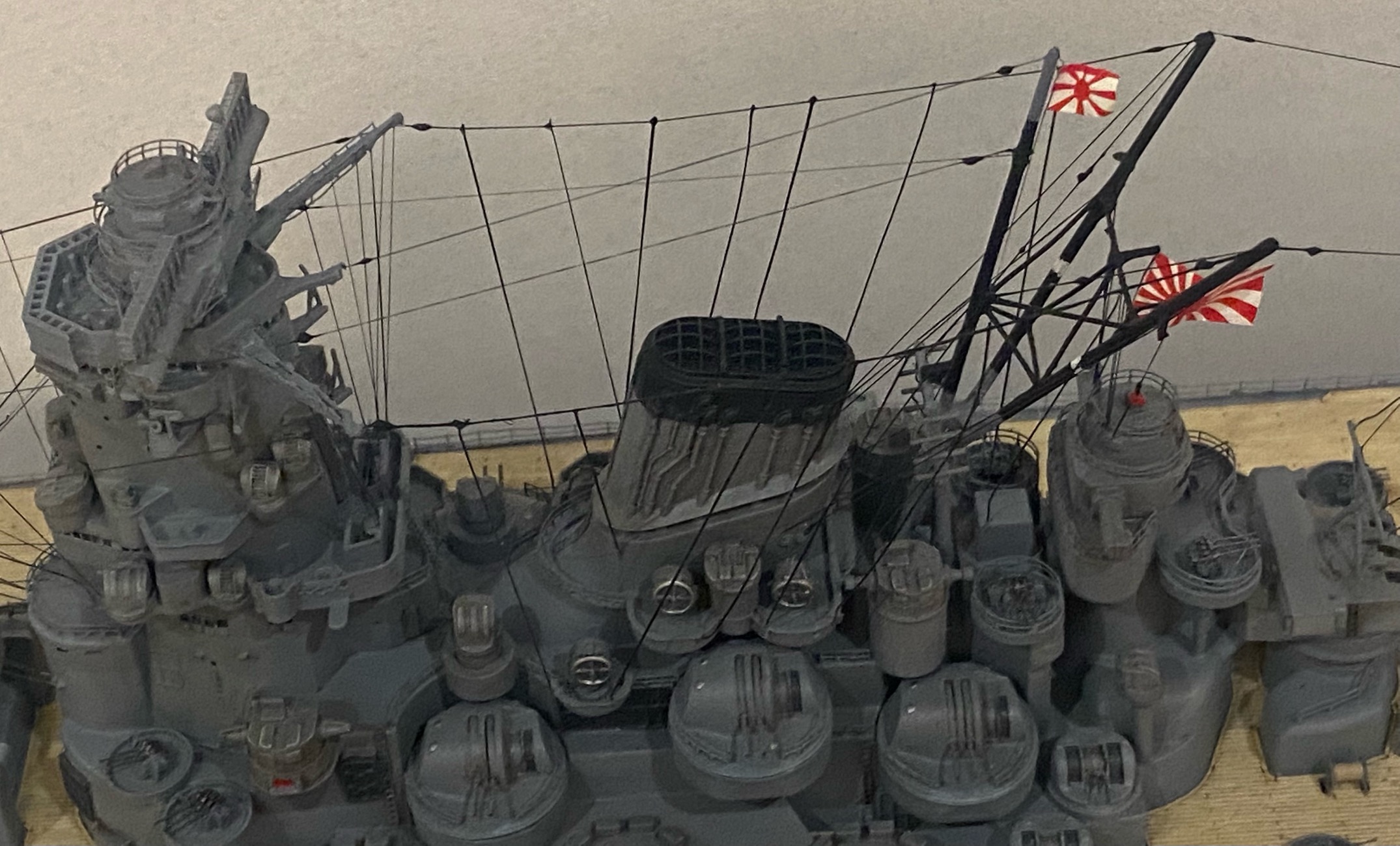 После того, когда всё высохло, я перешёл к такелажу, ё-моё, зачем столько ниток то? Не скажу, что воспроизвёл всё на 100%, но на 80-90 точно. Изоляторы сделал из суперклея, ну и наконец, купил декали флагов японского флота от фирмы Бегемот за 80 рэ…, какие же они качественные на мой взгляд. В качестве основы для флагов я выбрал всё-таки фольгу, на ней цветность проявляется лучше, да и форму можно придать любую!