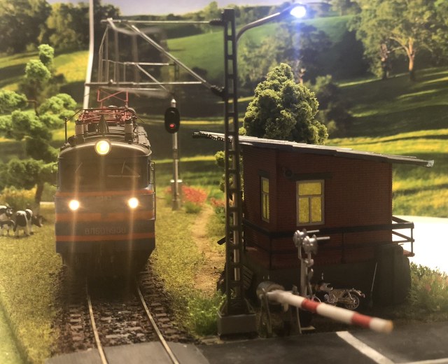 Свет в БФ - светодиоды 0402, в прожекторе 0604, запитаны от 3 вольтовой батарейки через резисторы сопротивления, выключатель спрятан в аккумуляторной батарее локомотива.