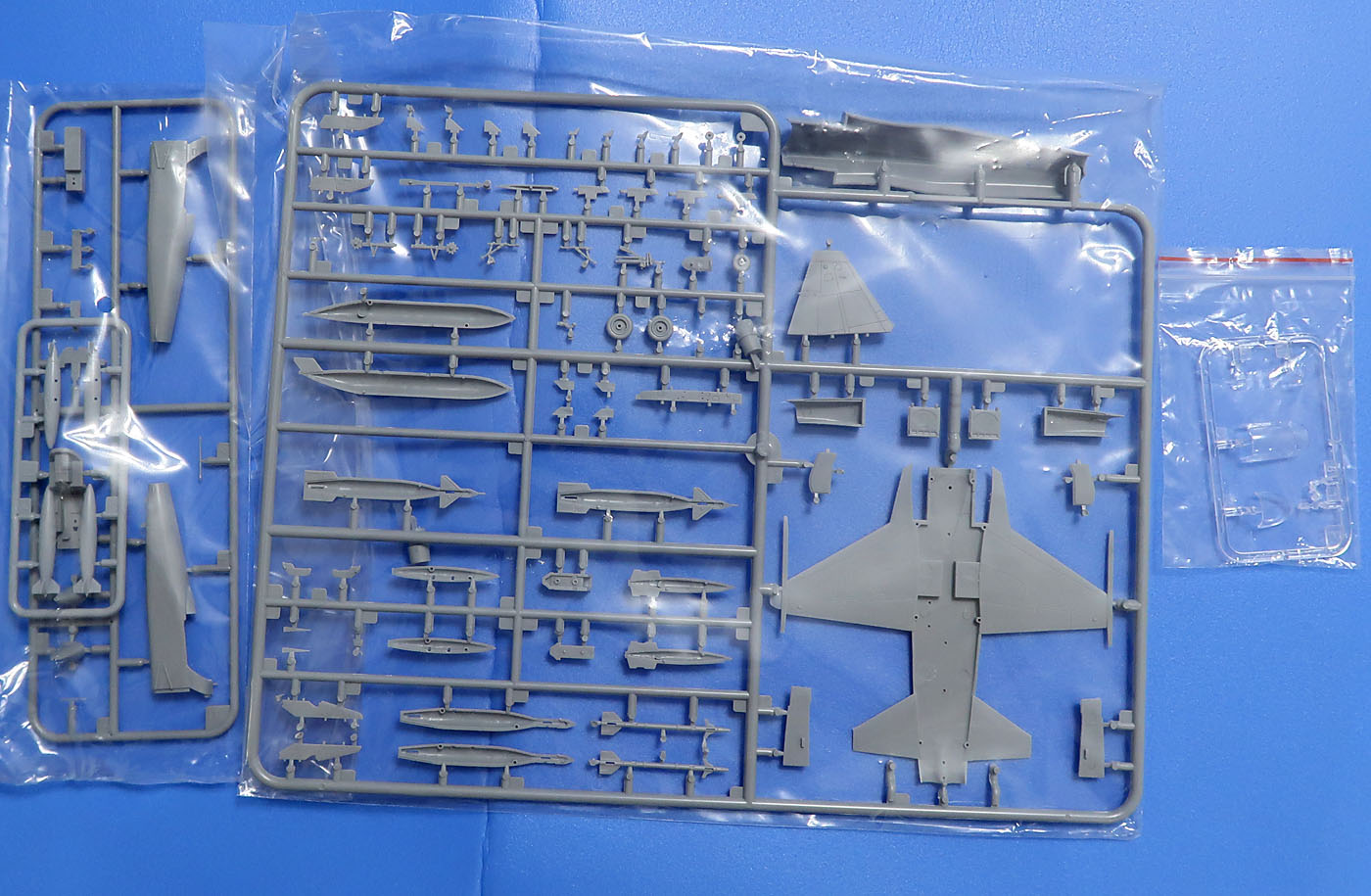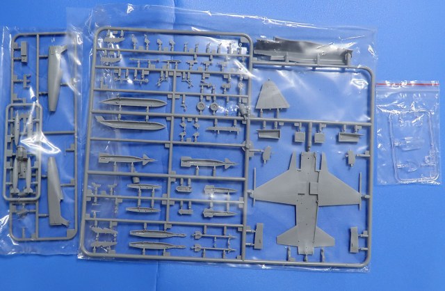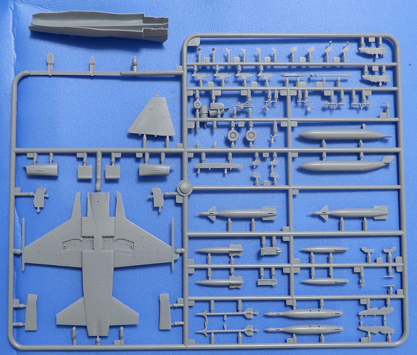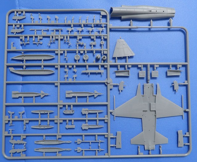 Литник основной - здоровенный. На нем почти всё - низ центроплана с крыльями и стабилизаторами в сборе, верх тушки, шасси, часть вооружения (ракеты и управляемые бомбы) и практически все-все-все.