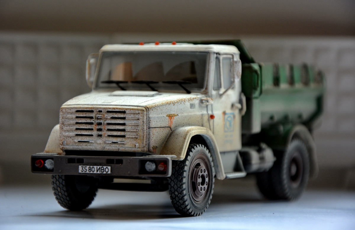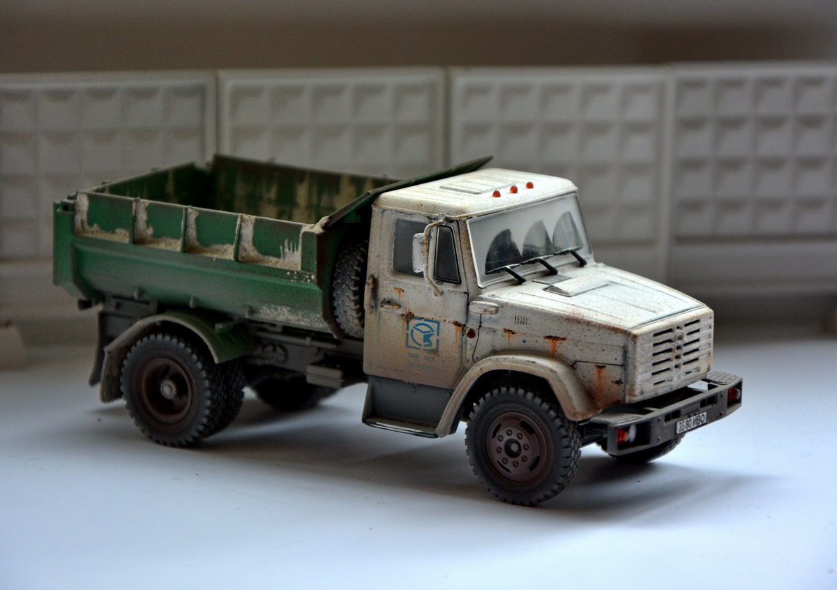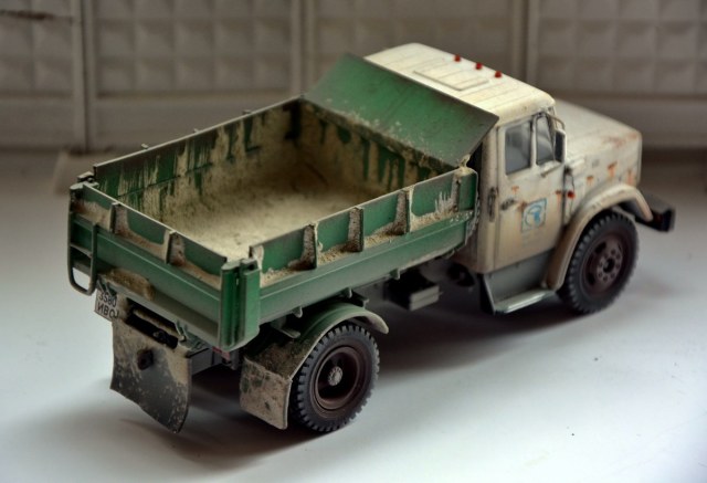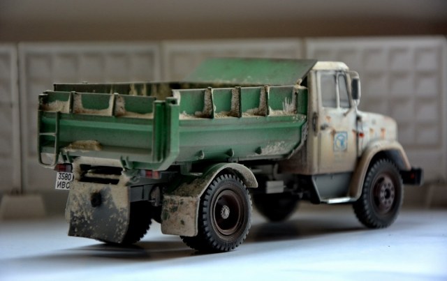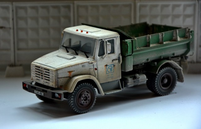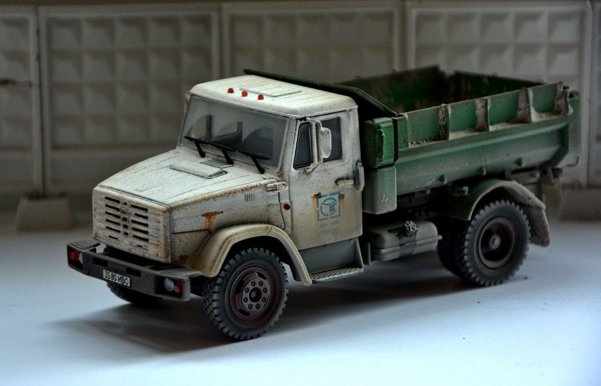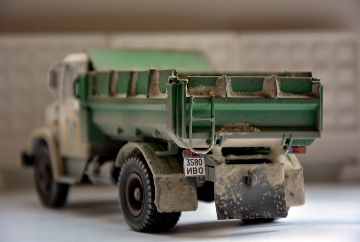 Модель сделана по прототипу оригинала с Ивановской Дск, лестница на заднем борту была на этом самосвале, Сморите фото. Зеркала, Корпусы зеркал, замки капота, дверные ручки, пластиковый дефлектор на капоте были так и покрашены, в условиях мастерской и этому не предавали значения. Задумка была сделать не такой как на вашей фотографии а прототип самосвала Ивановской ДСК и большую часть всех мелочей я сделал, конечно возможно что-то упустил, но это не критично.