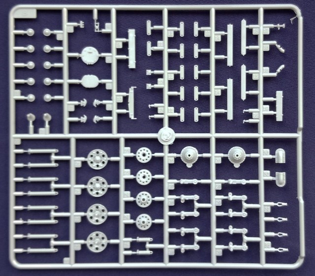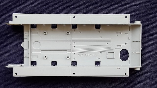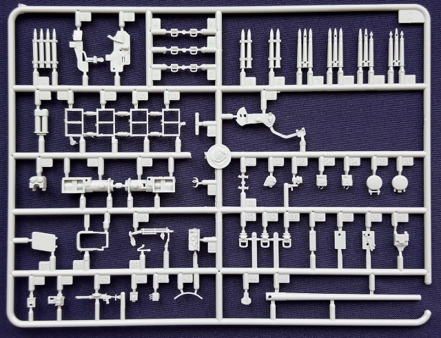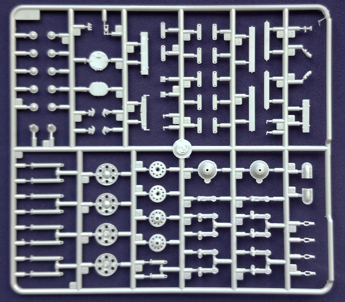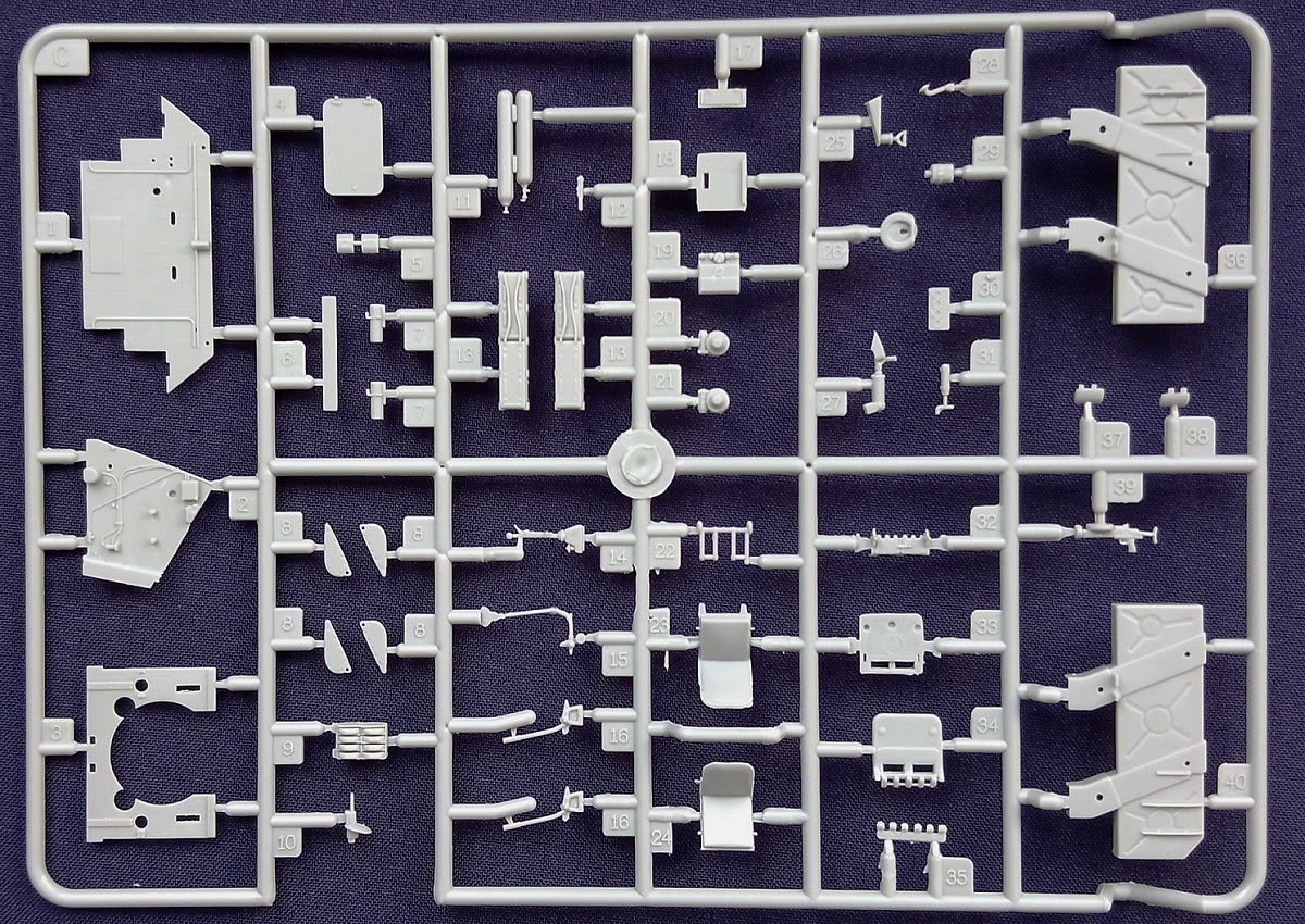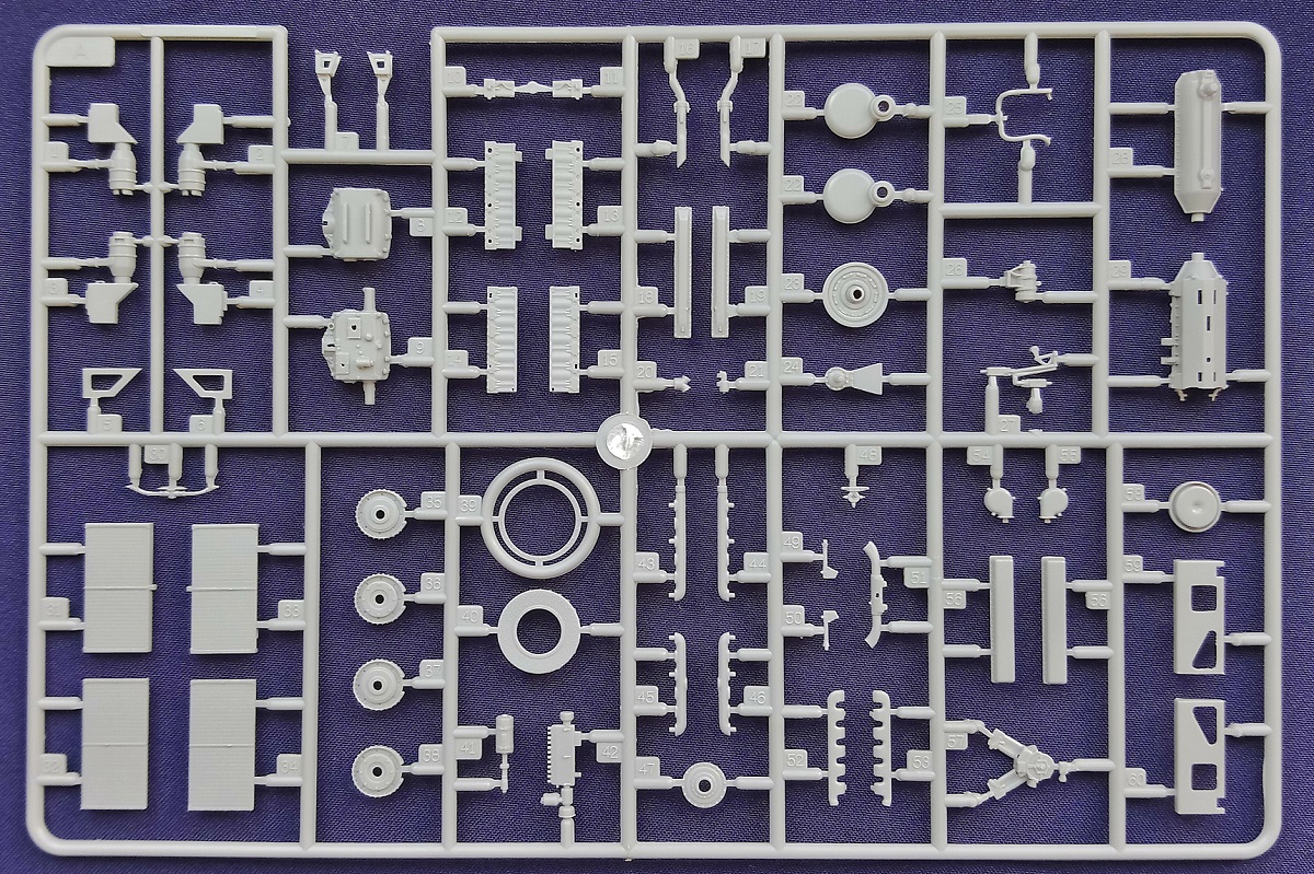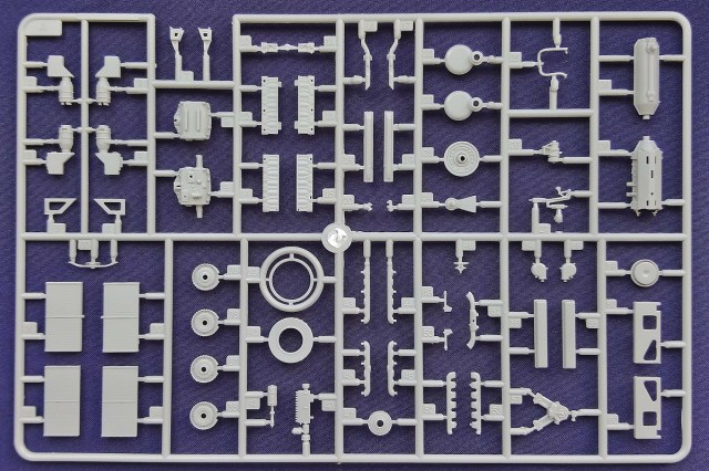 Внутри лежит 8 литниковых рамок из светло-серого пластика, отдельно упакованы детали корпуса (верхняя и нижняя части). Две прозрачные детали стёкол фар, медный трос, лист дакали и инструкция по сборке. Отличительной особенностью является отдельная деталь капота двигателя с уже вставленной сеточкой охлаждения агрегата. Общее количество деталей - 402.