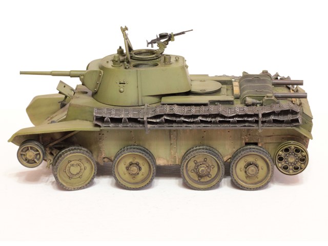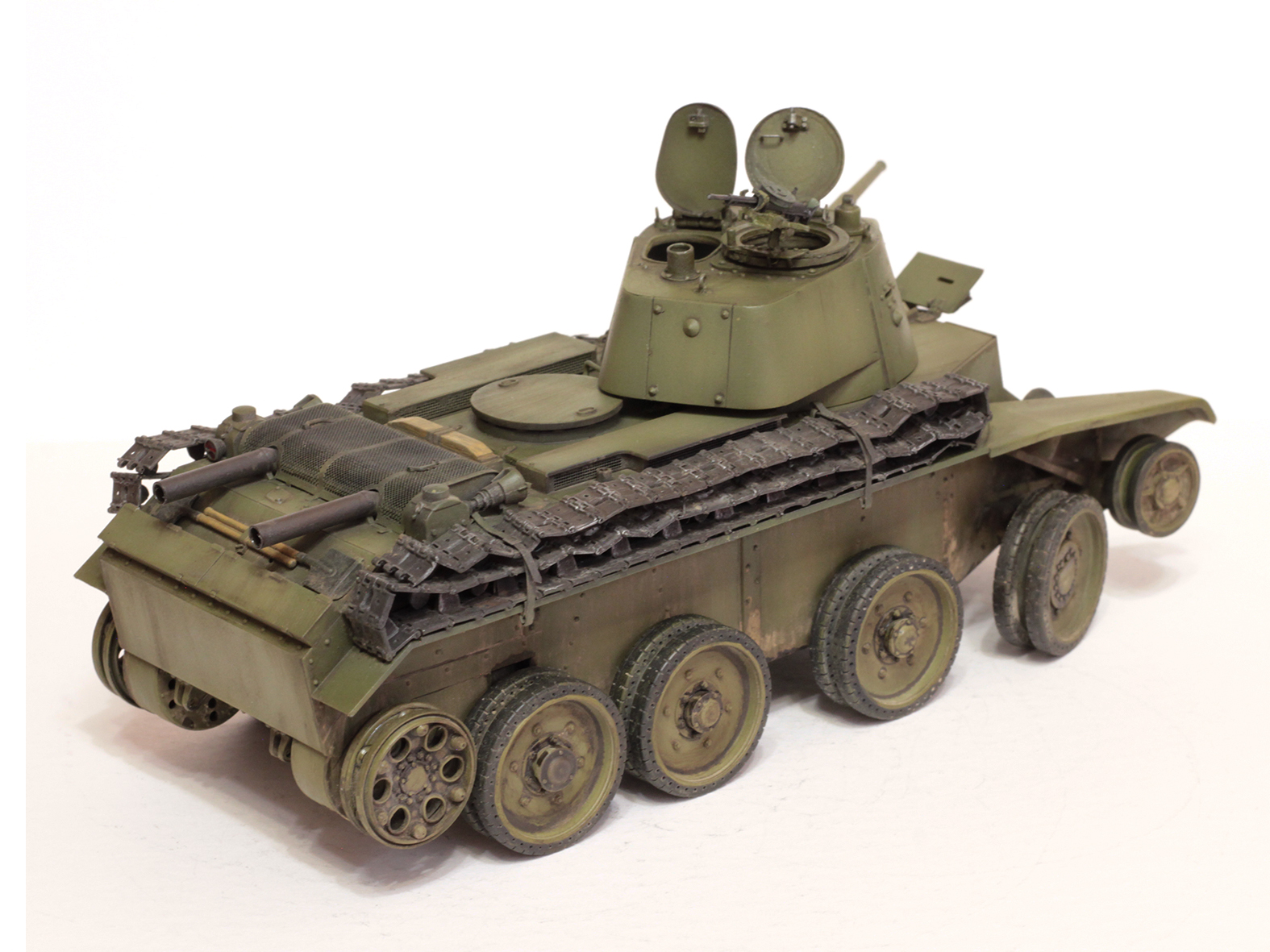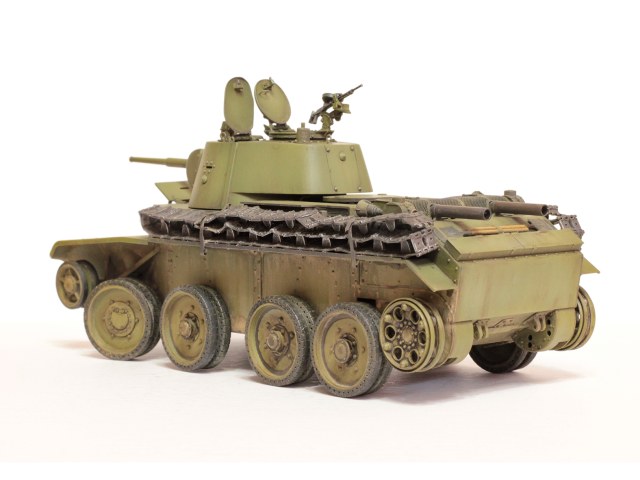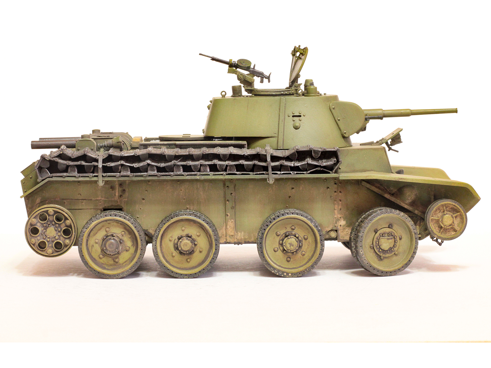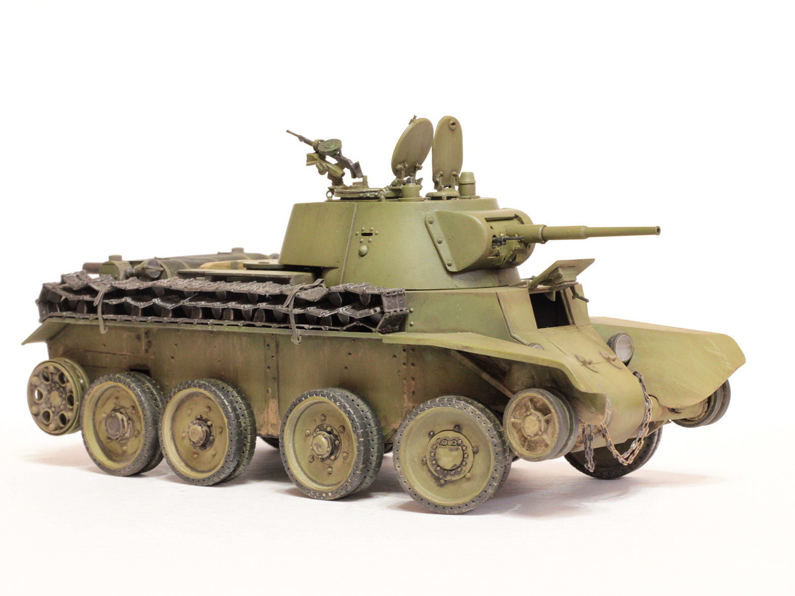 В 1937 году с конвейера сошли танки БТ-7 с конической башней с углом наклона к вертикали в 12 градусов во фронтальном просвете. В боковом просвете наклон лобовой и кормовой частей башни к вертикали составлял соответственно 12 и 13 градусов при толщине броневой плиты в 13 миллиметров. Легкий танк БТ-7 имел колёсно-гусеничный комбинированный движитель, который состоял из двух ведущих задних колёс в диаметре 640 миллиметров, двух передних направляющих колёс в диаметре 550 миллиметров, восьми опорных катков в диаметре 815 миллиметров с бандажами из резины и двух стальных многозвенных гусениц, имеющих ширину трака 263 миллиметра. При движении танка БТ-7 на колёсном ходу гусеницы снимались, демонтировались на четыре составляющие и помещались в надгусеничные полки. Привод при движении танка на колесном ходу производился на задние опорные катки, а управление – через поворот передних катков.