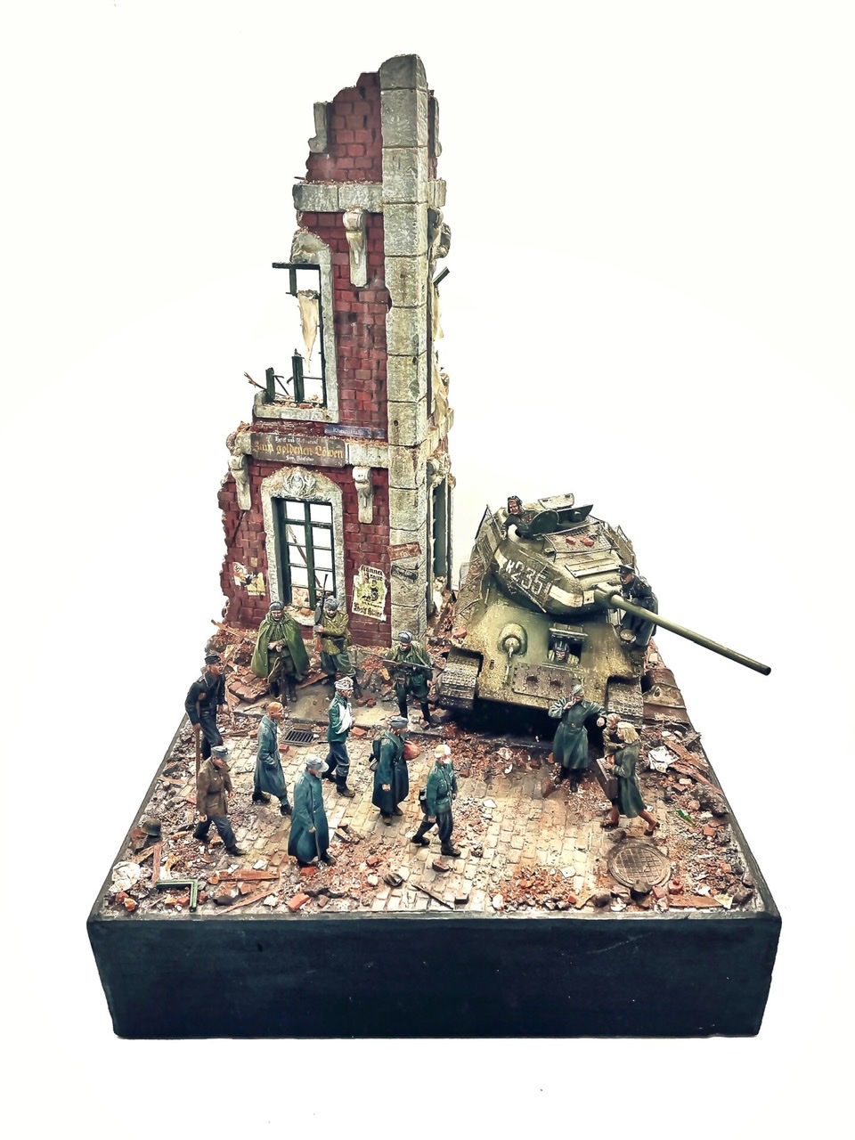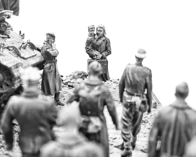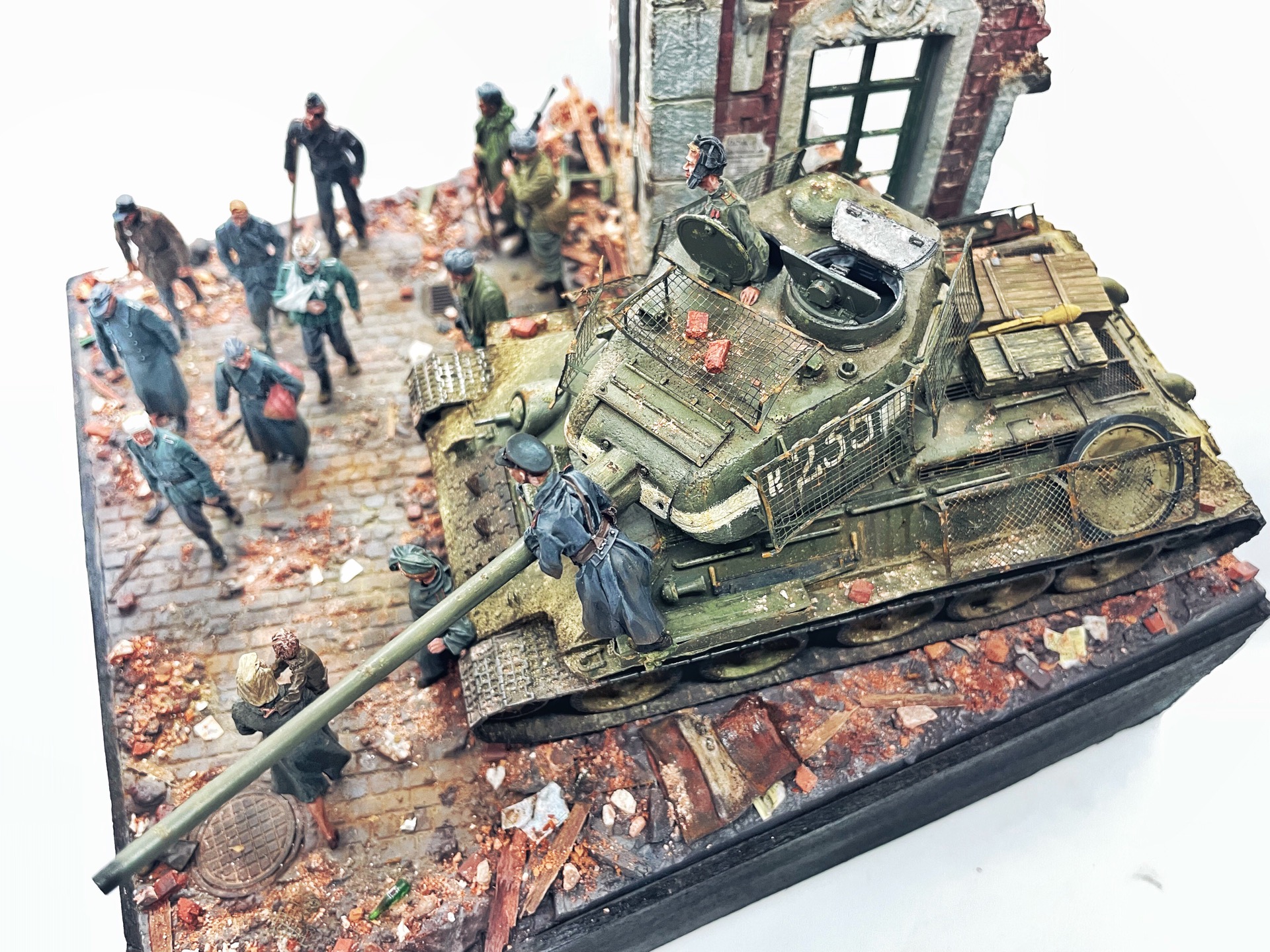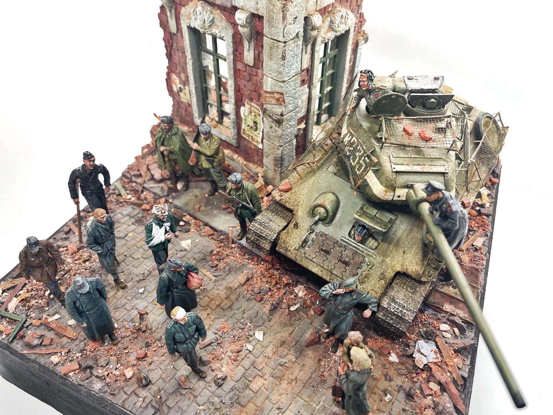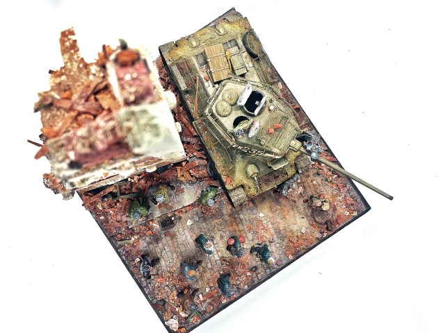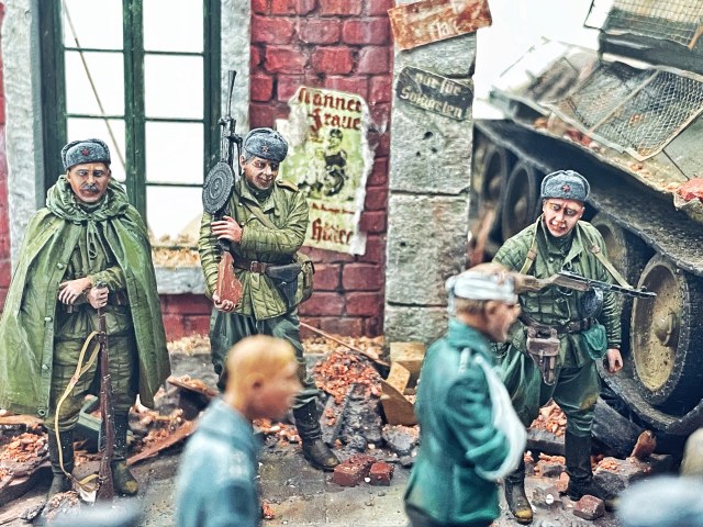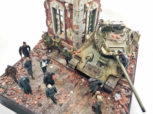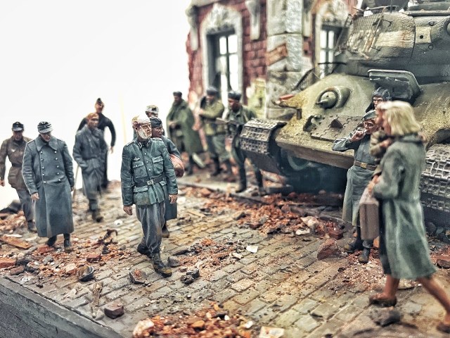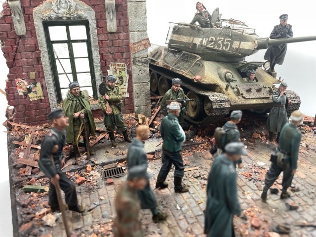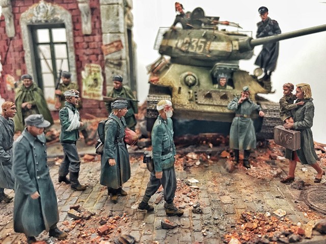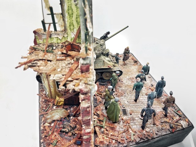 Отличная диарама. Виден огромный объём работы. Сюжетно. Чувствется хаос и разруха города после завершенных боёв. Есть дух времени. Единственное что так не понравилось совмещение двух совершенно противоположных по настроению сюжетов - с одной стороны бравые улыбающися советские бойцы победители с ухмылкой смотрящие на поверженного врага и с другой женщина и жмурик за стеной дома. На мой взгляд совсем лишний... Это диарама, из неё кино не сделать