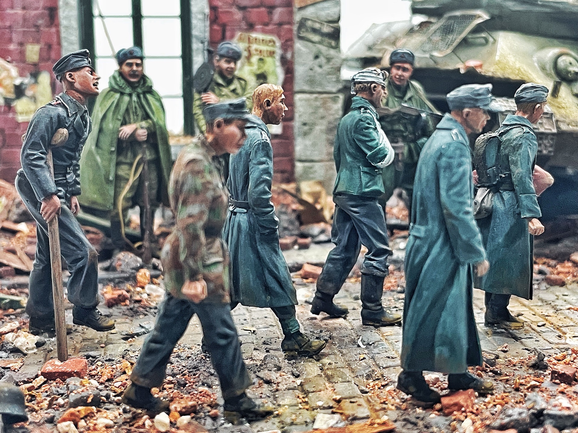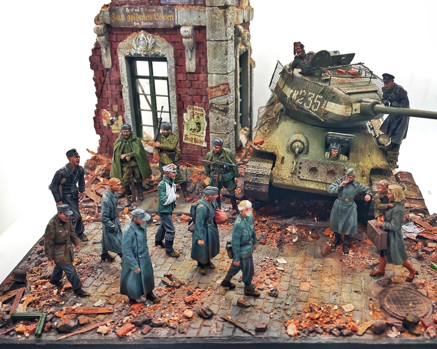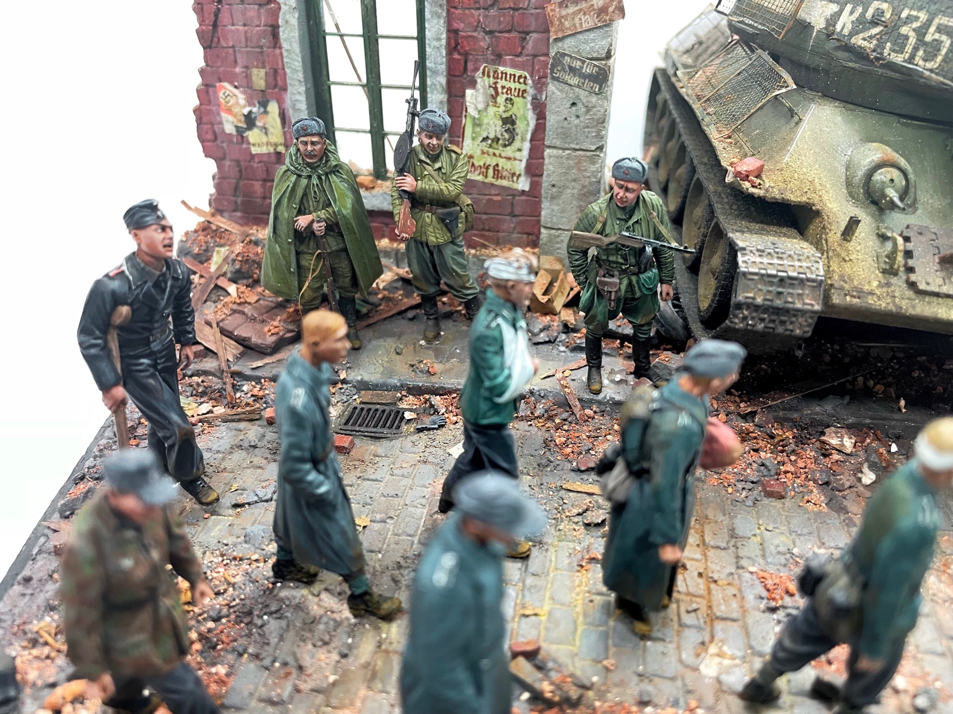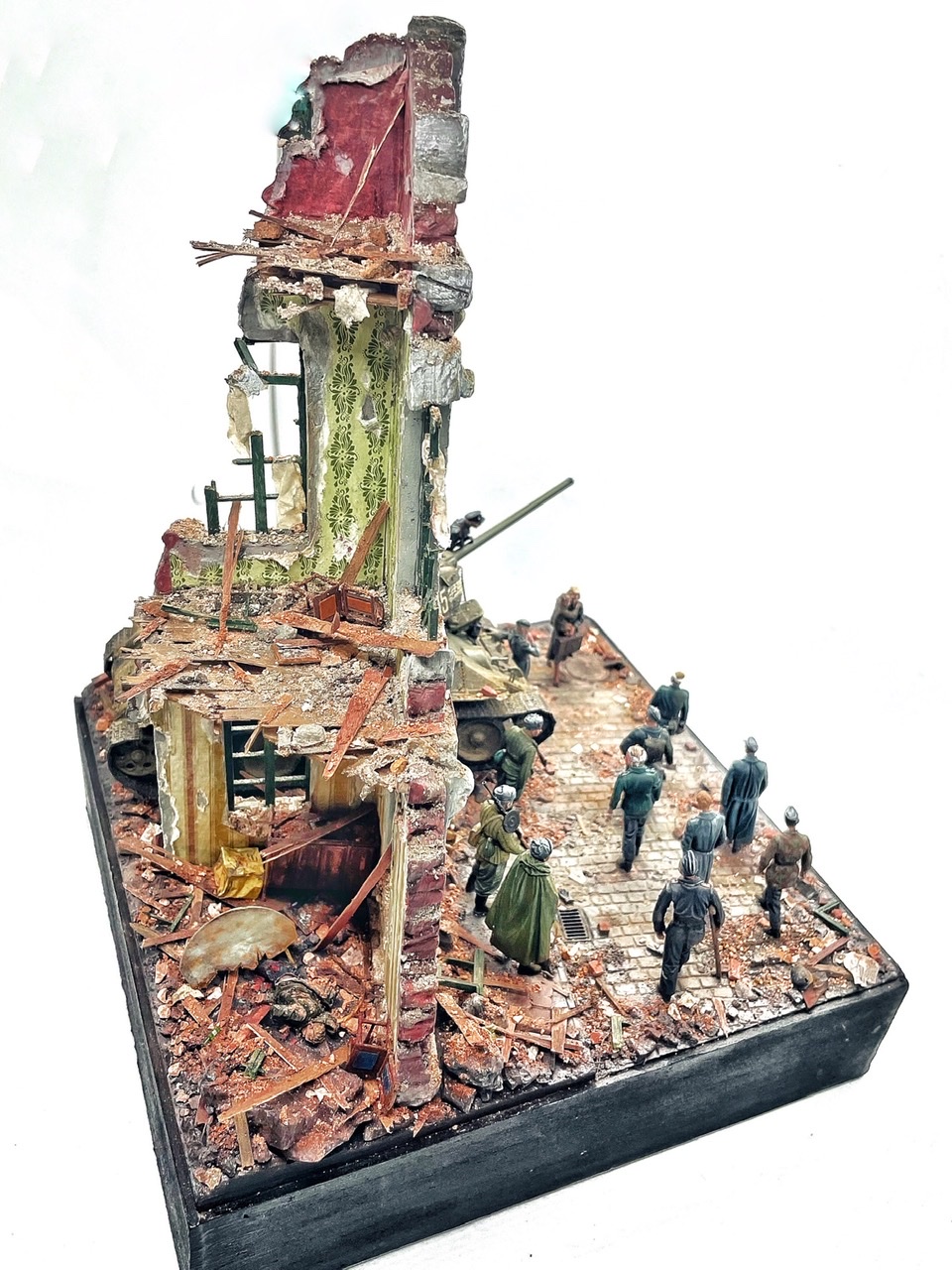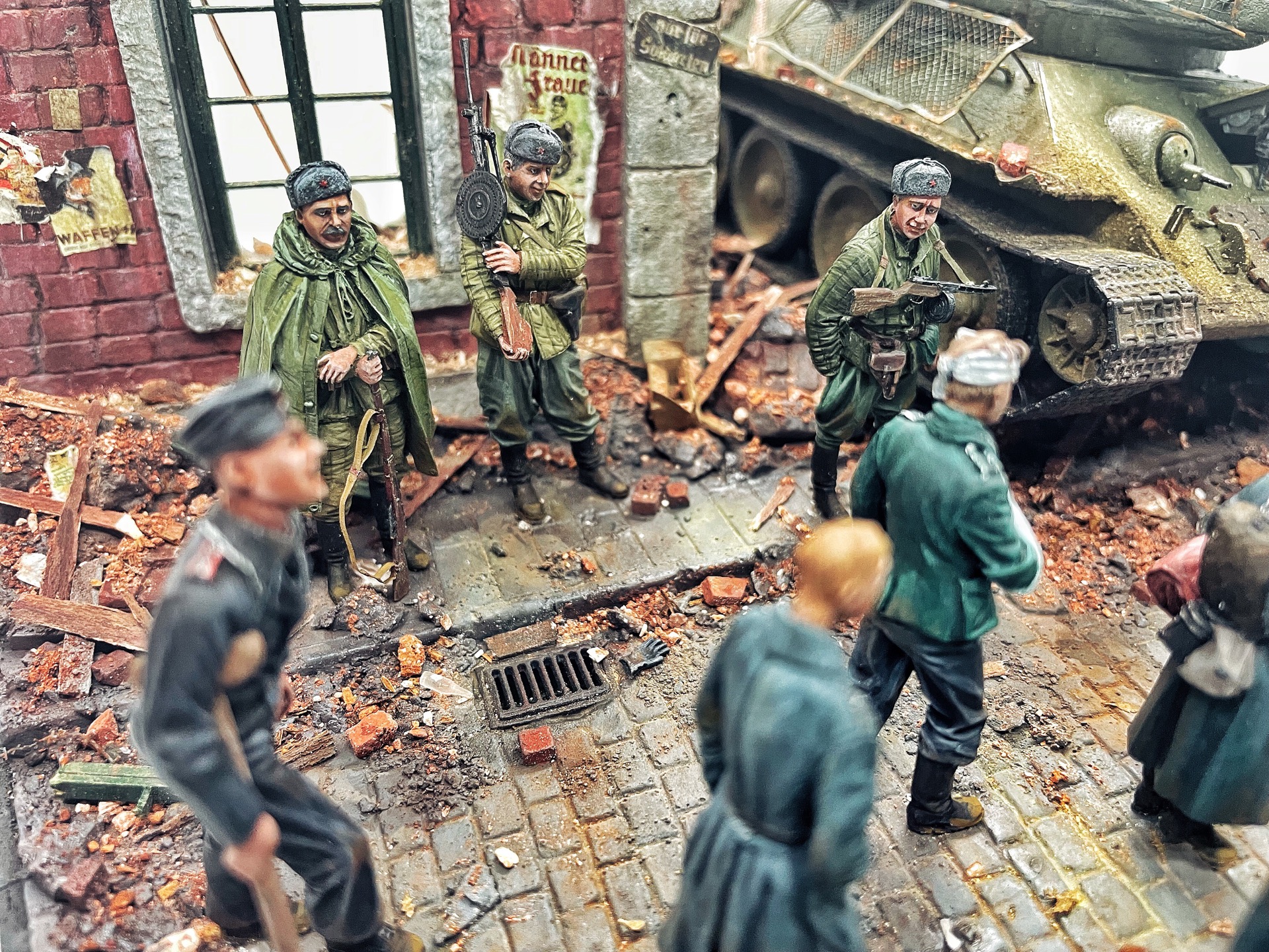 Отличная диарама. Виден огромный объём работы. Сюжетно. Чувствется хаос и разруха города после завершенных боёв. Есть дух времени. Единственное что так не понравилось совмещение двух совершенно противоположных по настроению сюжетов - с одной стороны бравые улыбающися советские бойцы победители с ухмылкой смотрящие на поверженного врага и с другой женщина и жмурик за стеной дома. На мой взгляд совсем лишний... Это диарама, из неё кино не сделать