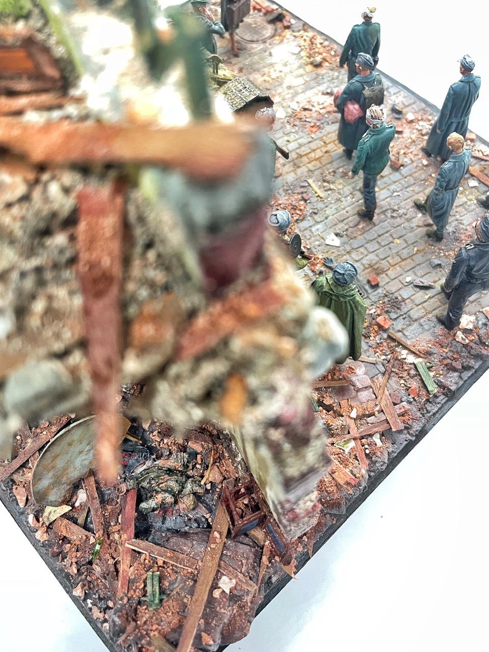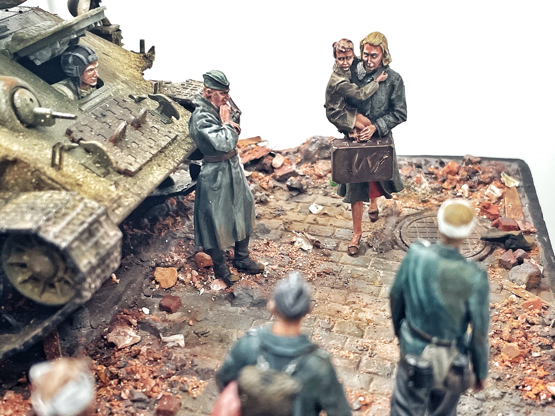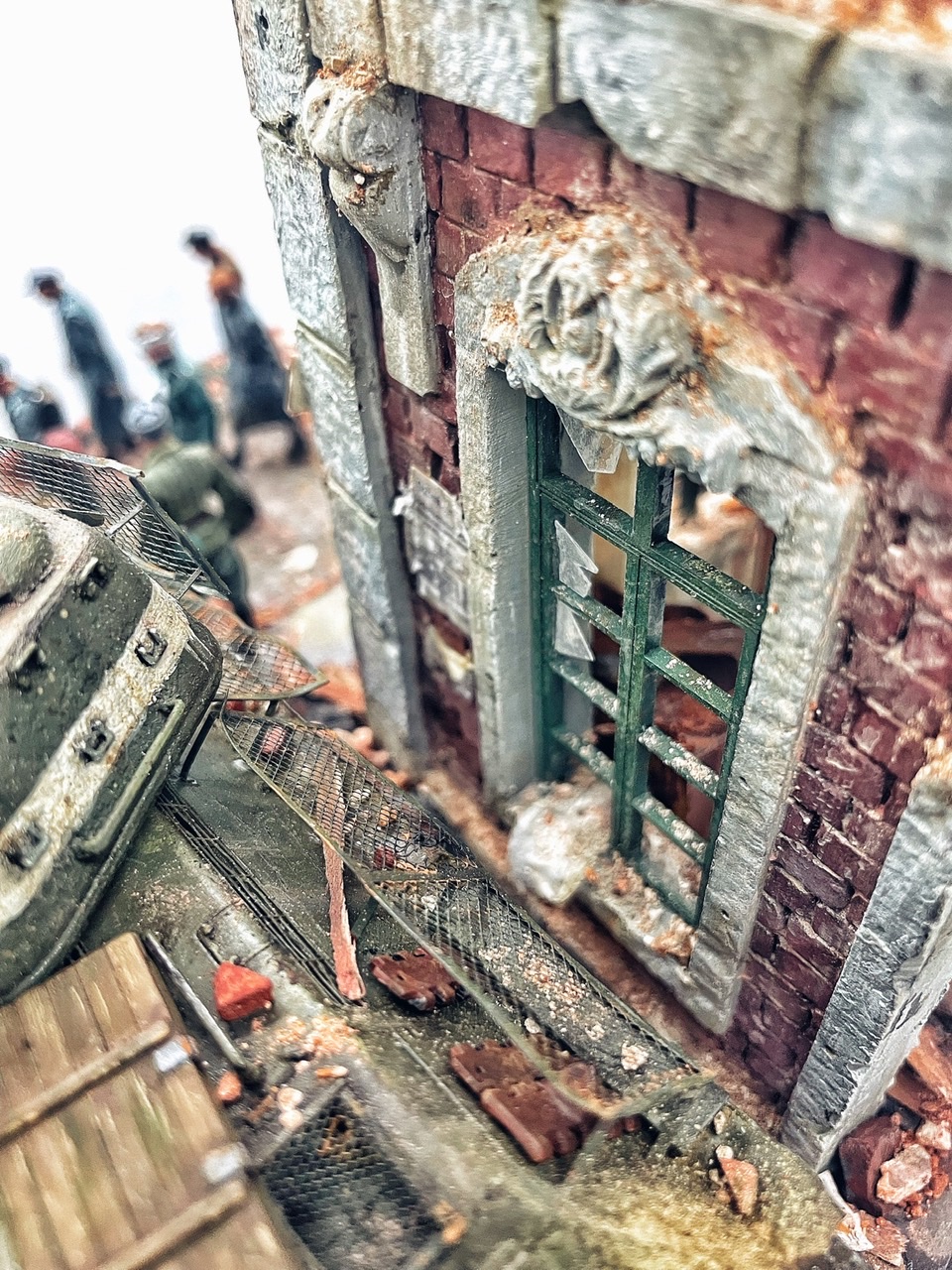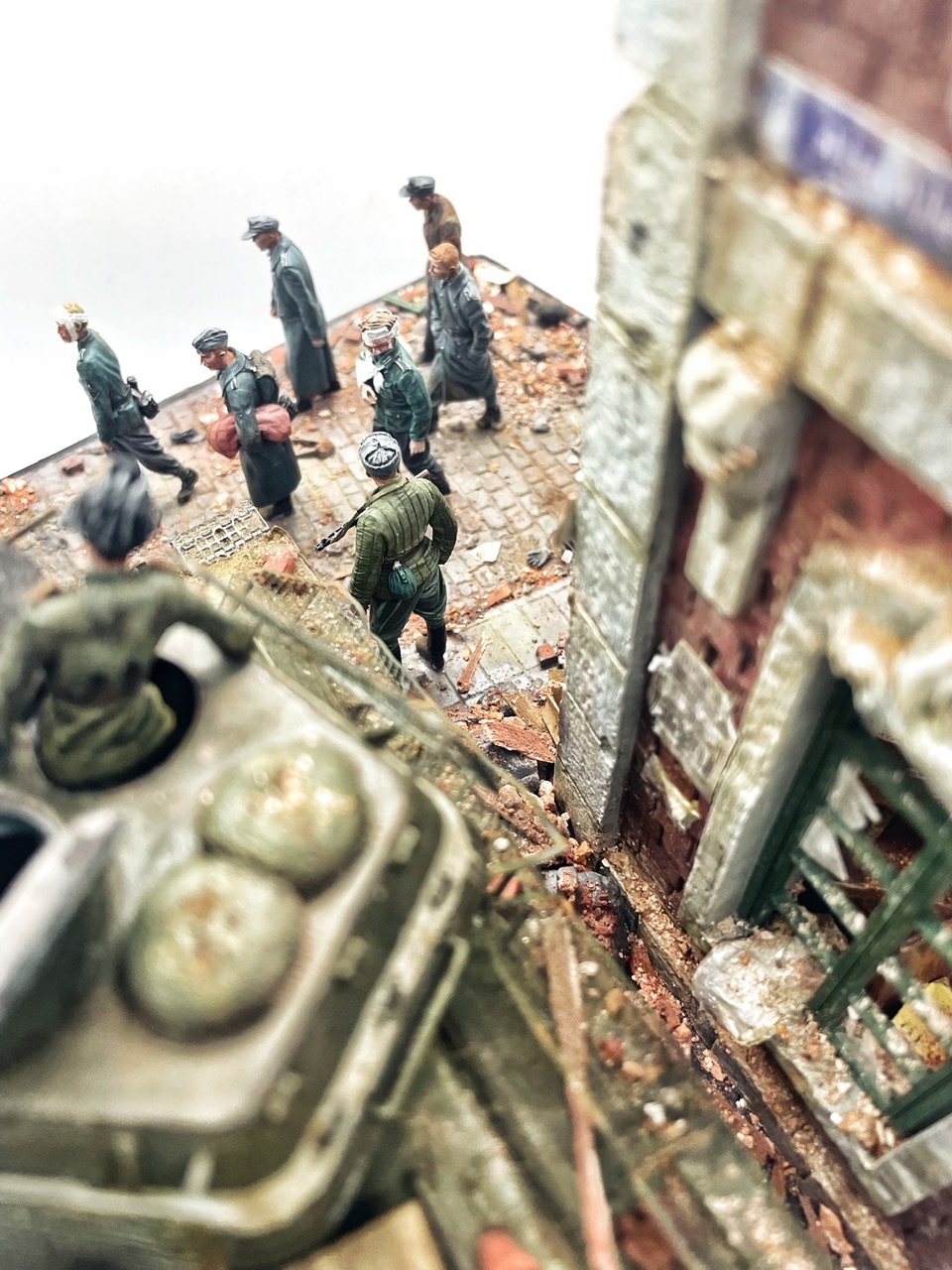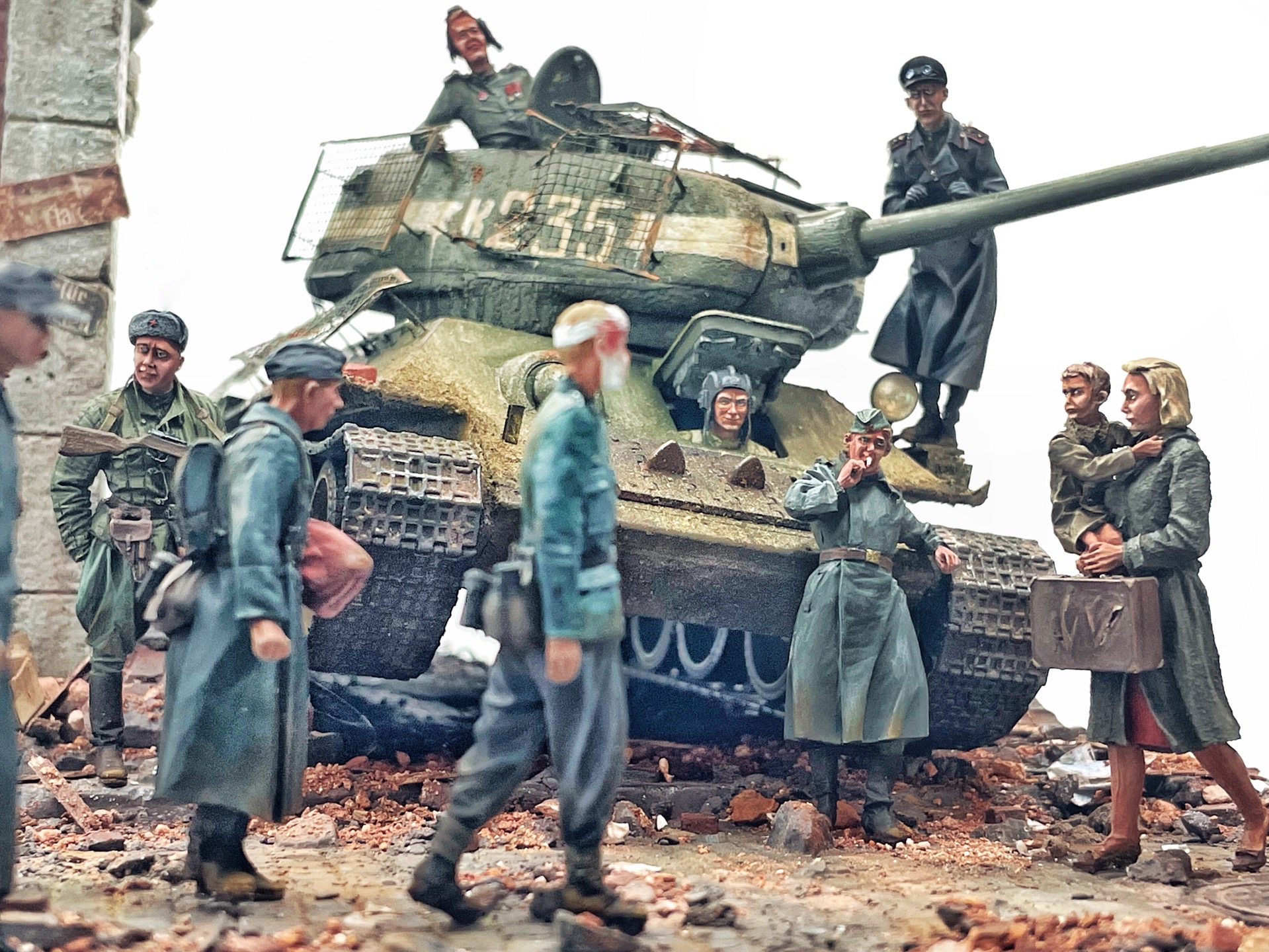 Отличная диарама. Виден огромный объём работы. Сюжетно. Чувствется хаос и разруха города после завершенных боёв. Есть дух времени. Единственное что так не понравилось совмещение двух совершенно противоположных по настроению сюжетов - с одной стороны бравые улыбающися советские бойцы победители с ухмылкой смотрящие на поверженного врага и с другой женщина и жмурик за стеной дома. На мой взгляд совсем лишний... Это диарама, из неё кино не сделать