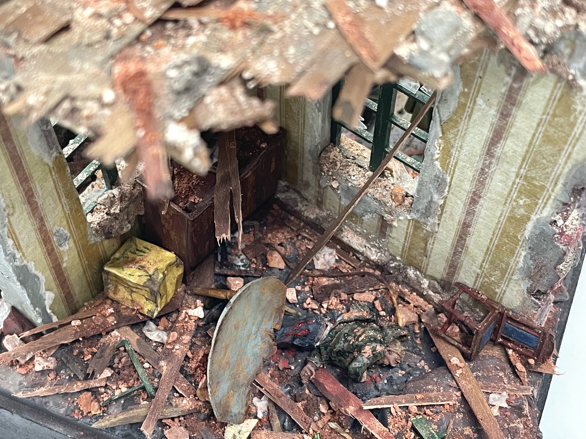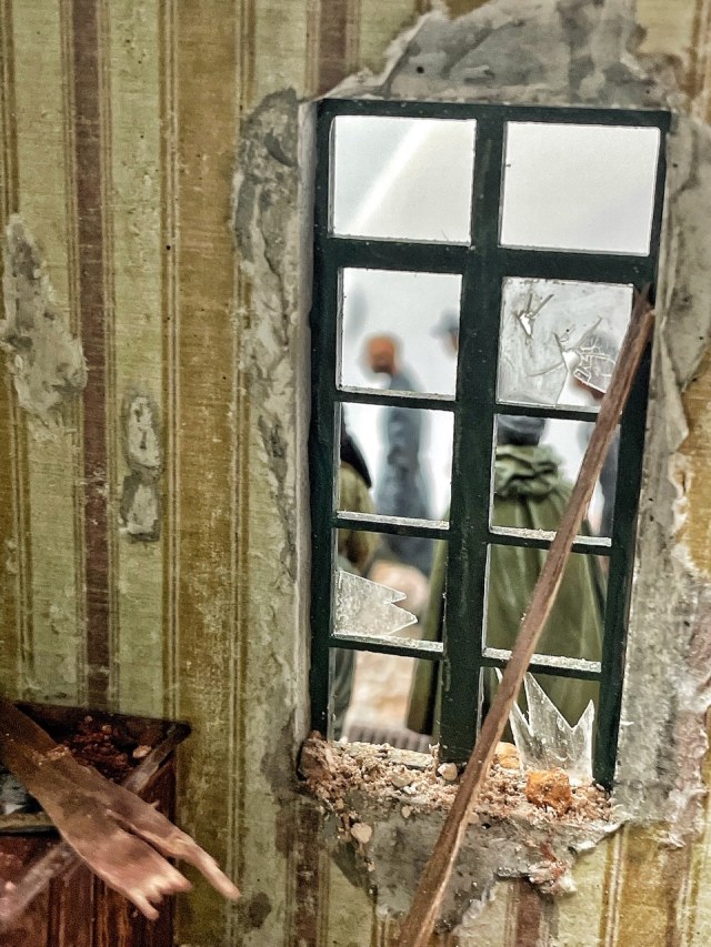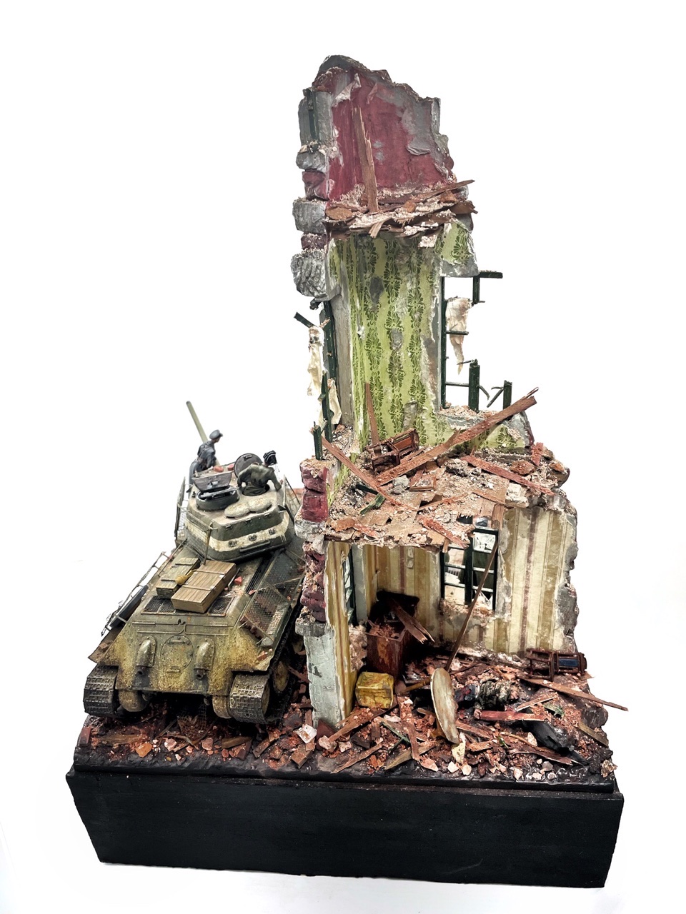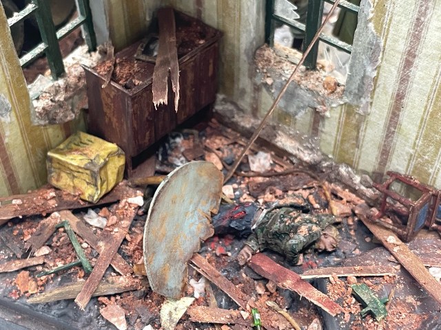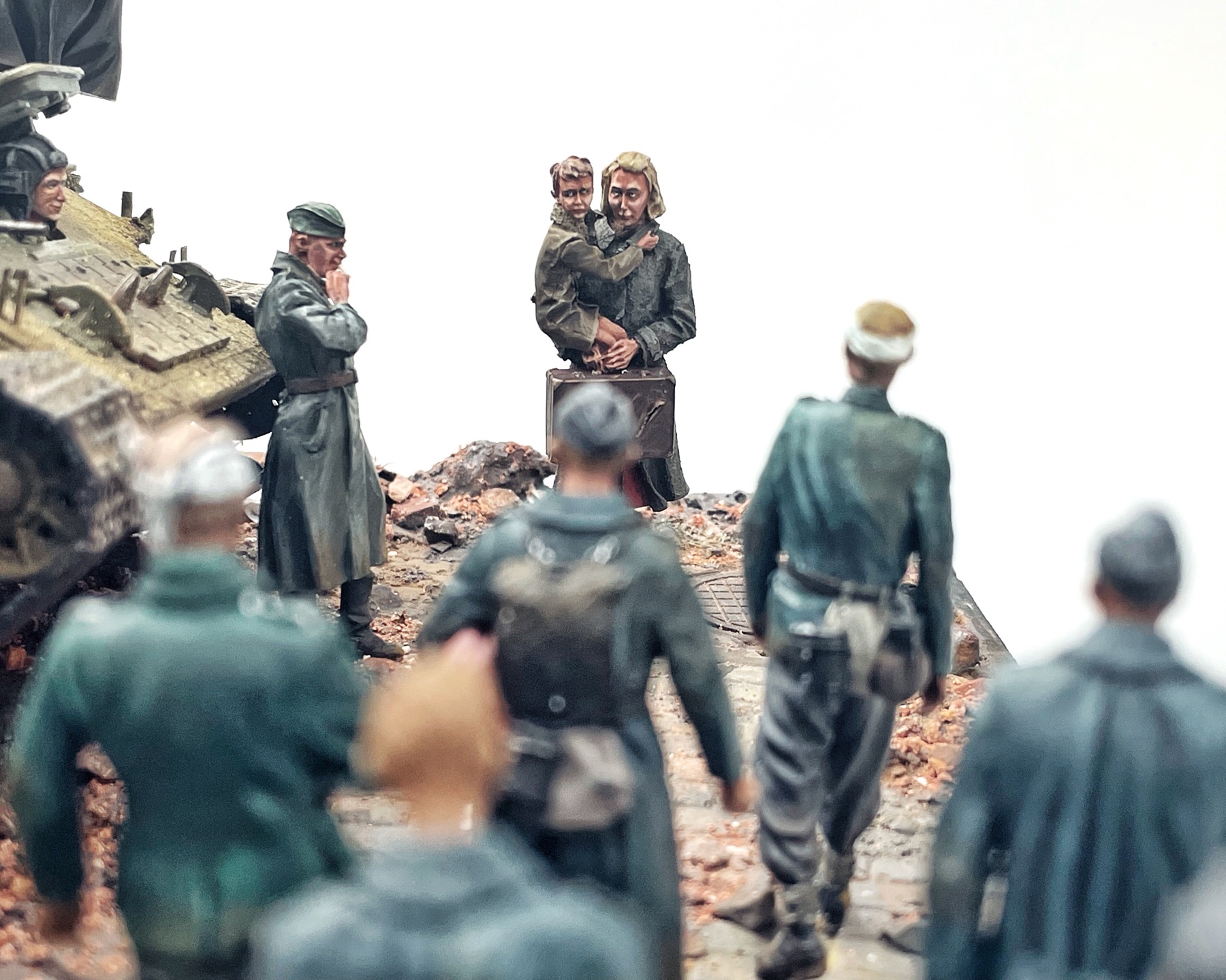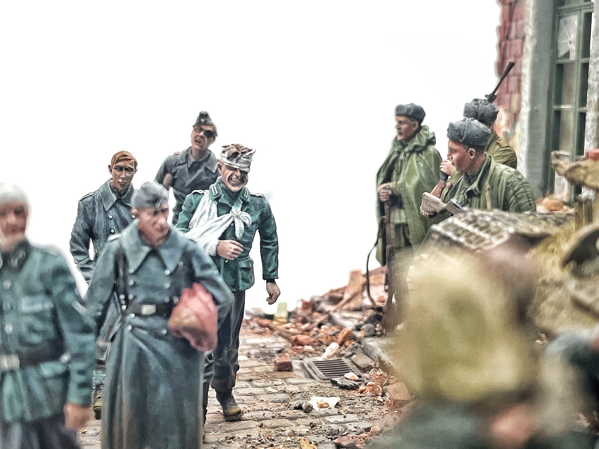 Отличная диарама. Виден огромный объём работы. Сюжетно. Чувствется хаос и разруха города после завершенных боёв. Есть дух времени. Единственное что так не понравилось совмещение двух совершенно противоположных по настроению сюжетов - с одной стороны бравые улыбающися советские бойцы победители с ухмылкой смотрящие на поверженного врага и с другой женщина и жмурик за стеной дома. На мой взгляд совсем лишний... Это диарама, из неё кино не сделать