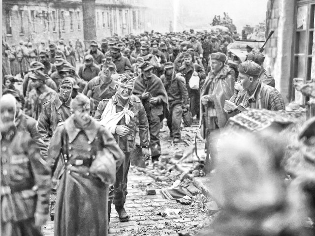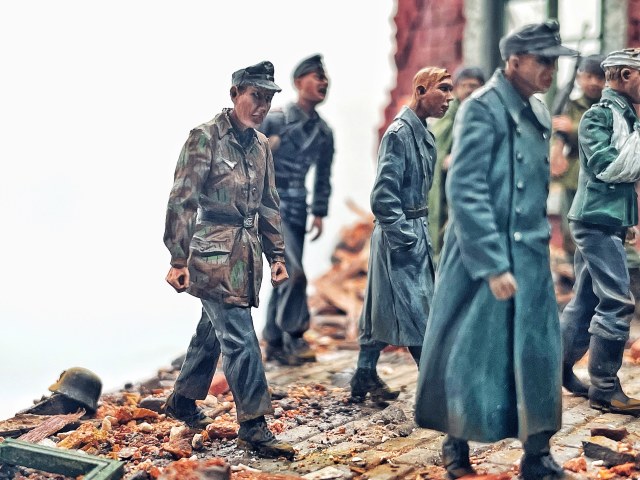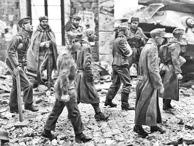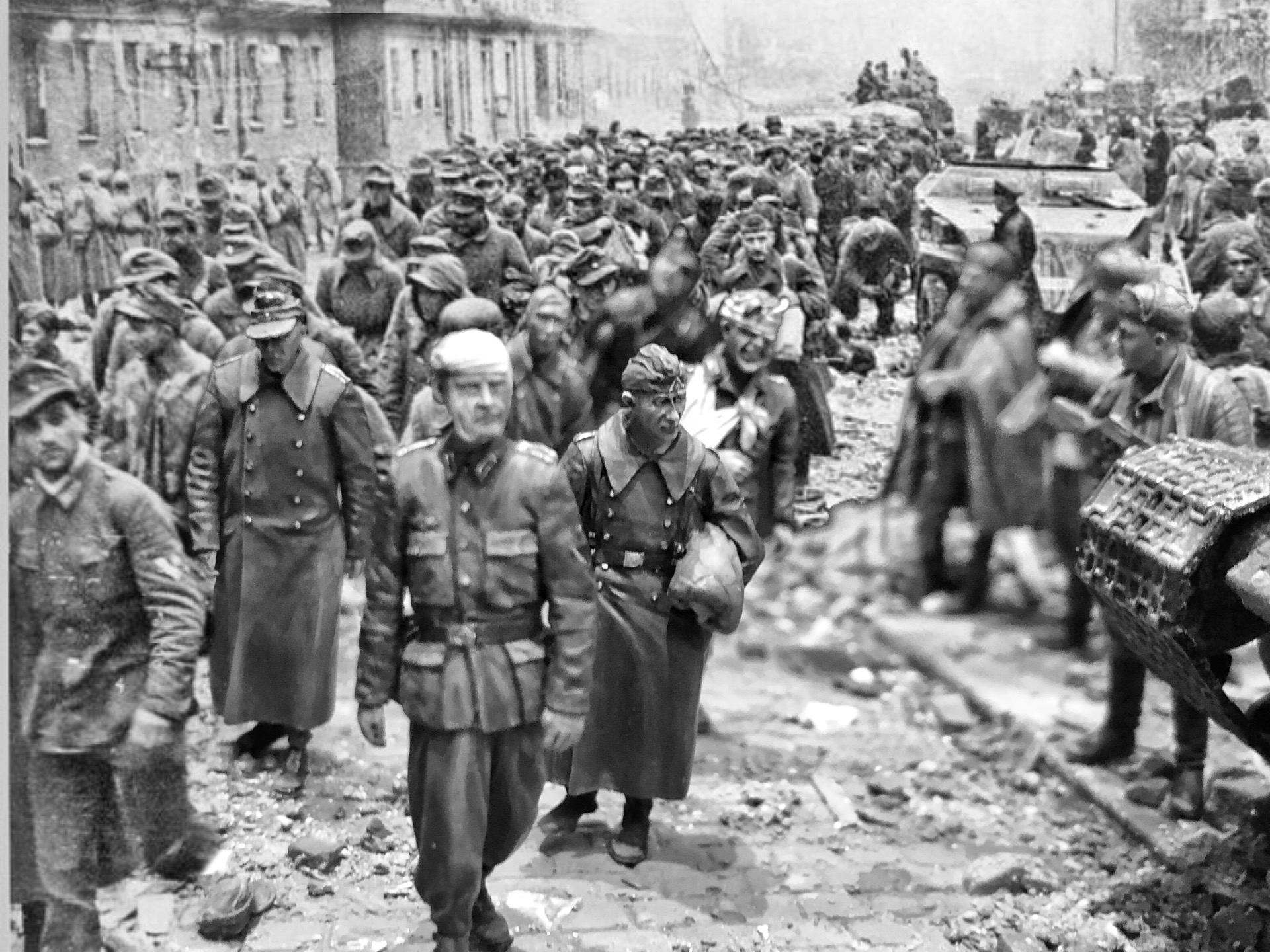 Просматривая бесчисленные фотографии финального этапа ВОВ, захотелось воплотить в жизнь такой сюжет. Колонны немецких военнопленных..Мирные жители на улицах Берлина..Советские солдаты, с любопытством наблюдающие за вчерашними ненавистными врагами..Ребенок на руках матери, всматривающийся в колонны пленных с надеждой увидеть своего живого отца..
