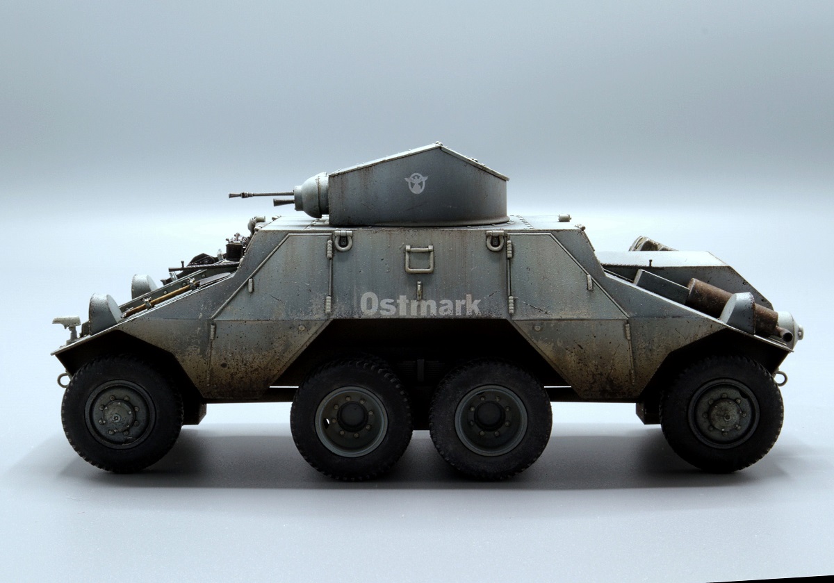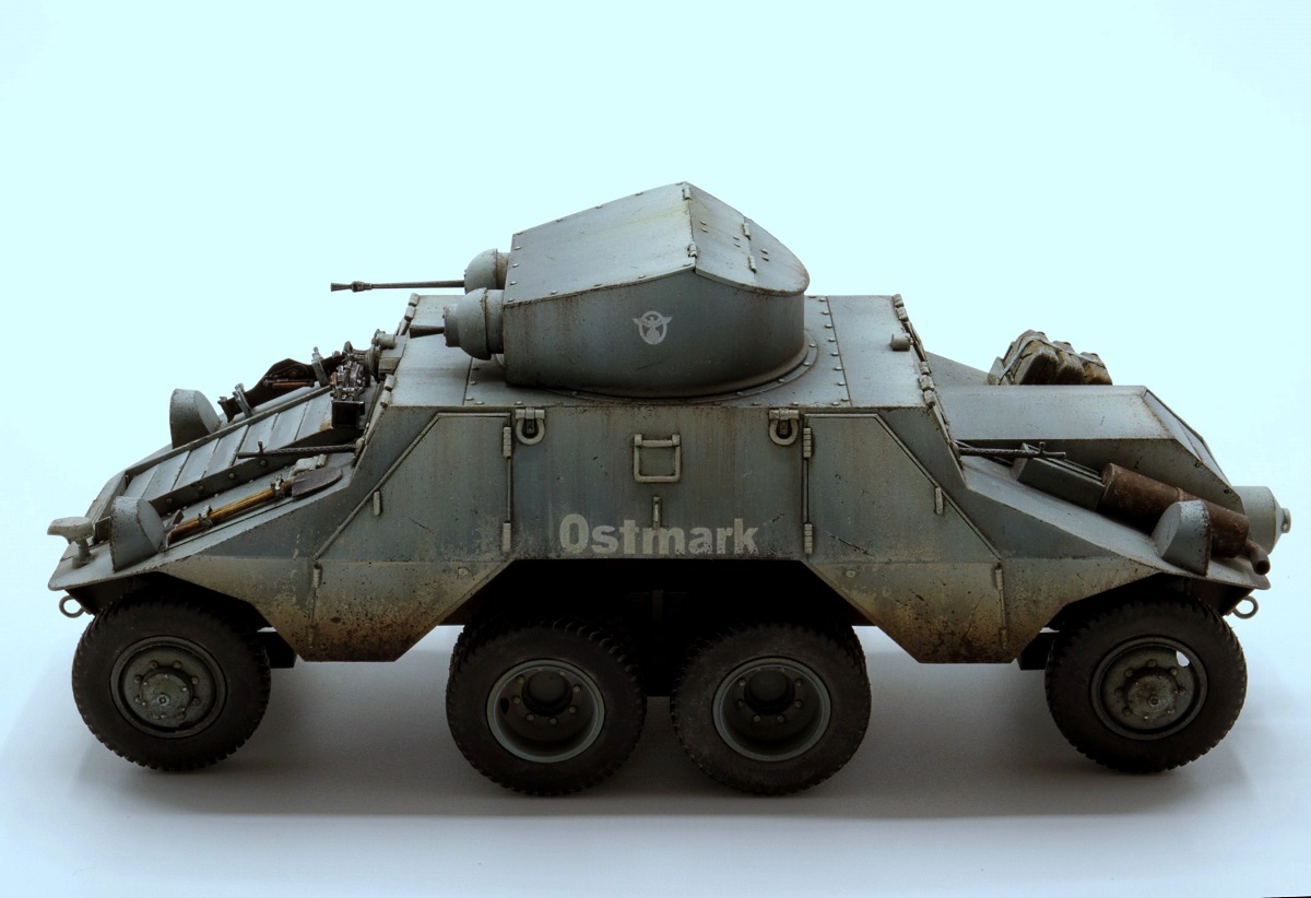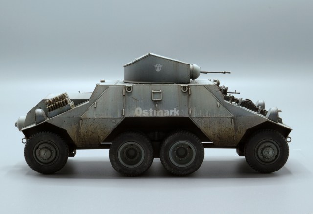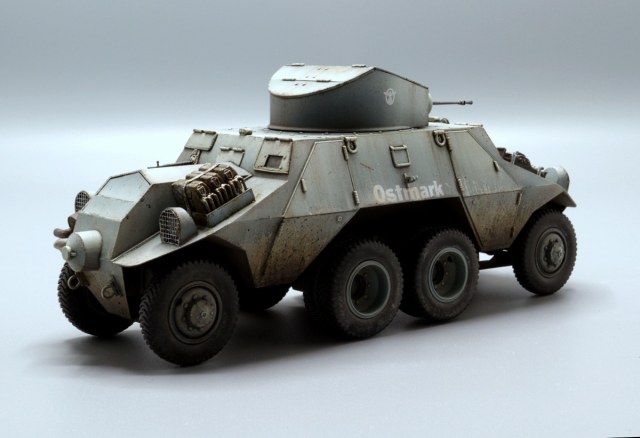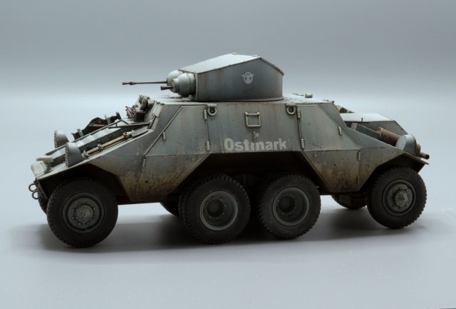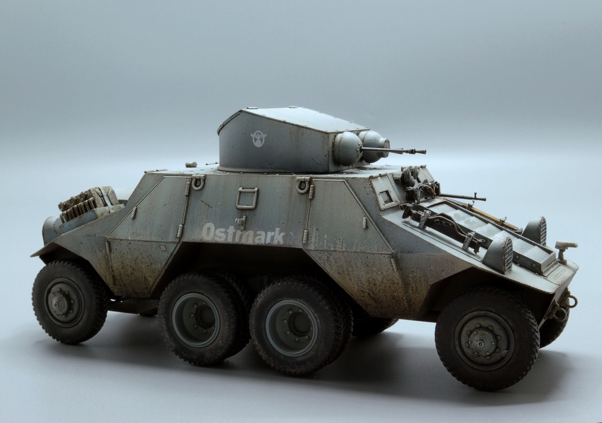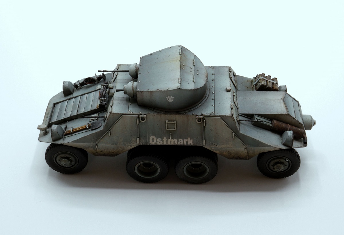 Красивые переходы грязи в запыление. Правда, при этом не понравилась излишняя чистота колёс. Ещё отметил что между ПТР и пулемётом закрашено окошко - там стоило имитировать тёмное стекло.