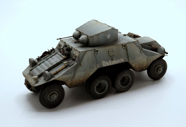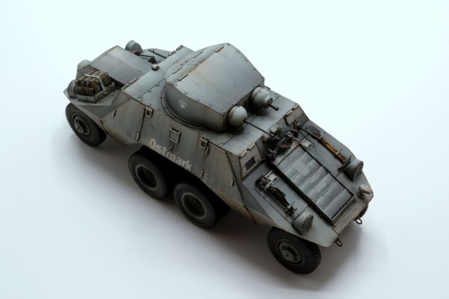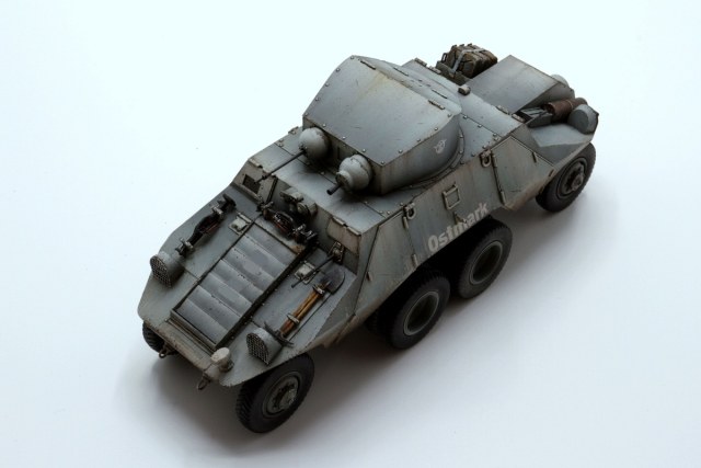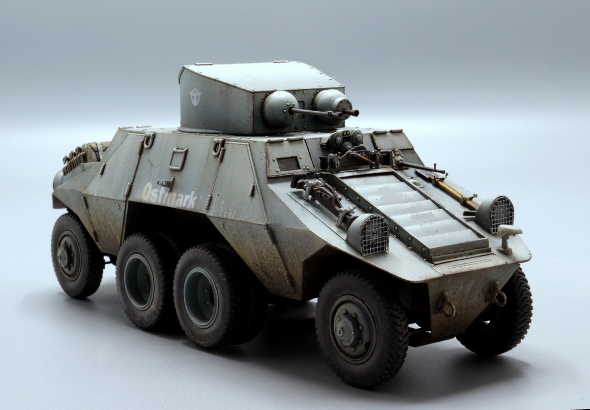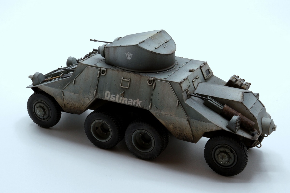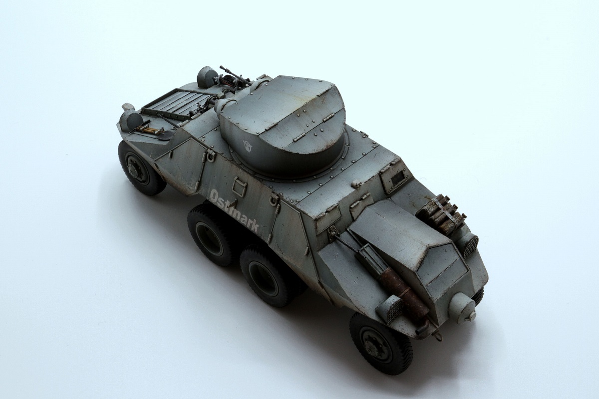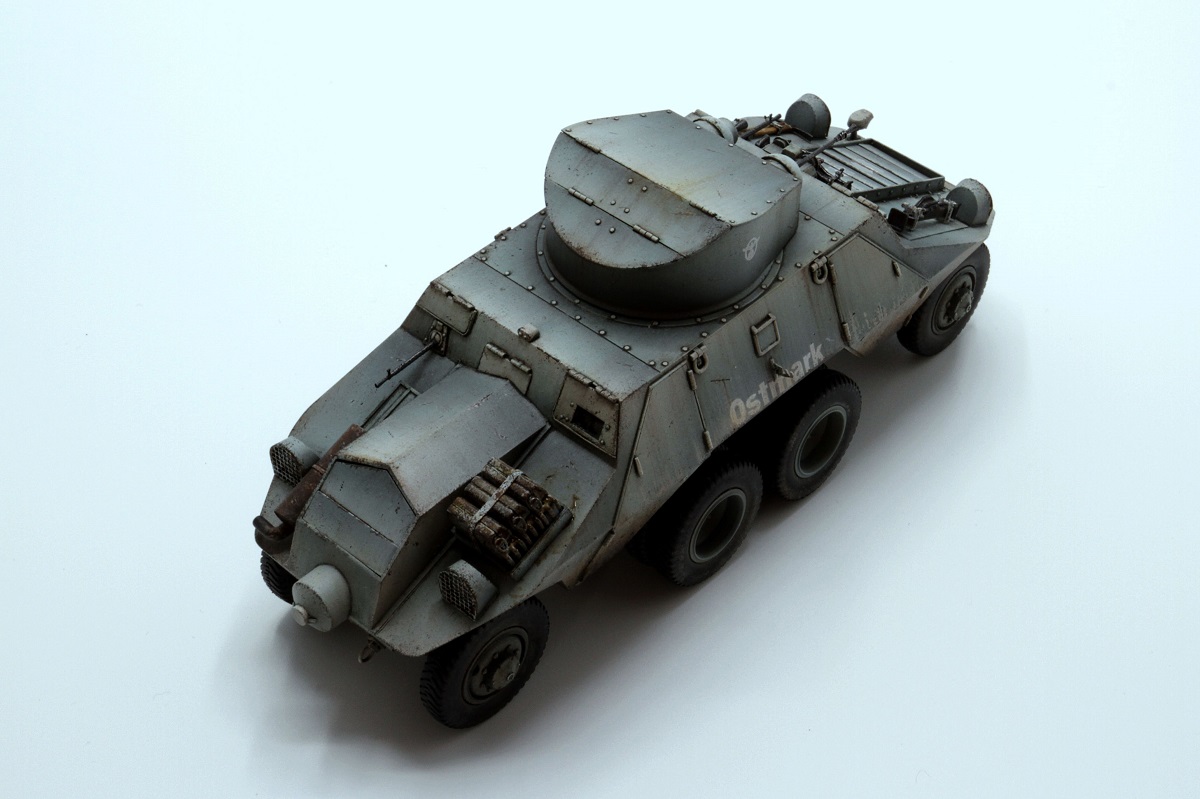 Красивые переходы грязи в запыление. Правда, при этом не понравилась излишняя чистота колёс. Ещё отметил что между ПТР и пулемётом закрашено окошко - там стоило имитировать тёмное стекло.
