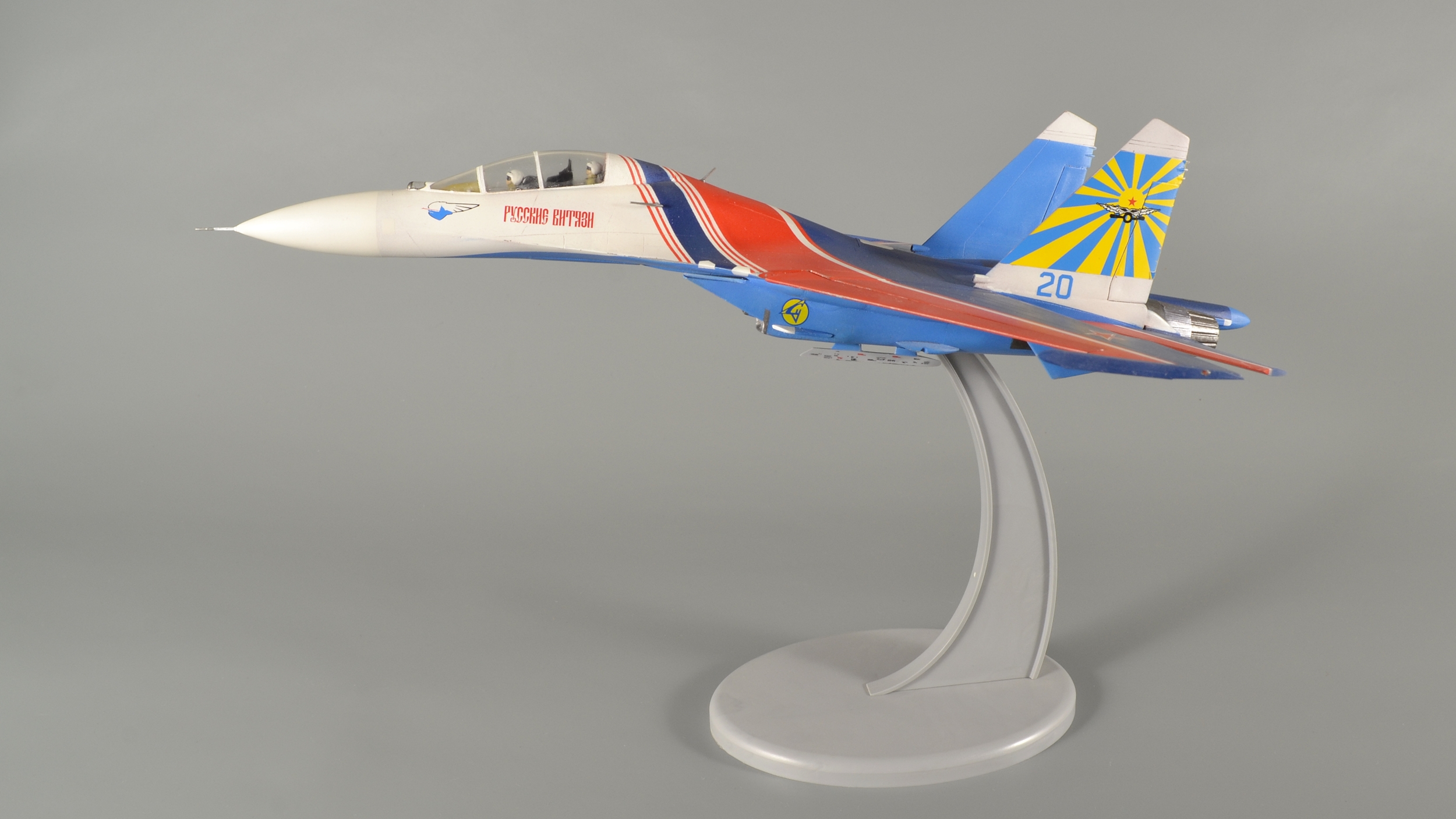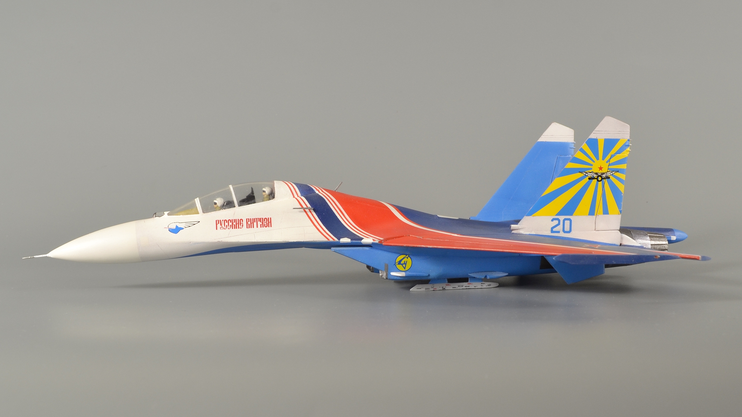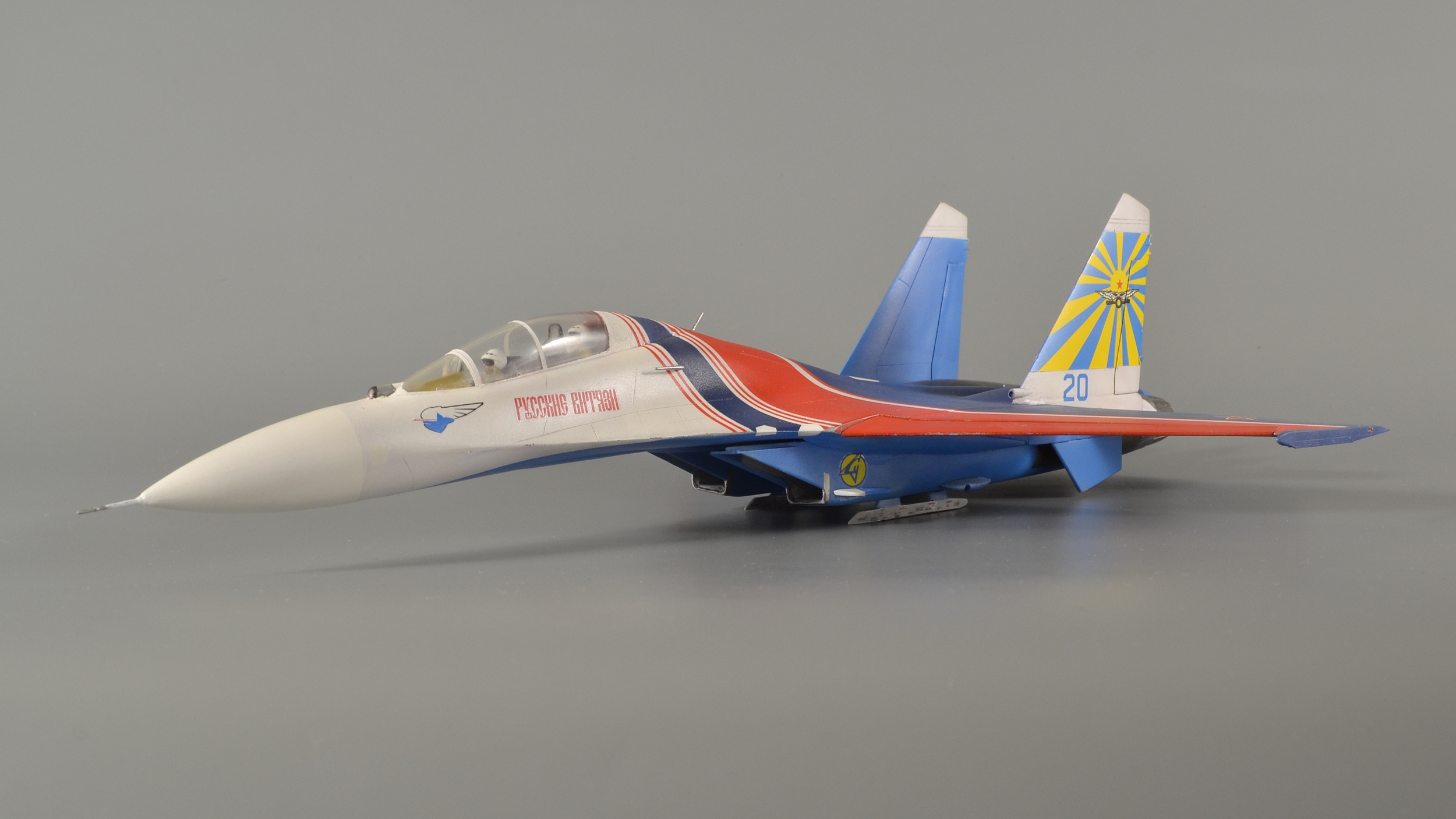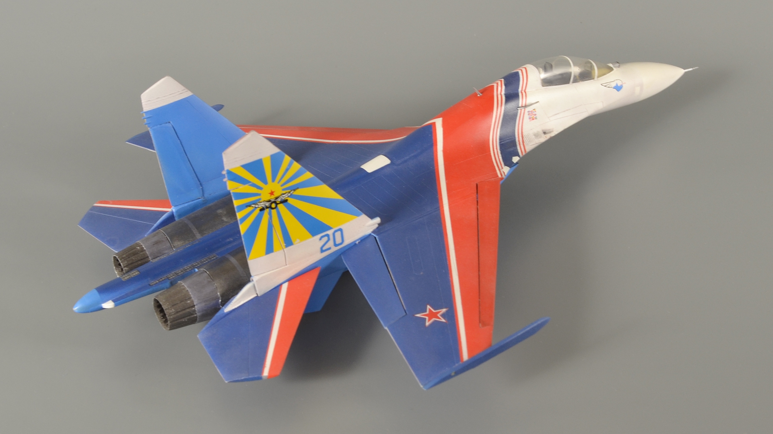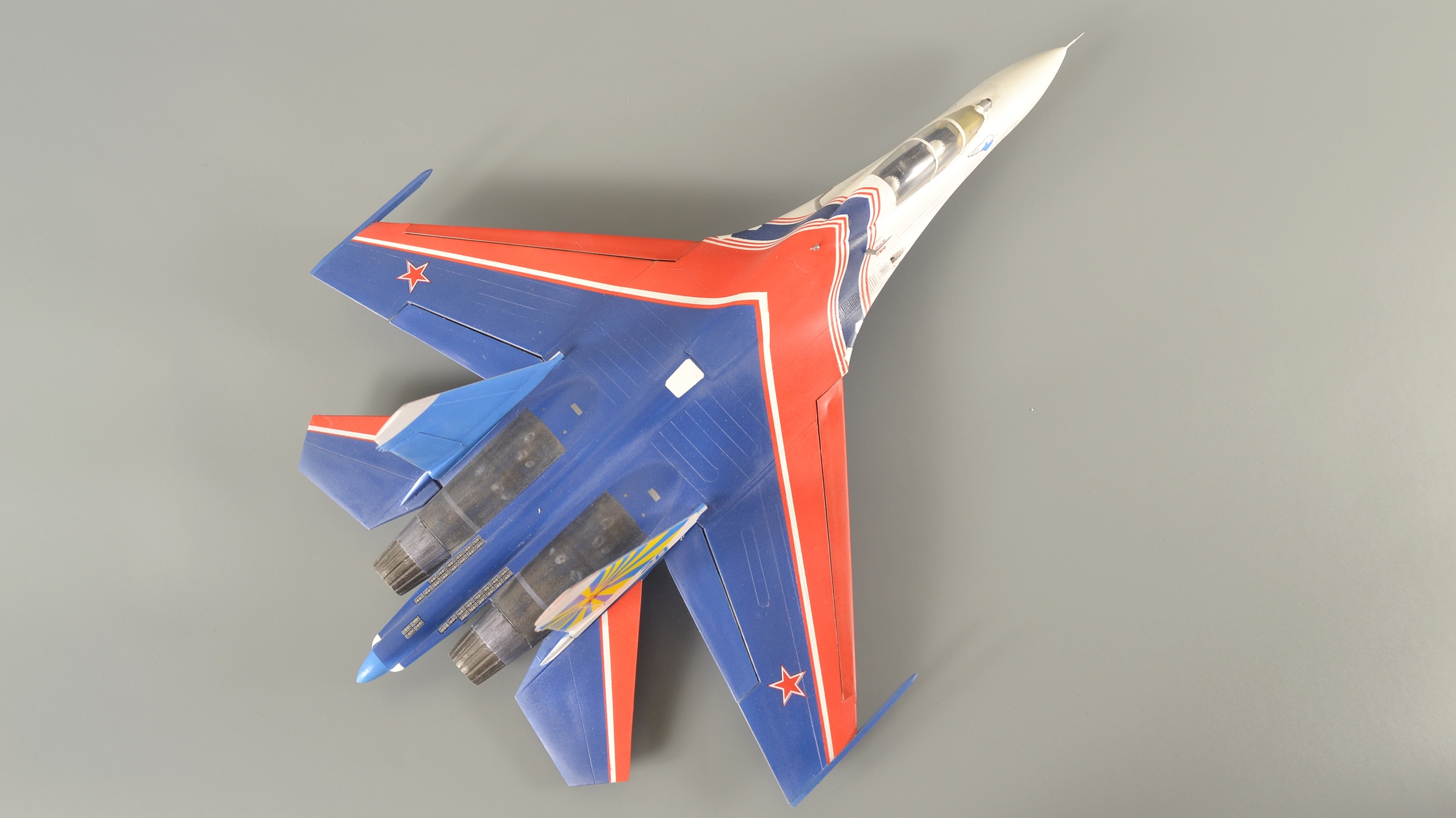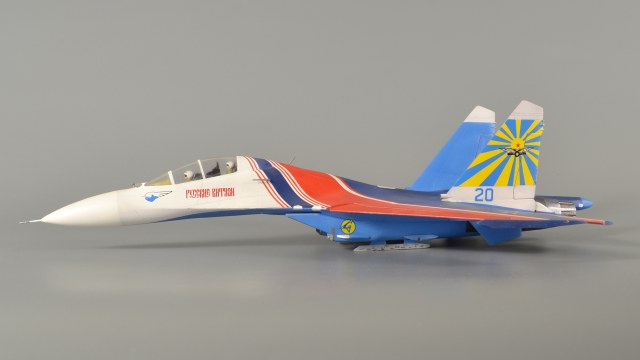 ...Продолжаю. В этот раз тема пилотажных групп. Январь 2019 года. В пару к Су-27 собрал еще и УБ-шку. Насчет матчасти даже не заморачивался, решил, что аккуратной покраски будет вполне достаточно. Красил традиционно Pacific-88, полосы накрашивал - декали клеить не рискнул. Собрал полетный вариант - давно подумывал, чтобы попроще и не возиться с шасси...