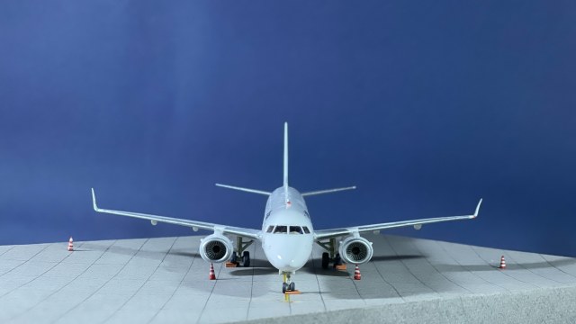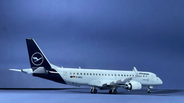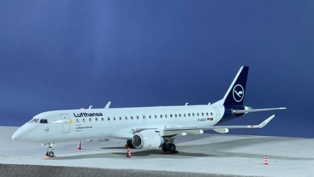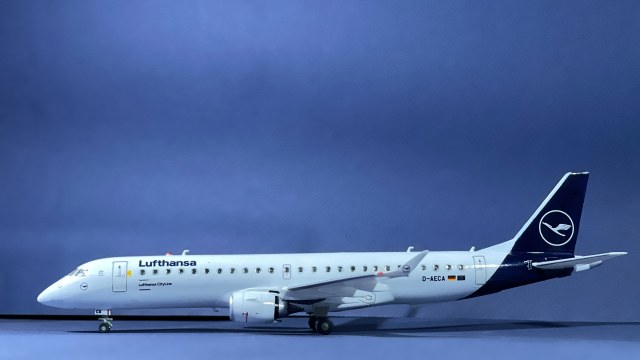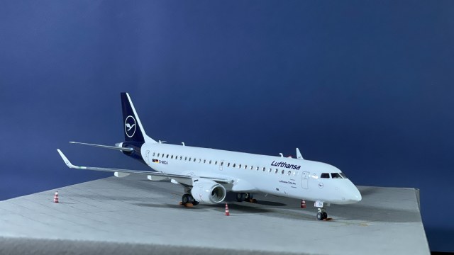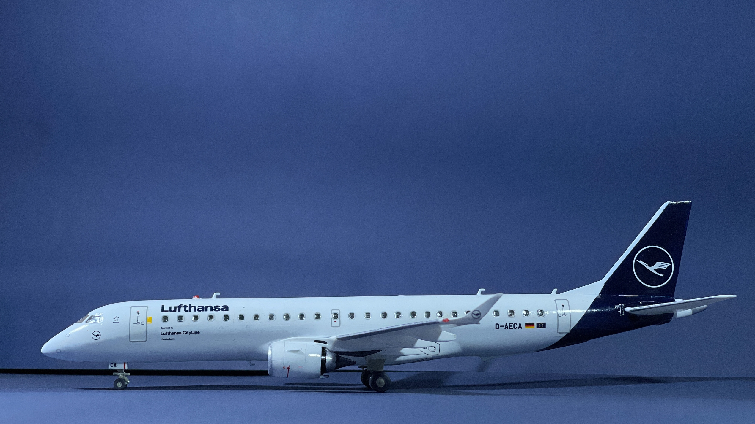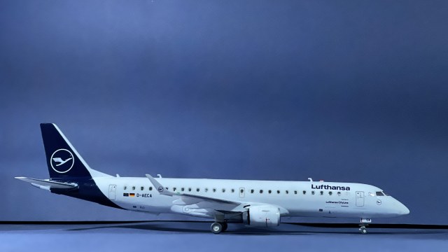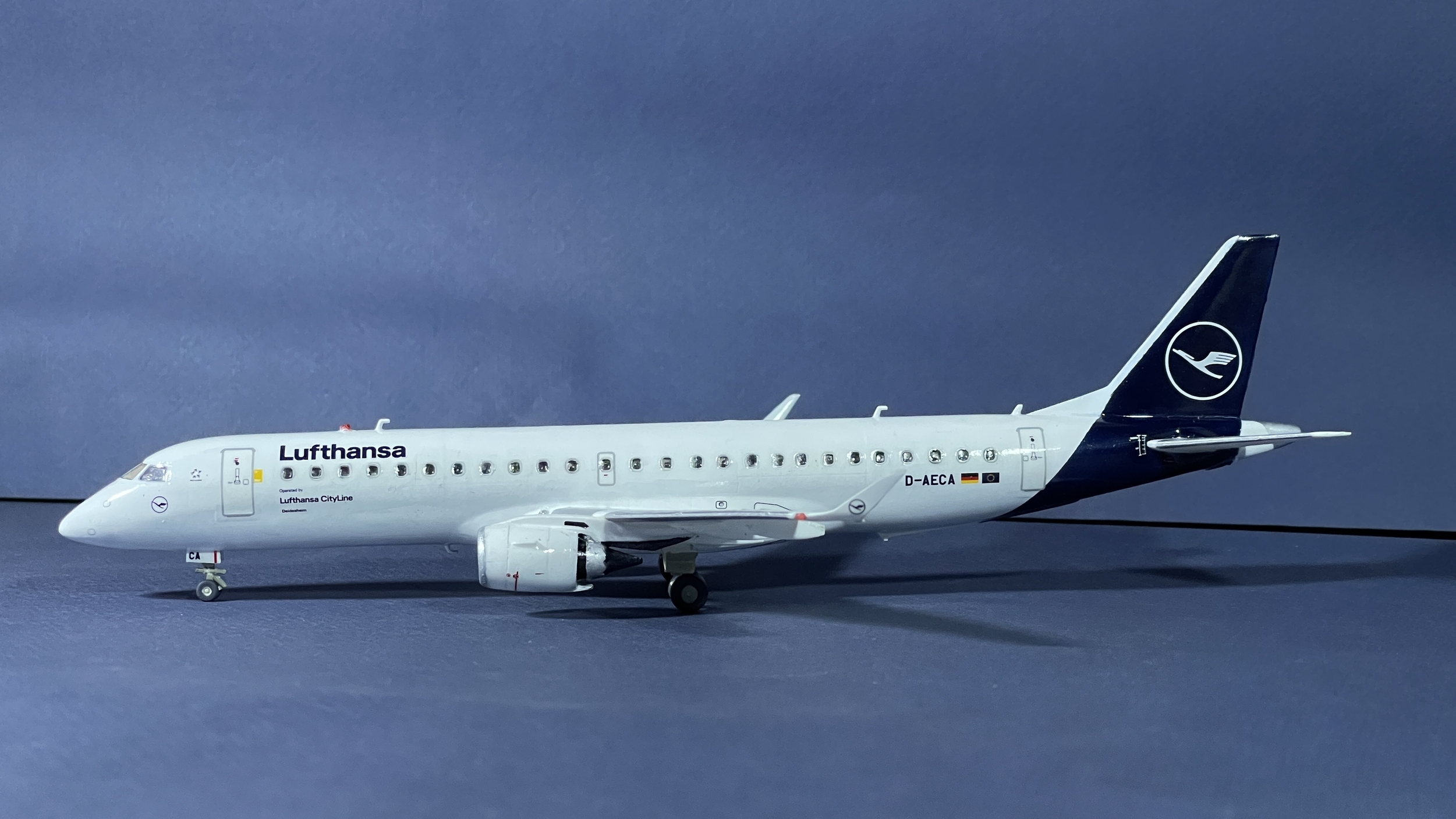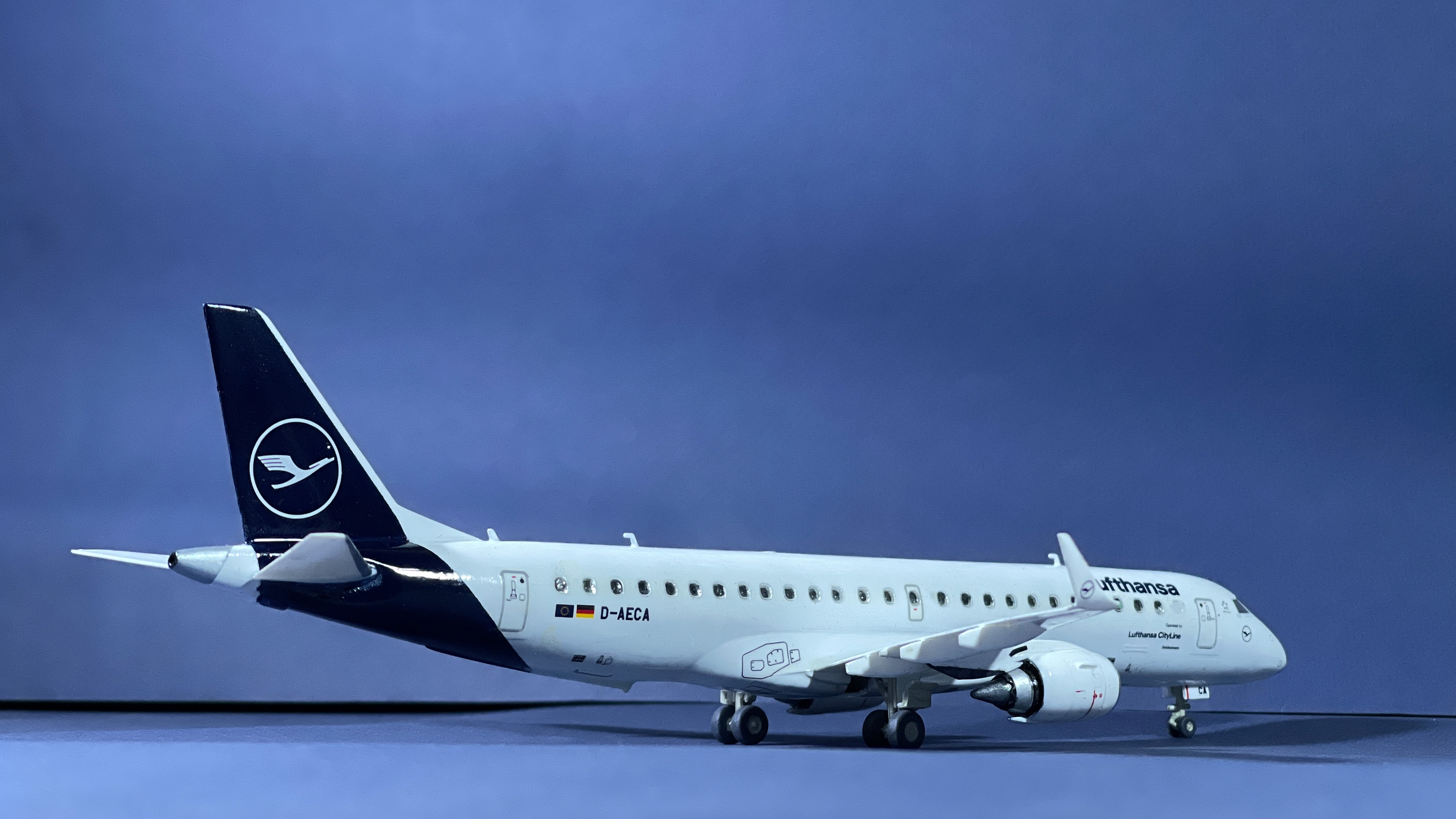В общем такой вот получился самолёт. В процессе казалось что результат выйдет хуже, а когда покрутил на столе — вроде симпатичный регионал вышел. Наверное дело в ливрее — та самая немецкая педантичность и выверенная аккуратность. Внешне ливрея вроде бы и скучная, но при том смотрится красиво и лаконично как на гигантах Б747 и А380, так и на небольшом Эмбраере.