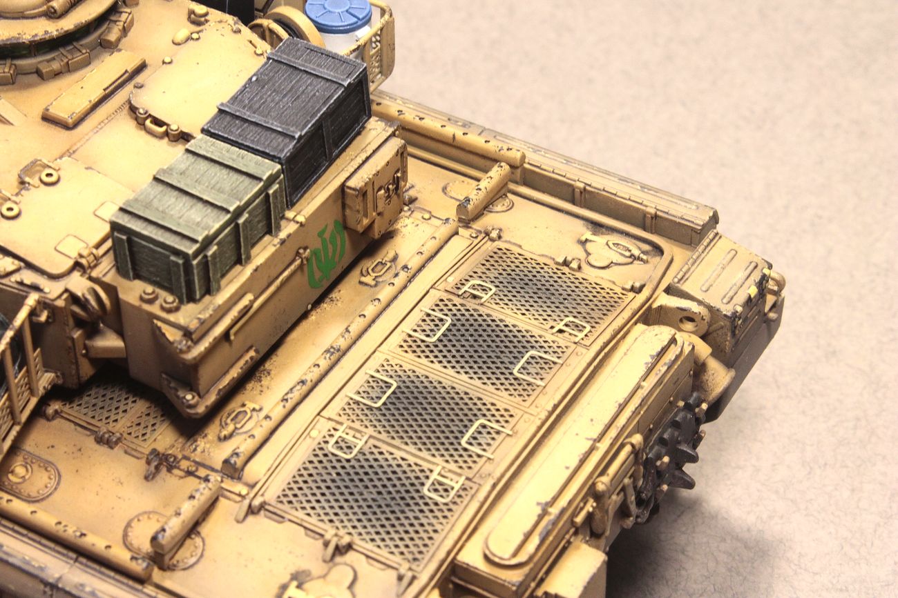 - ящики на месте дымовых гранатометов от PanzerArt. Как ни изучал единственное фото, где они имеются, не увидел никаких тросов, веревок и т.п. Вместе с тем, судя по фото посадочных мест для этих гранатометов, они крепятся болтами. Значит, ими же, либо сваркой, можно закрепить и ящики;