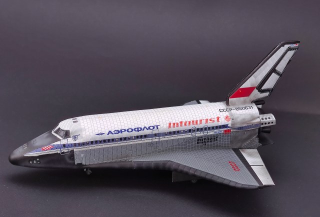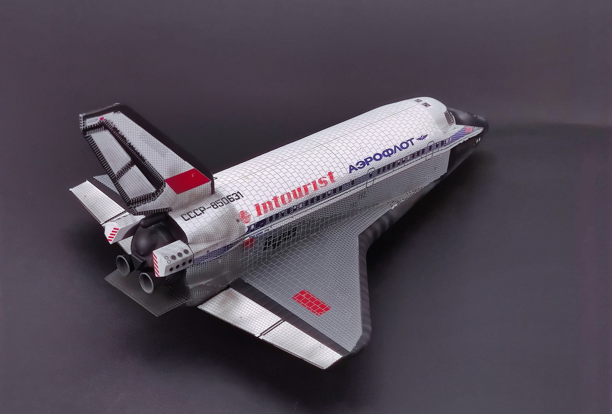 Ещё одна модель "Бурана" от ARK в 1:144. У меня было 2.5 комплектов пластика этой модели, поэтому решил собрать второй экземпляр, чтобы пластик не оставался валяться на полке. Так как повторяться с реально летавшим экземпляром не хотелось, на выбор была или окраска ВВС (она требовала заказа декали с надписью "Буря" и другого по мелочи), или 100% фантастическая окраска "Аэрофлота" с иллюминаторами. Делать прототип для атмосферных полётов не стал. Ушло много сил на вышкуривание планера и нанесение декалей, модель не из простых и не из приятных. Не всё получилось идеально. На нижней части планера декаль была подкрашена, чтобы погасить яркие квадратики термоплитки, на верхней с помощью акварельных карандашей нанёс следы температурного воздействия. Попачкал планер аналогично первому "Бурану", но не так сильно.