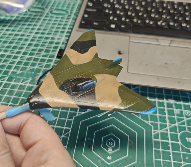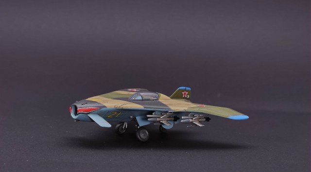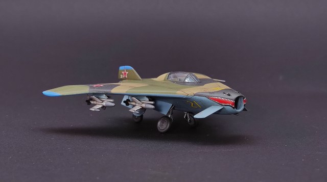 Окрасил модель в трёхцветную схему окраски а-ля Ту-2 или Ил-2. Знаю, что послевоенная реактивная авиация была светло-серой, однако у этого самолёта большая площадь в вертикальной проекции, и с воздуха светло-серую "стрелку" было бы очень хорошо видно. Декали из запасов. Пачкал умеренно.