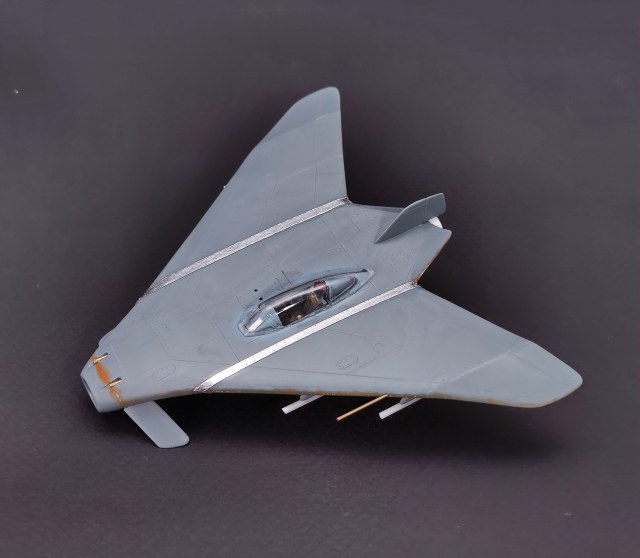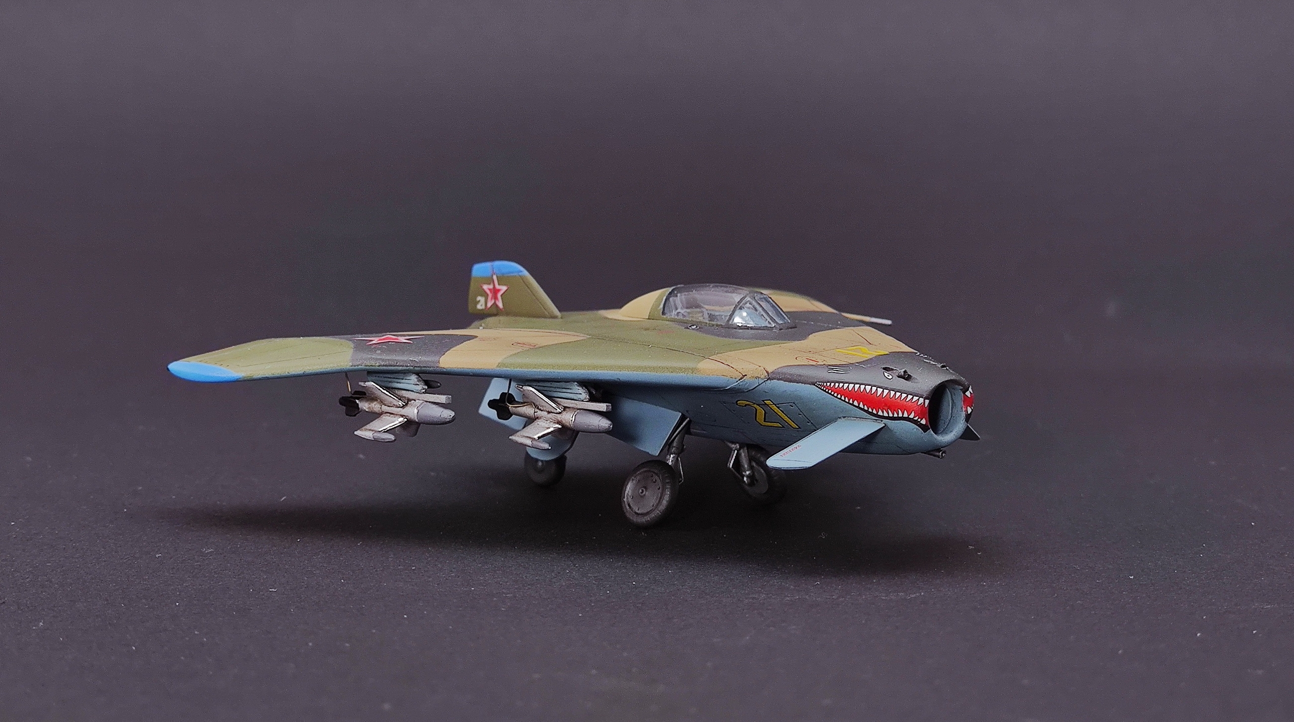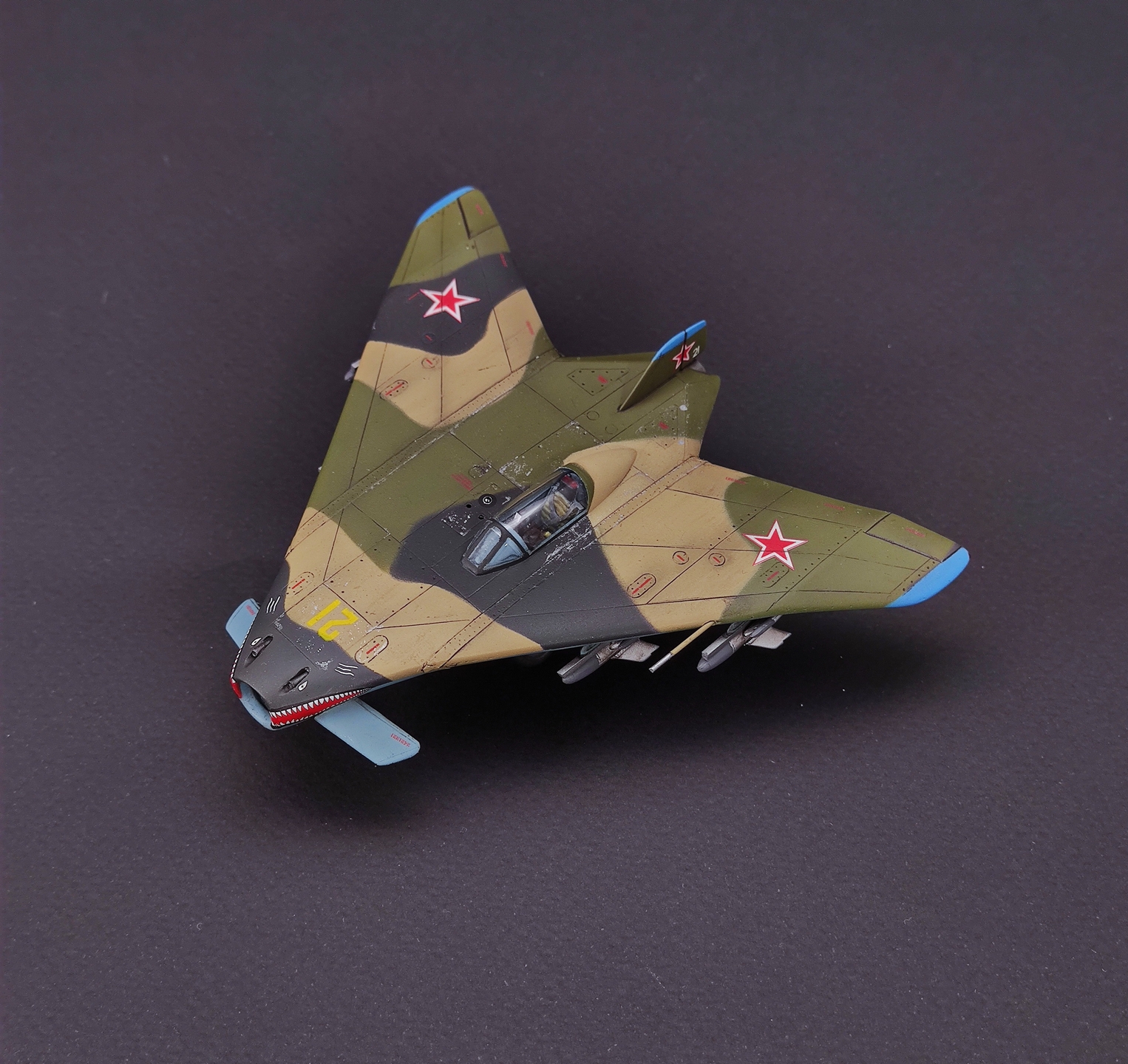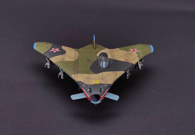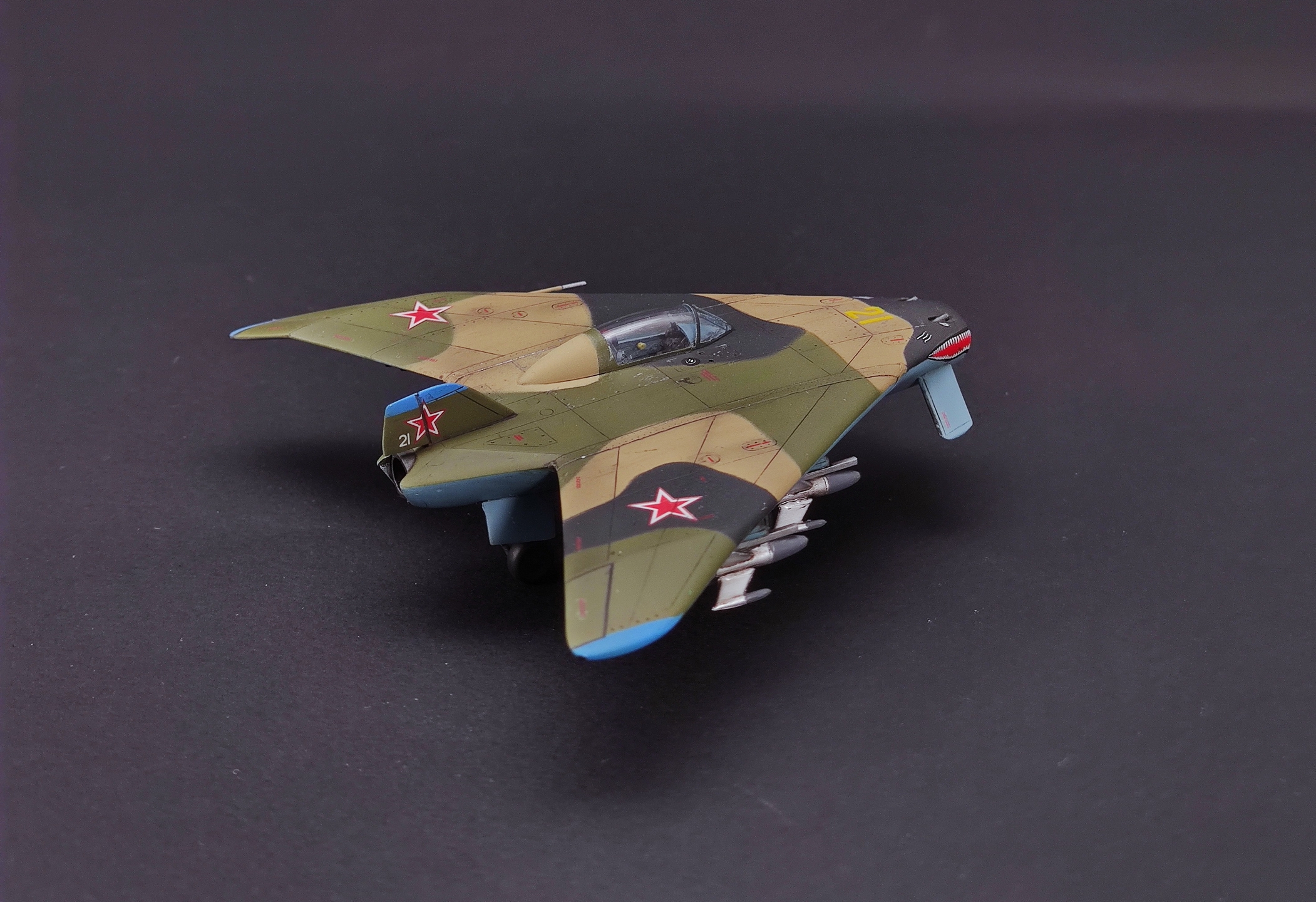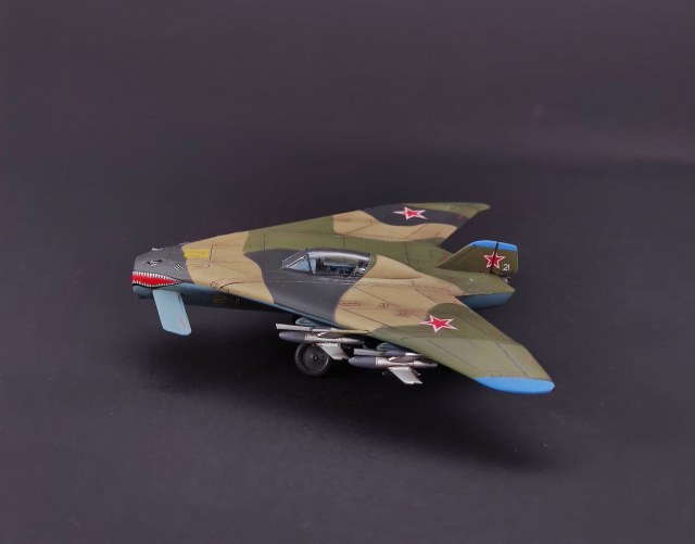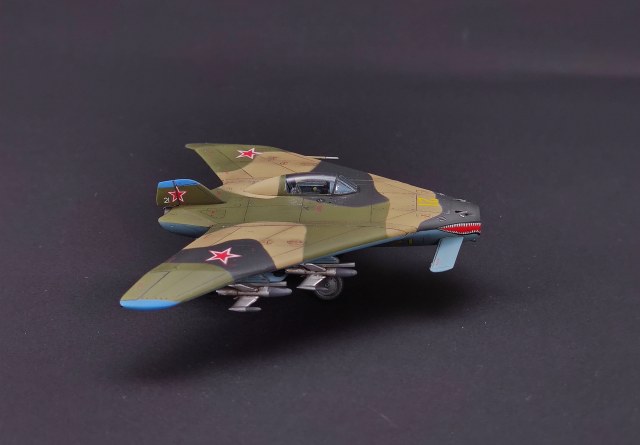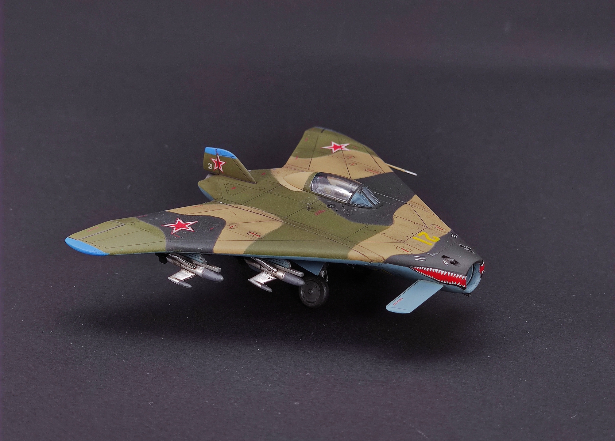 Модель - типичное ЛНД от этого производителя, прототип - люфт-46-самолёт, который не воплощался даже в стадии макета. Честно говоря, не уверен, что такой проект вообще существовал, вполне может быть, его придумали уже после войны. Так как самолёт не был построен и все варианты окраски для него фантастические, решил окрасить его как самолёт ВВС РККА. Как известно, после войны в СССР захваченные немецкие учёные продолжали доводку нескольких проектов в рамках передачи опыта советским конструкторам. Допустим, работы над этим самолётом были завершены в СССР, после чего он был пущен в малую серию как временное переходное решение от поршневых истребителей к отечественным реактивным. 3 30-мм-пушки и 4 ракеты "Руршталь Х-4" могли бы сделать этот самолёт неплохим перехватчиком маломаневренных целей типа бомбардировщиков, а для СССР после войны это было очень актуально. Таким образом, гештальт сходится :)