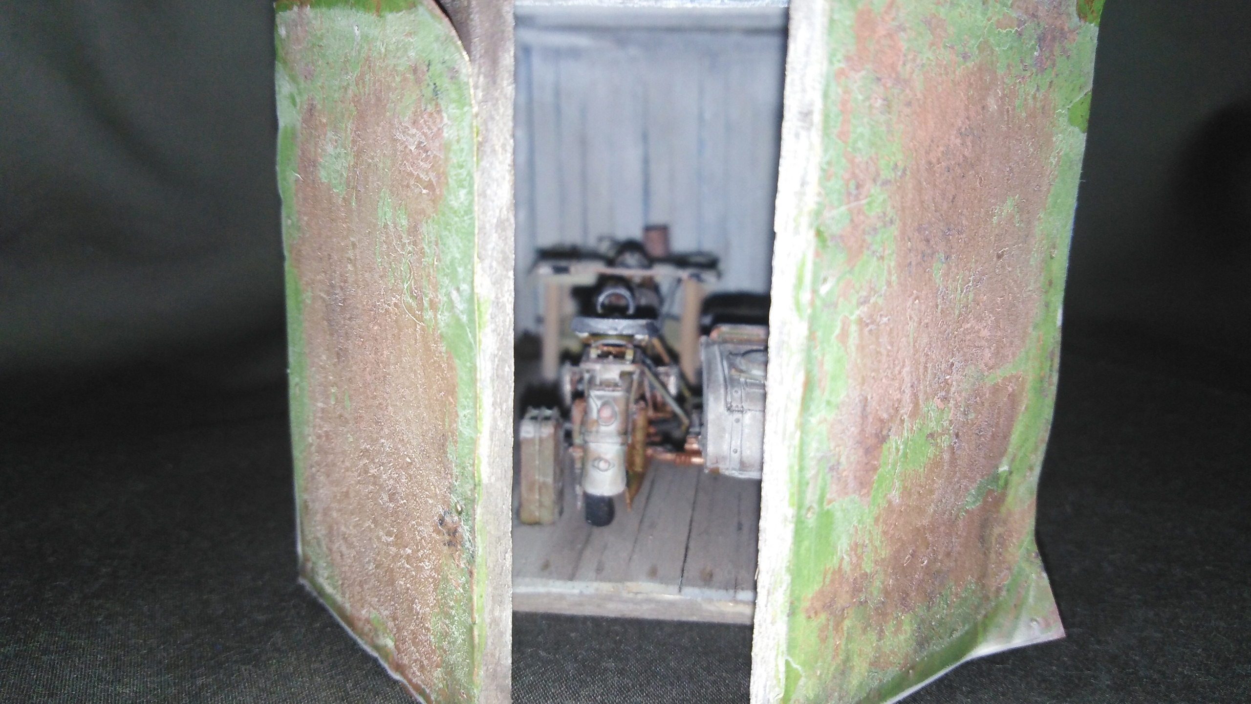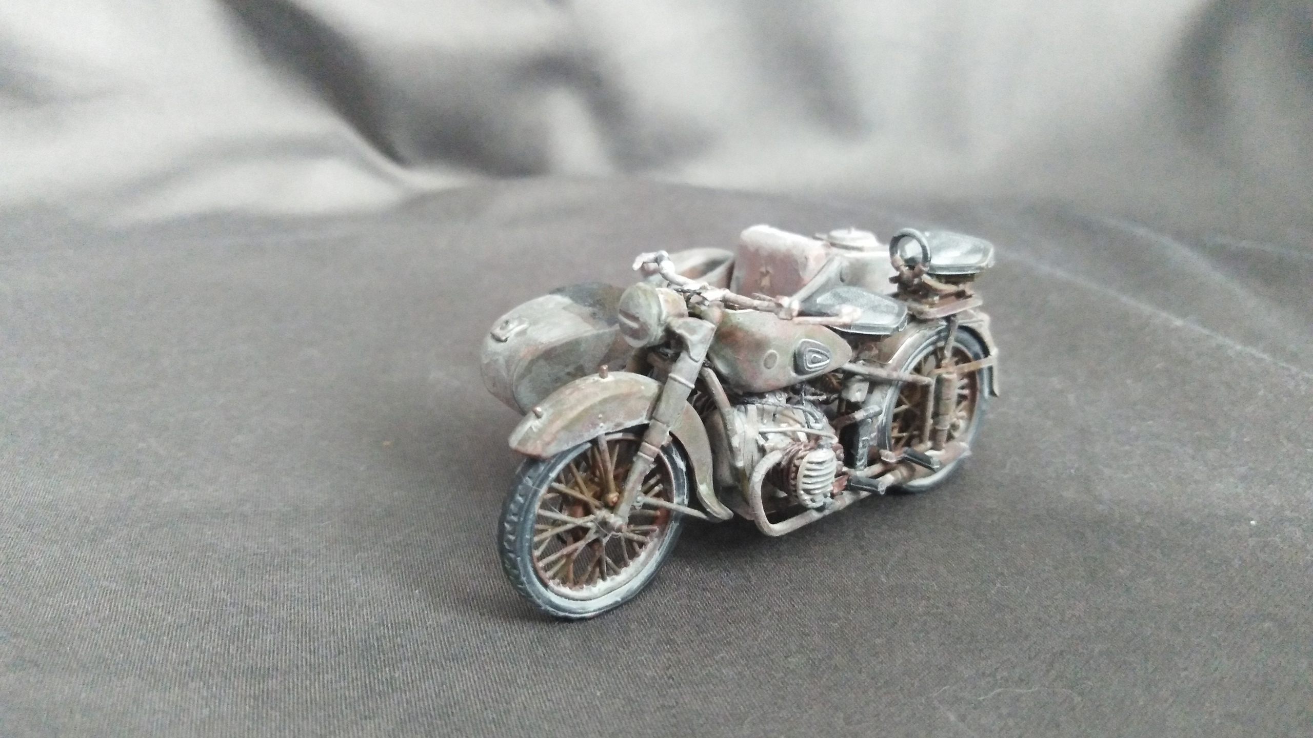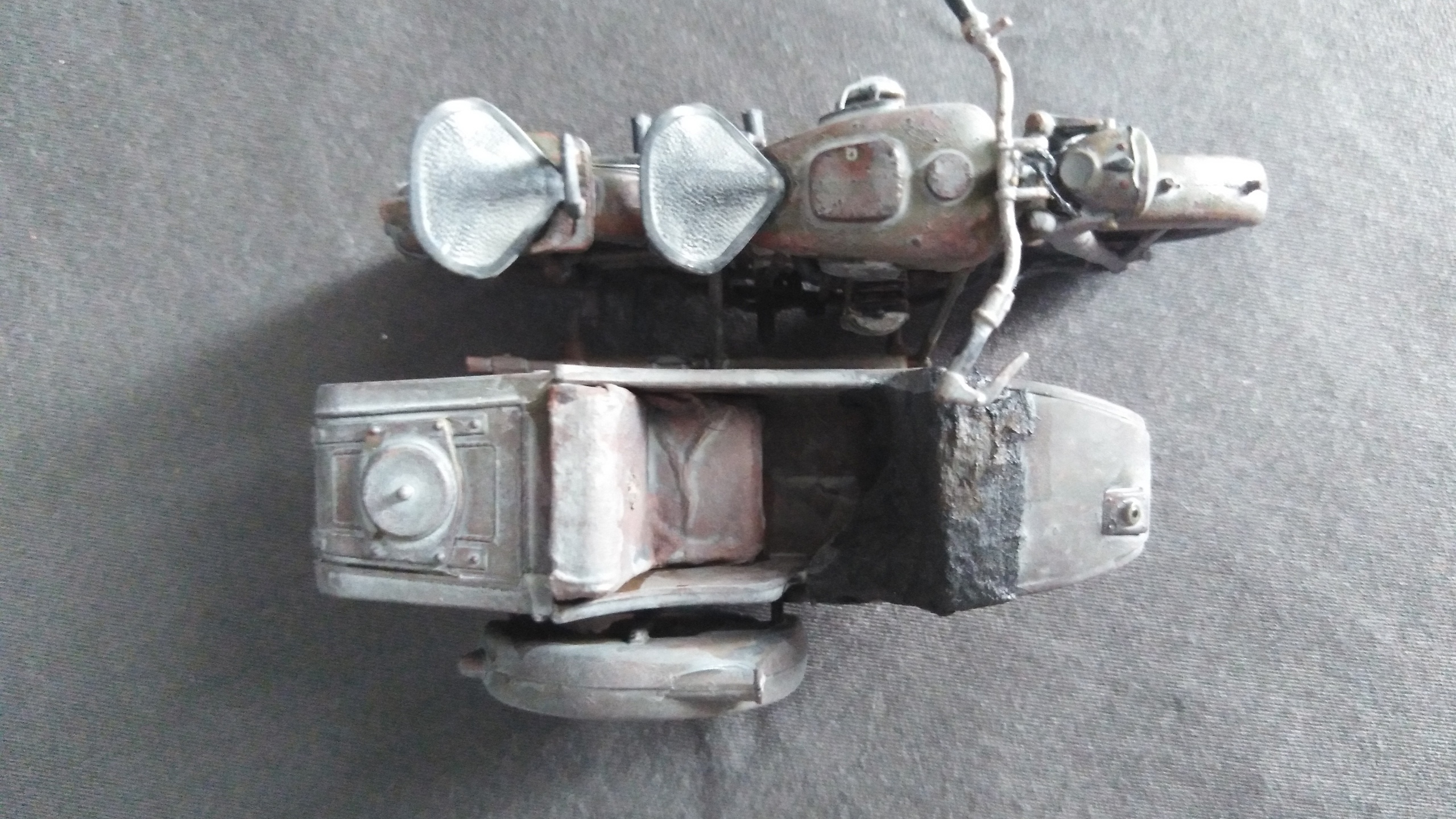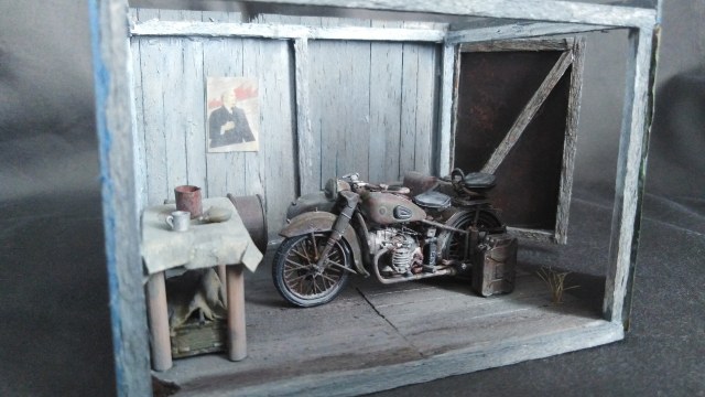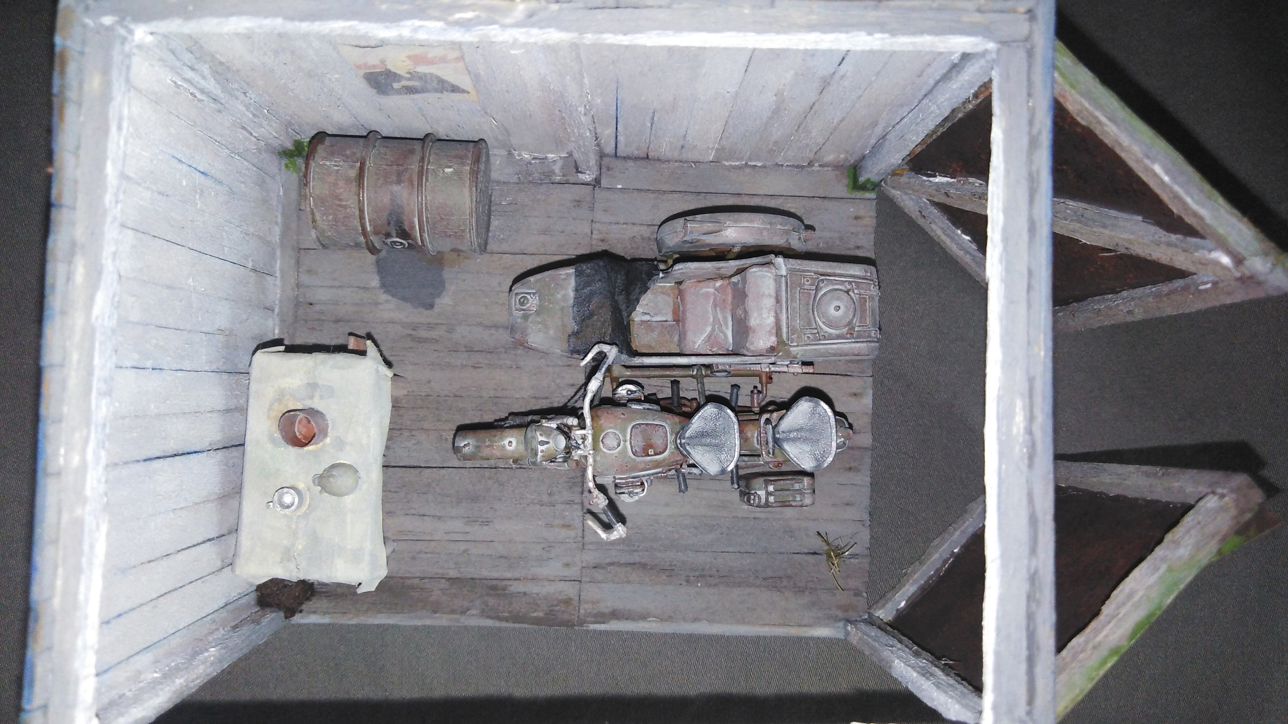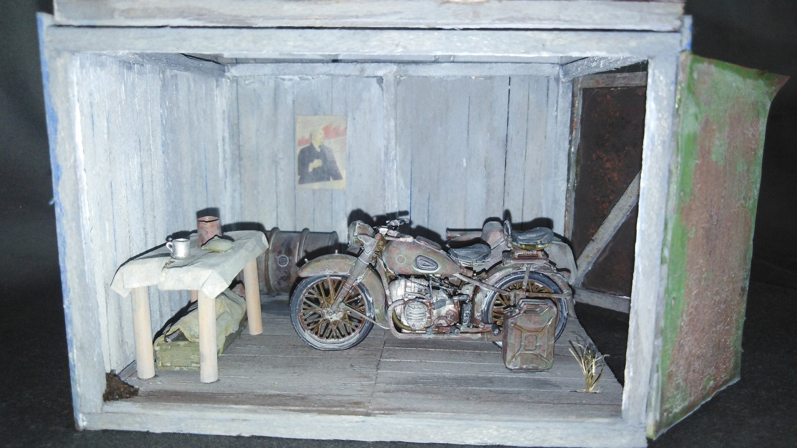 Мотоцикл М-72 от Звезды. Добавил тросики, патрубки, брезент на люльку и обшивку сидения. Канистра, бочка, ящик из старых запасов. Сарайка из каминных спичек, бальзы и пивжести. Красил тамией и звездой.