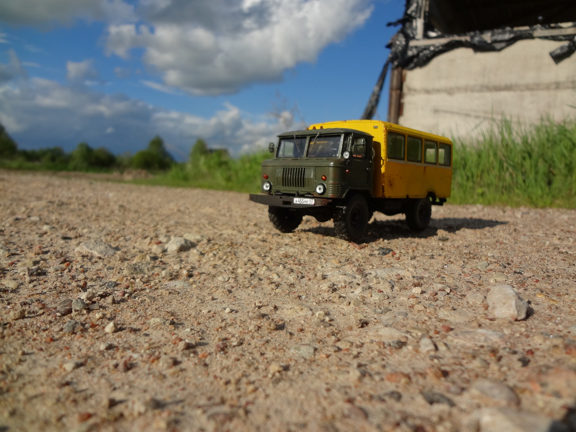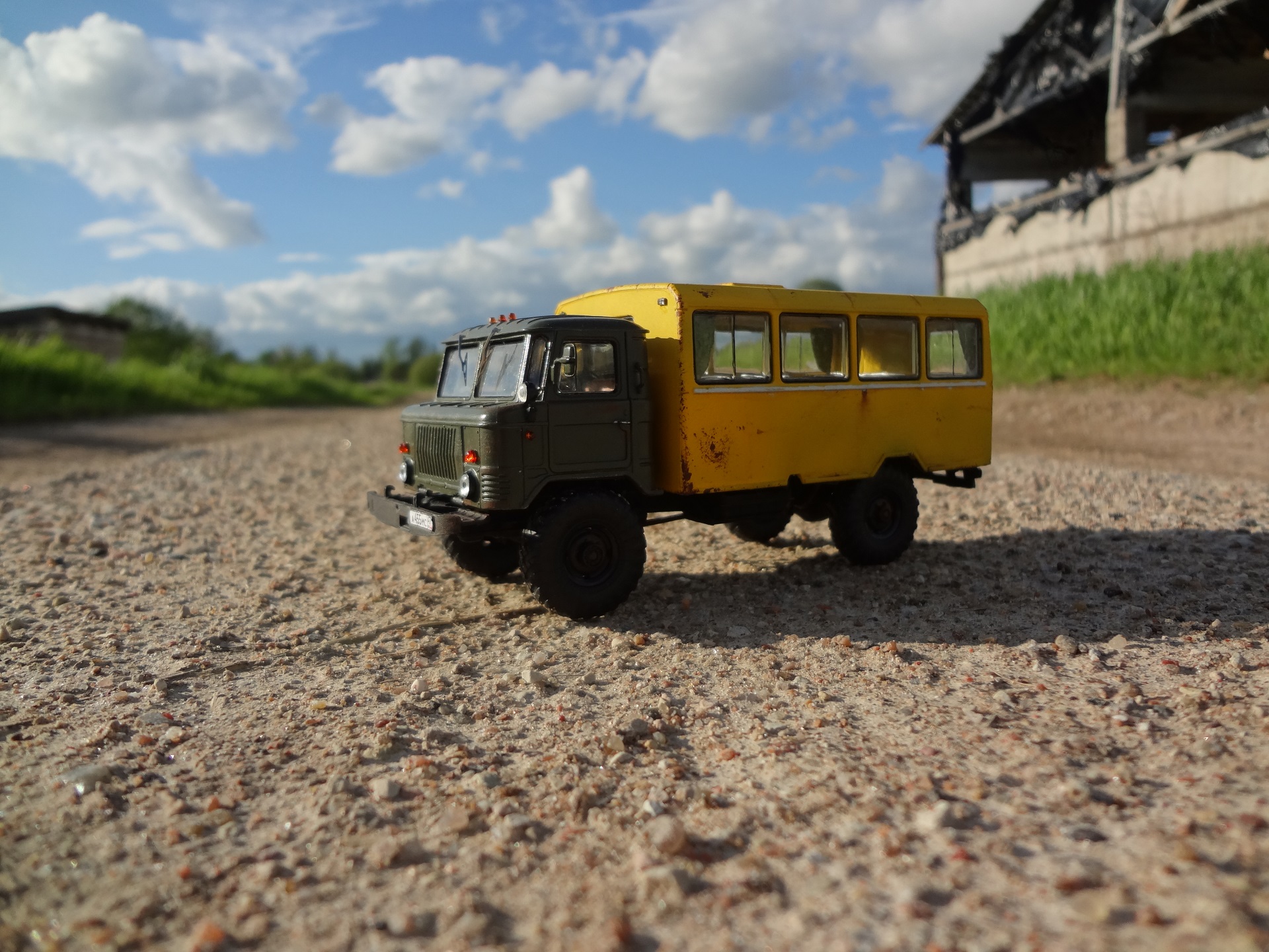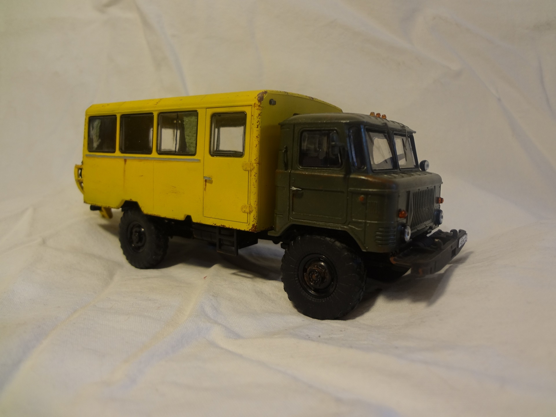 Всем доброго времени суток. После пары лет созерцания разных шедевров, которые здесь публикуют мастера-моделисты, решился и я показать свои скромные, пока что малодостойные труды. Третья моя модель от всем известного AVD - вахтовка на базе шестьдесят шестого Газа. Попытался сделать авто уставшим, этакий грузовичок, находящийся в активной эксплуатации. Собирал без доработок. Окраска из аэрографа, краски - Tamiya и Звезда, немного Pacific88. Сборка доставила удовольствие, всё просто и понятно. Из самых ярких косяков - стёкла будки. Никогда со стёклами не лажал, а тут получилась целая трагикомедия. Собственно на этом и всё что могу сказать. Приятного просмотра.